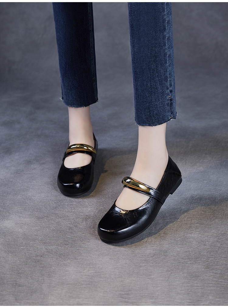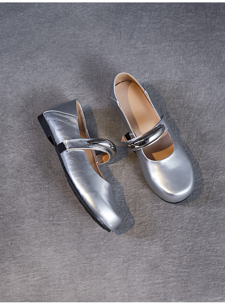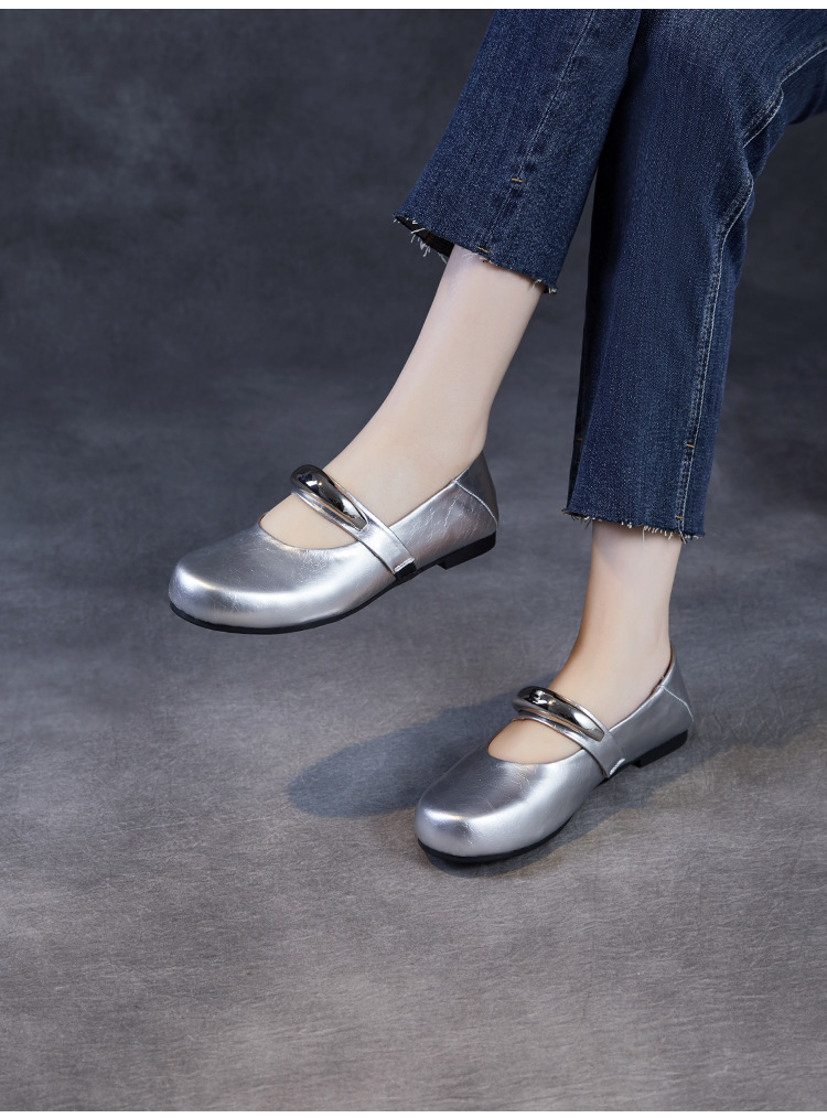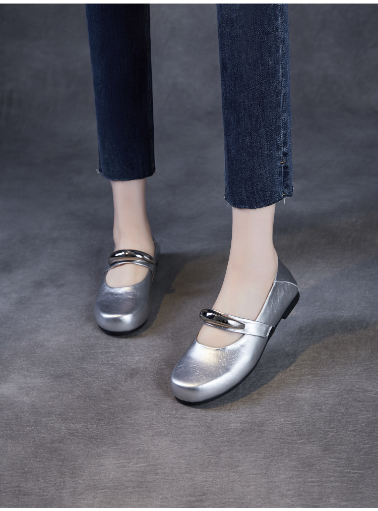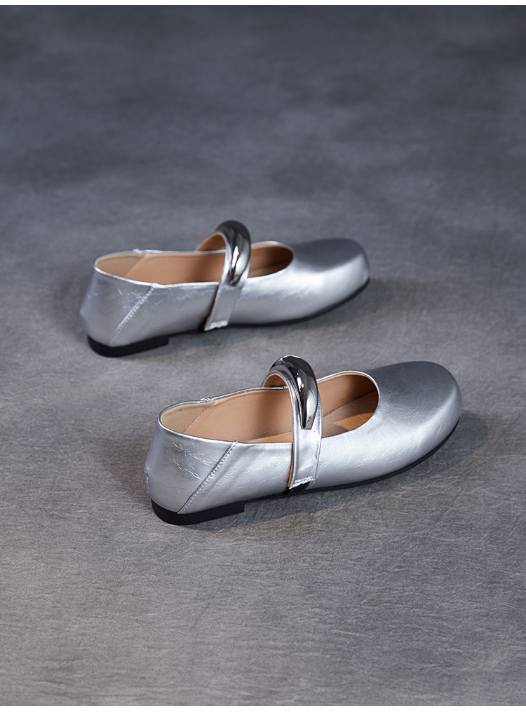 소 가죽 플랫 힐의 첫 번째 레이어 Mary Jane 신발 여성의 2025 새 봄과 여름 얕은 부드러운 바닥 실버 신발 여성 신발