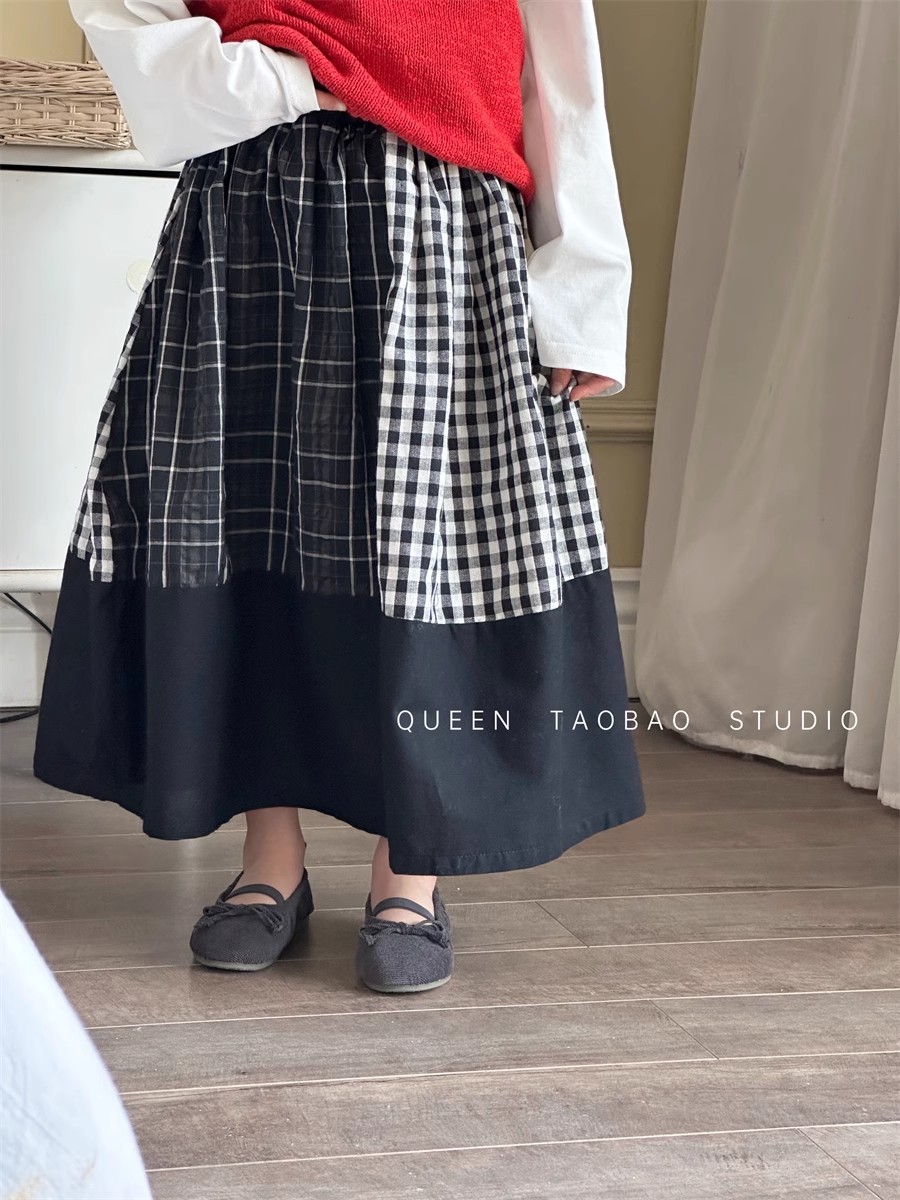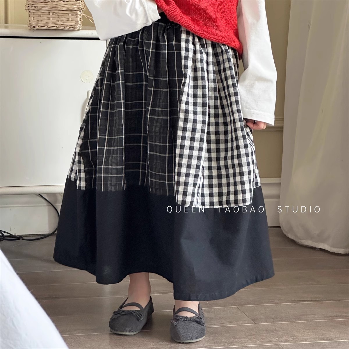 어린이 치마 2025 봄과 여름 한국 스타일 소녀 모리 스타일 바느질 격자 무늬 스커트 어린이 엘프 허리 중간 길이 스커트스토어 가기