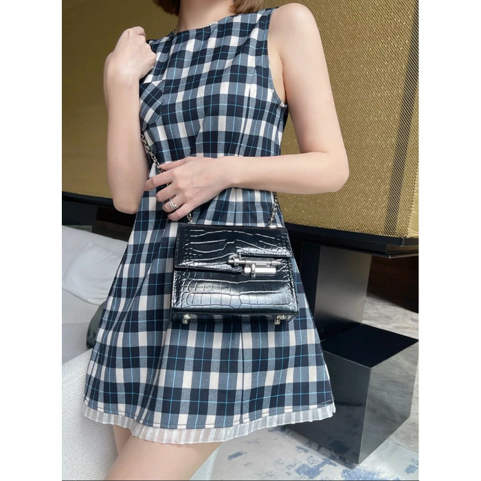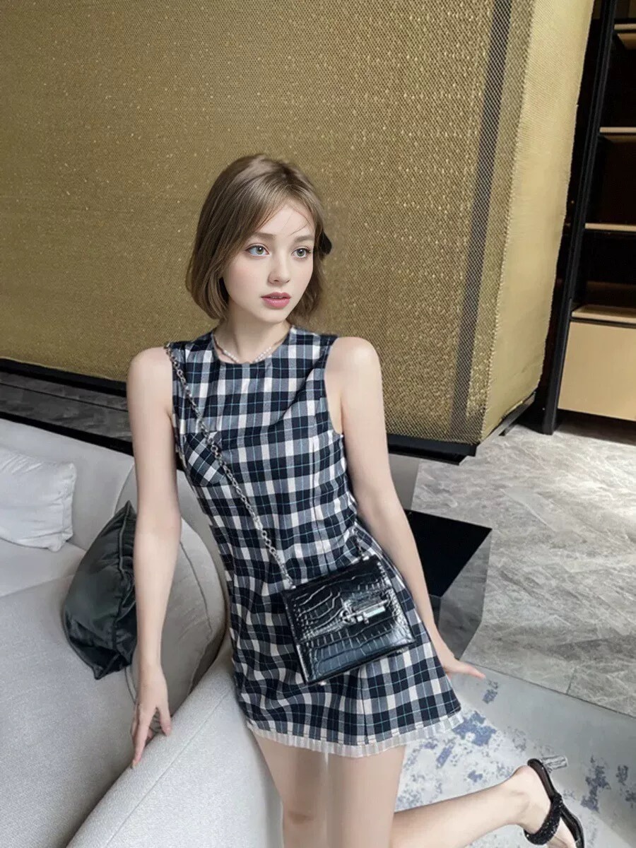 빈티지 격자 무늬 조끼 원피스 여성 여름 프랑스 디자인 센스 레이스 스티칭 웨이스트 슬리밍 A 라인 쇼트 스커트스토어 가기