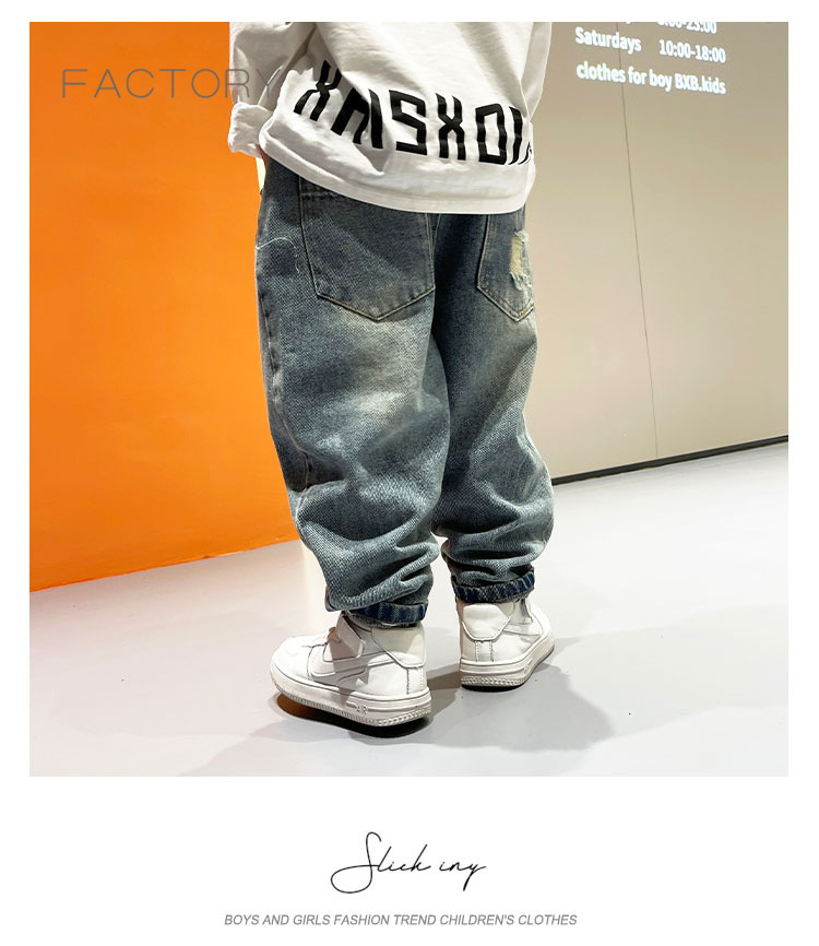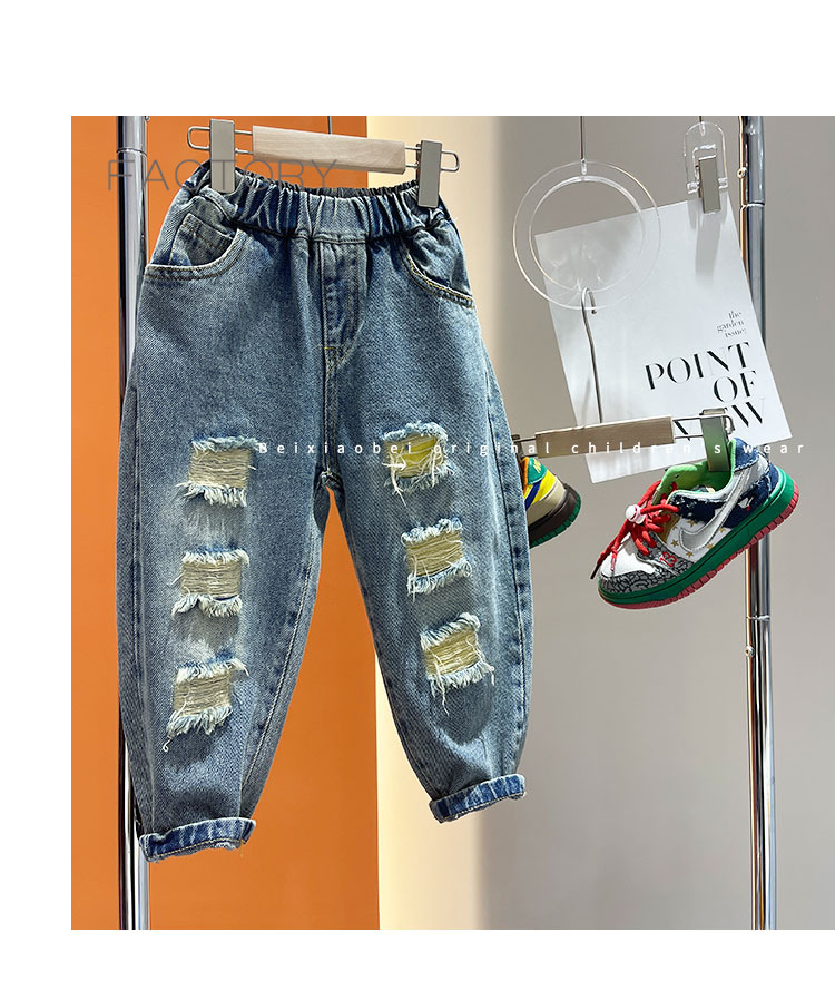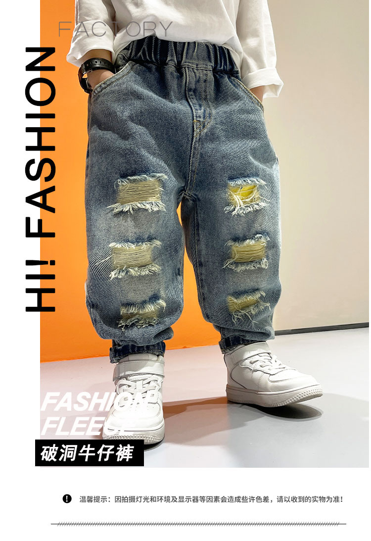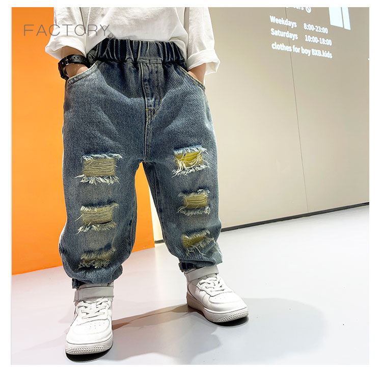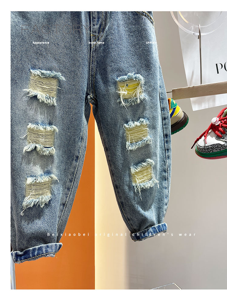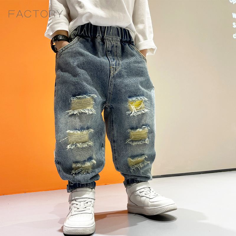 2025년 가을 남아용 데님 바지 새로운 스타일 아동용 트렌디하고 패셔너블한 찢어진 바지 아기의 멋진 루즈 팬츠 트렌디스토어 가기