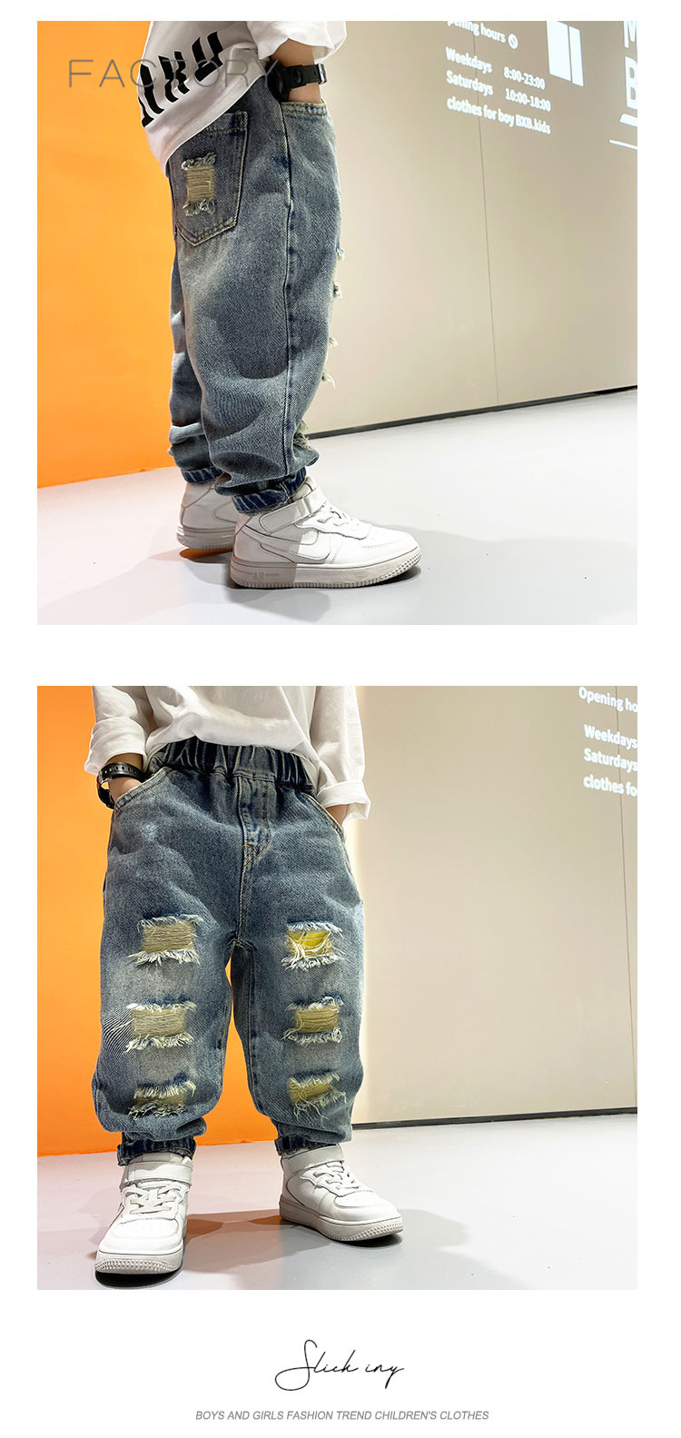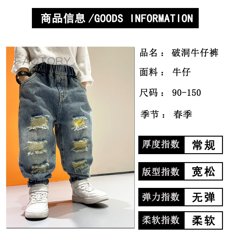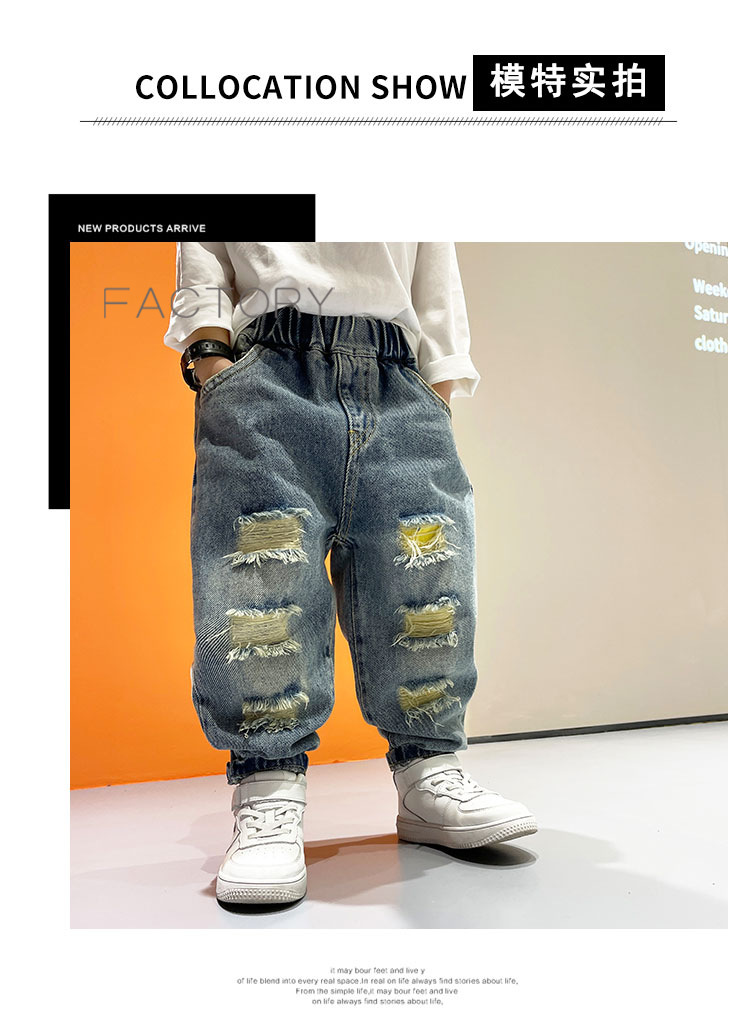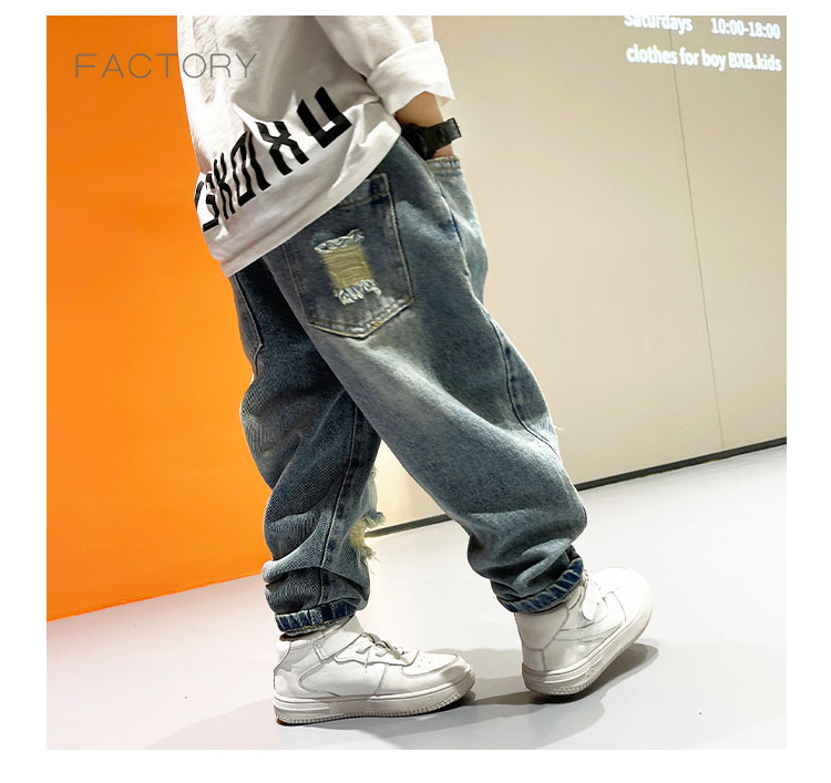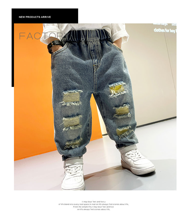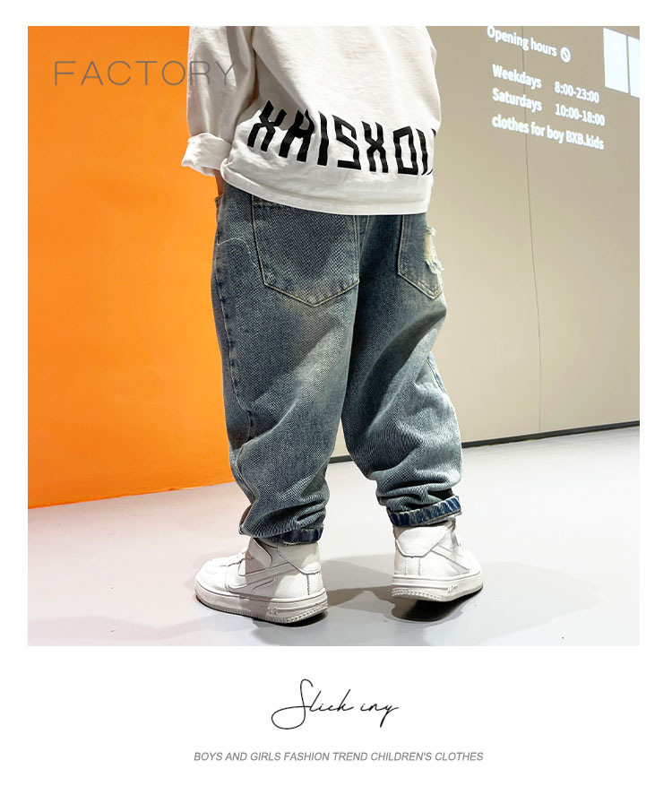 2025년 가을 남아용 데님 바지 새로운 스타일 아동용 트렌디하고 패셔너블한 찢어진 바지 아기의 멋진 루즈 팬츠 트렌디스토어 가기