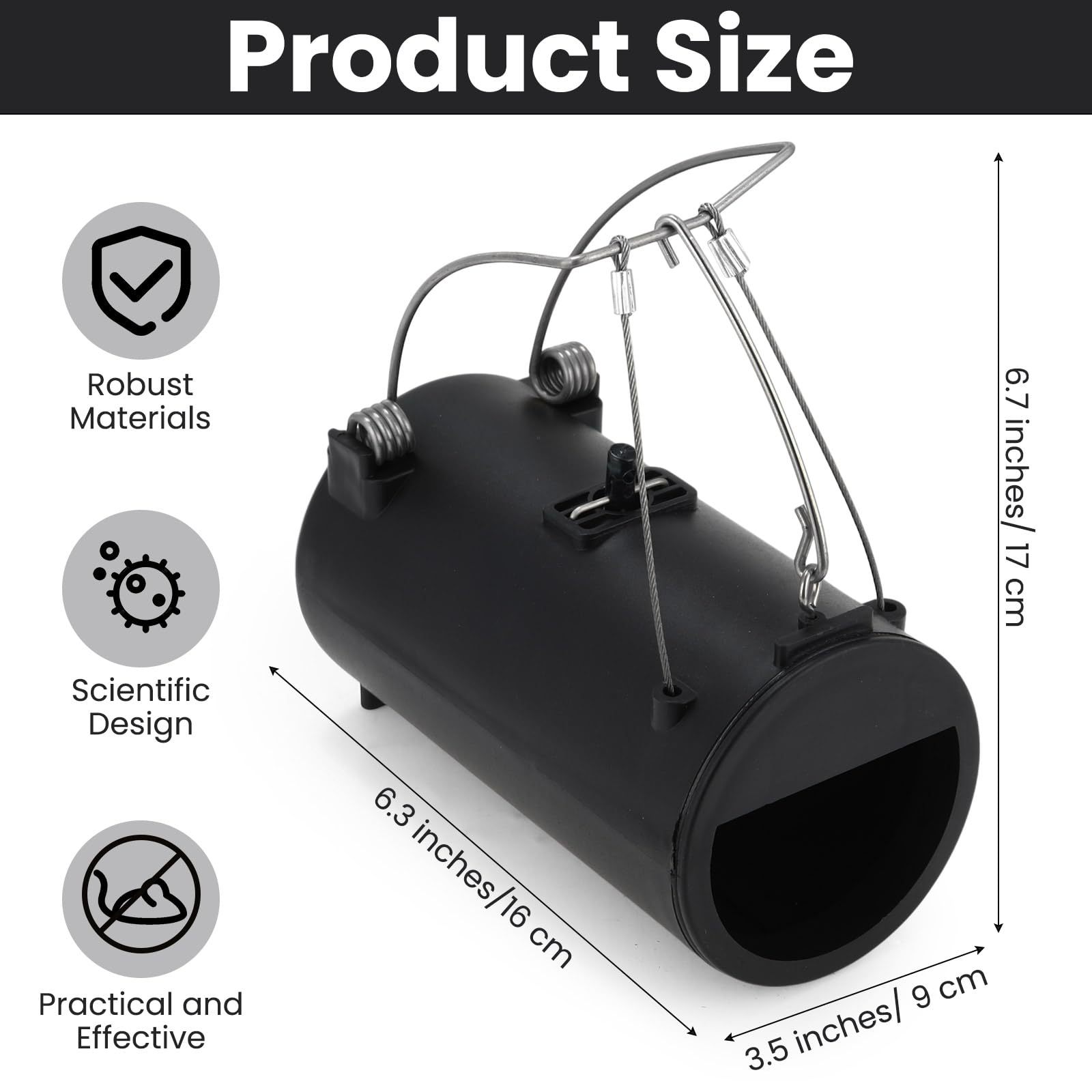 耐用且可重复使用的设计:黑色地鼠陷阱坚固耐用,可长期为您服务;它具有足够大且宽敞的内置管,可有效捕获地鼠;捕获地鼠后,您只需将其取出,清洁陷阱并重复使用以捕获其他地鼠