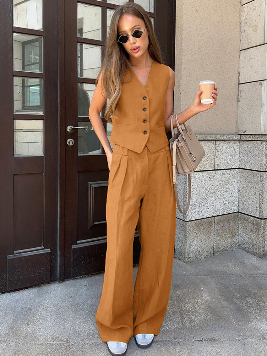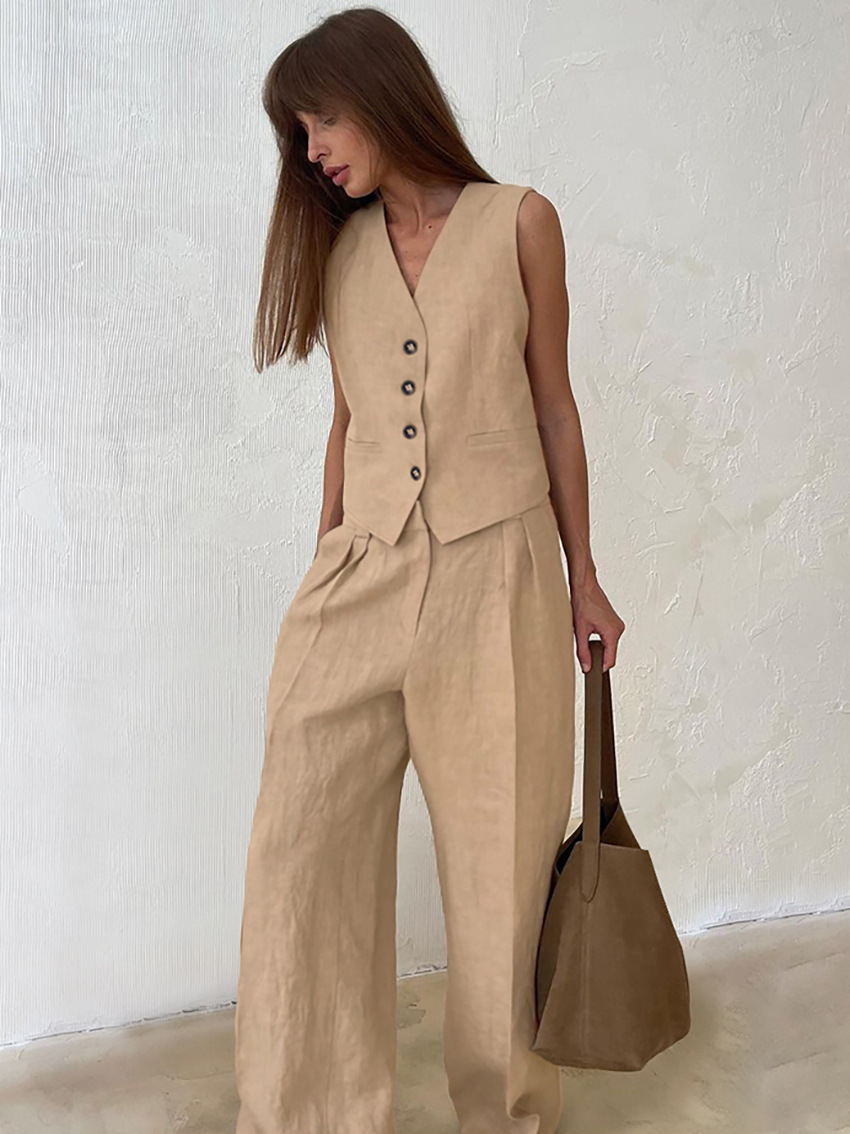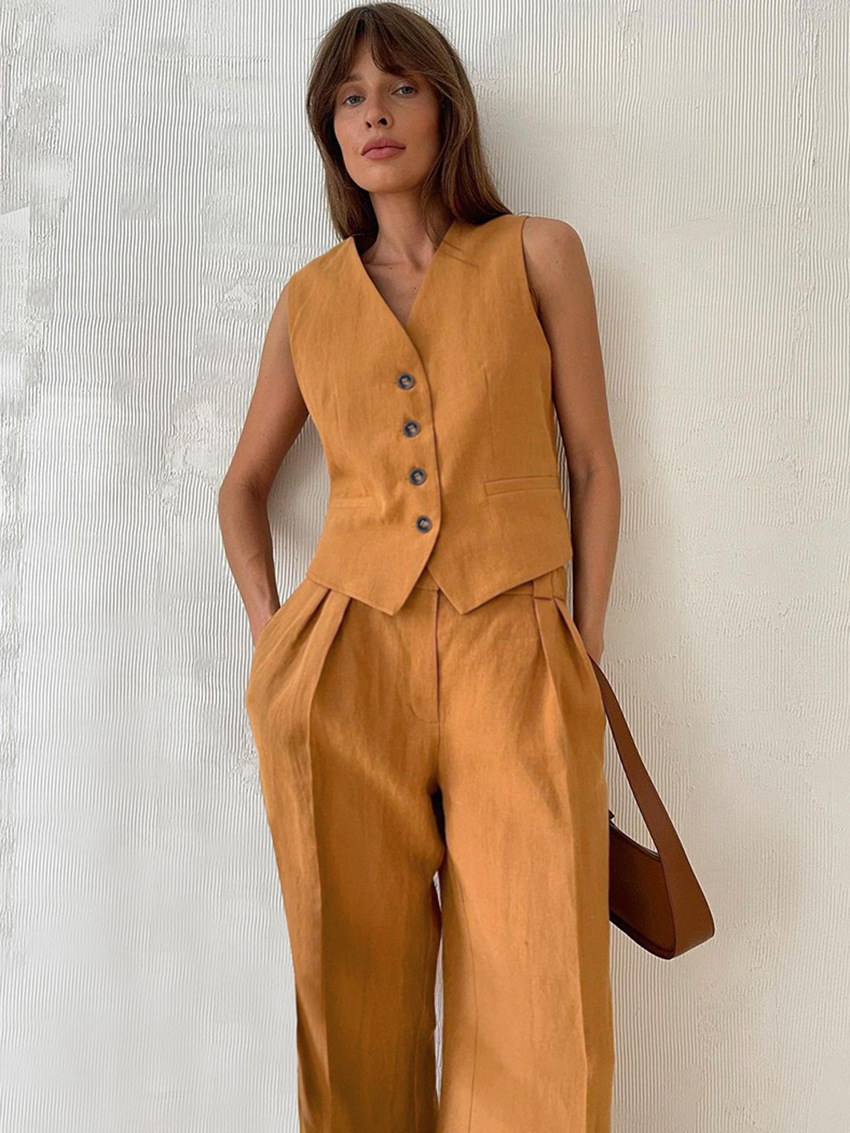 패셔너블하고 다재다능한 슬림핏 조끼와 바지 투피스 세트 2024 크로스보더 신작 슈트 스타일 니치 플리츠 하이웨이스트 슈트