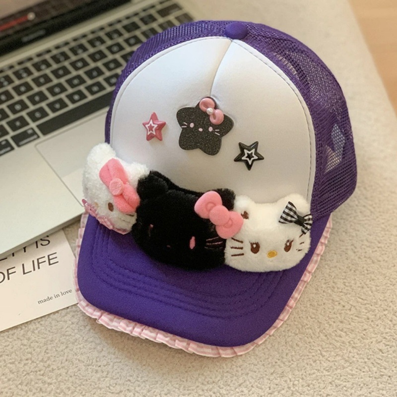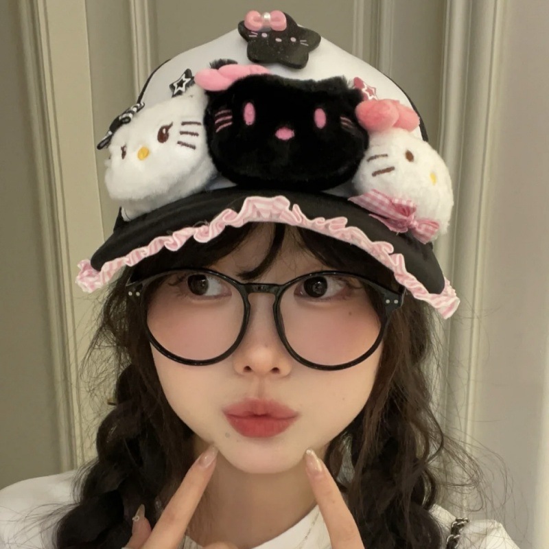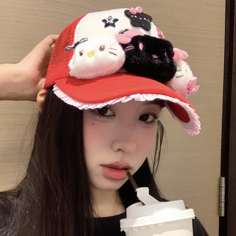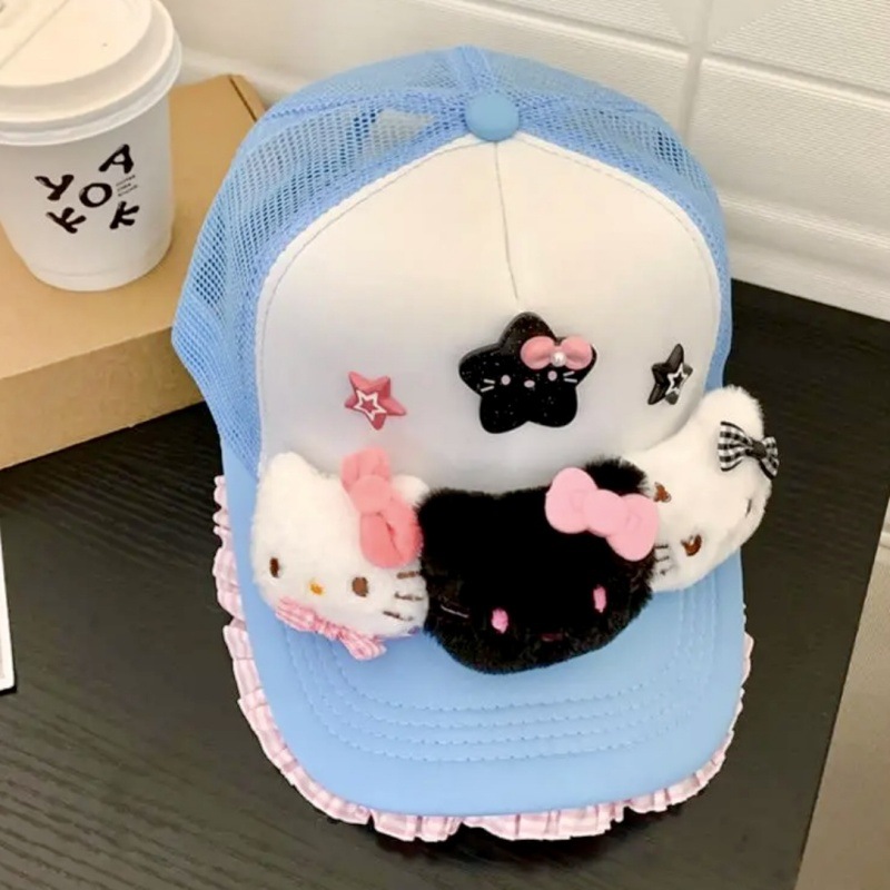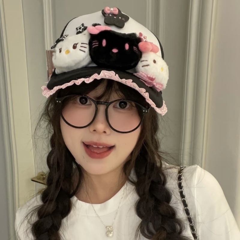 헬로 키티 인형 레이스 야구 모자 여름 그리드 캡 통기성 y2k 핫 소녀 만화 kt 고양이 모자