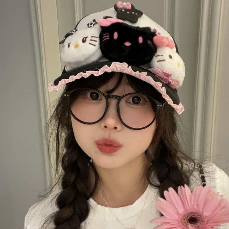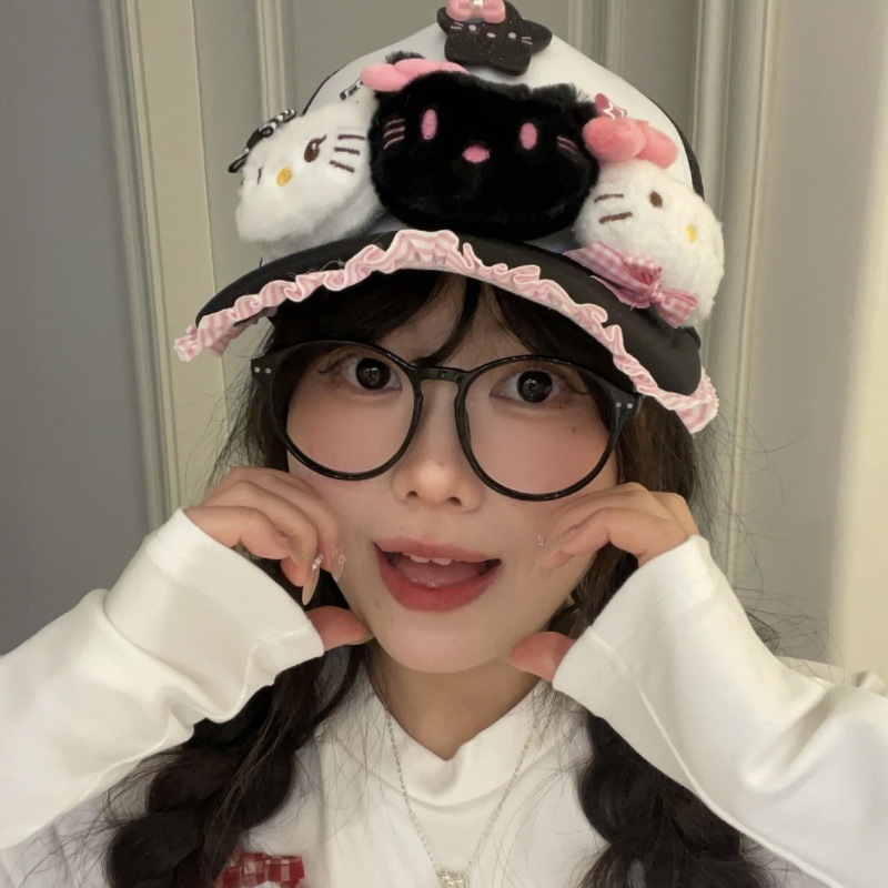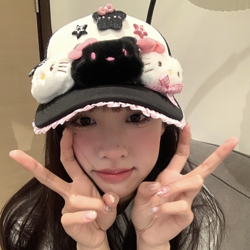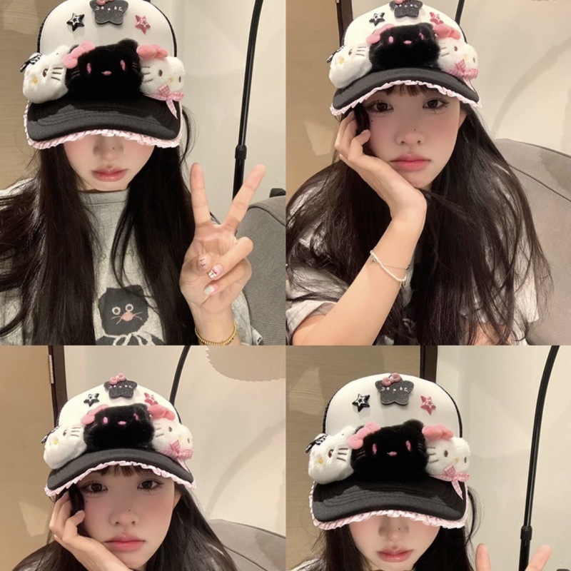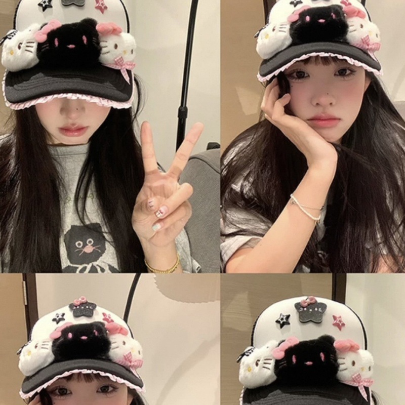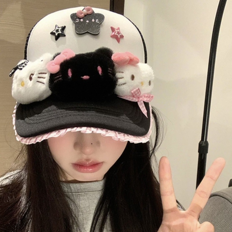 헬로 키티 인형 레이스 야구 모자 여름 그리드 캡 통기성 y2k 핫 소녀 만화 kt 고양이 모자