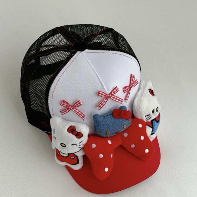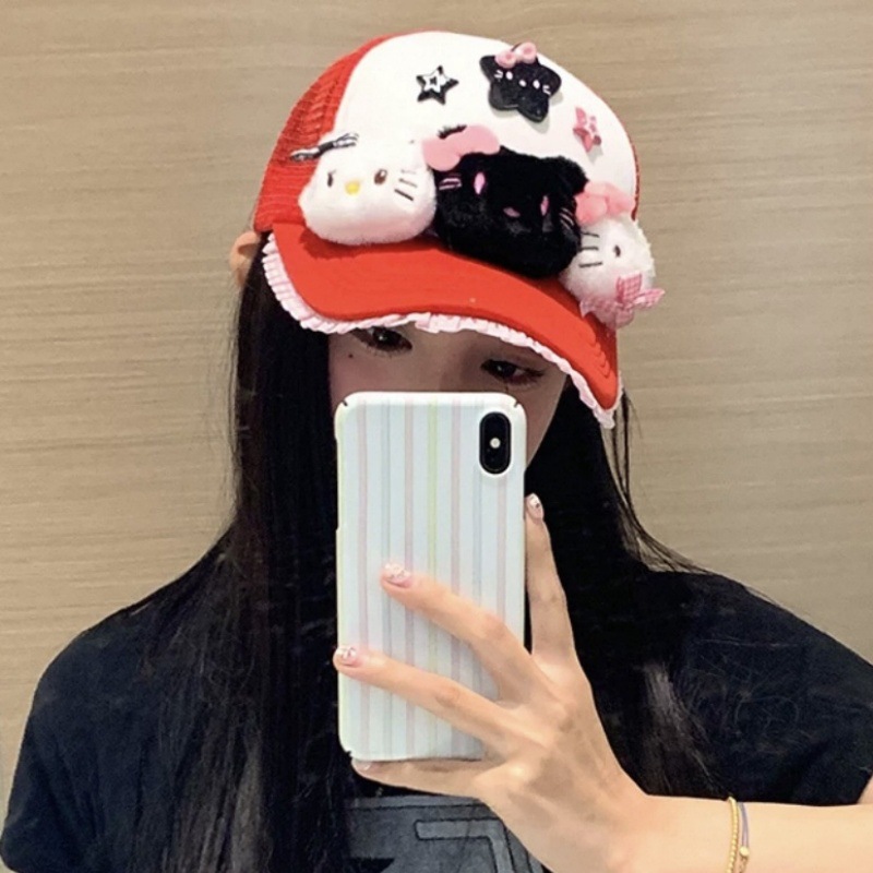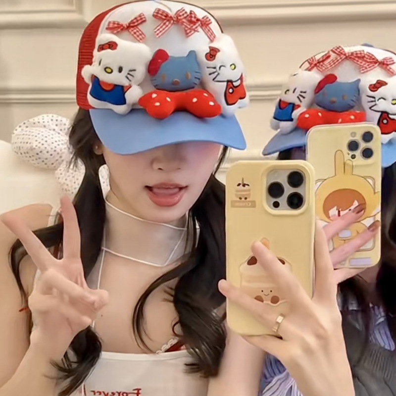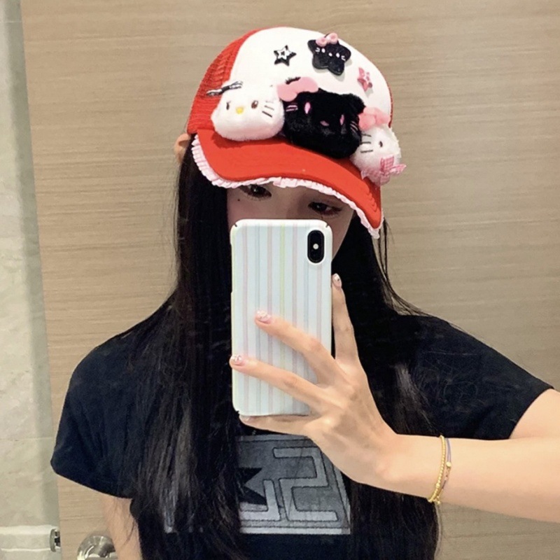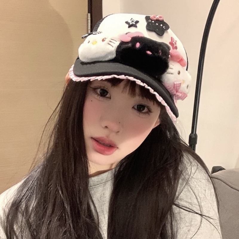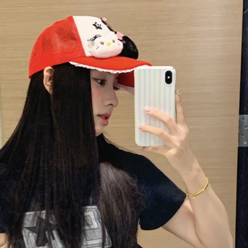 헬로 키티 인형 레이스 야구 모자 여름 그리드 캡 통기성 y2k 핫 소녀 만화 kt 고양이 모자스토어 가기