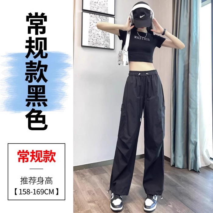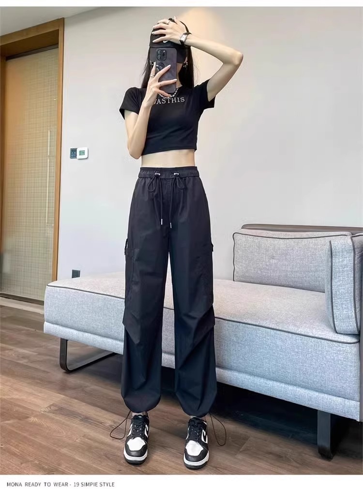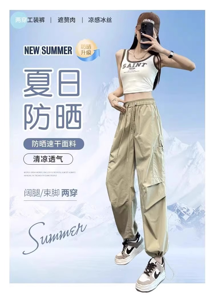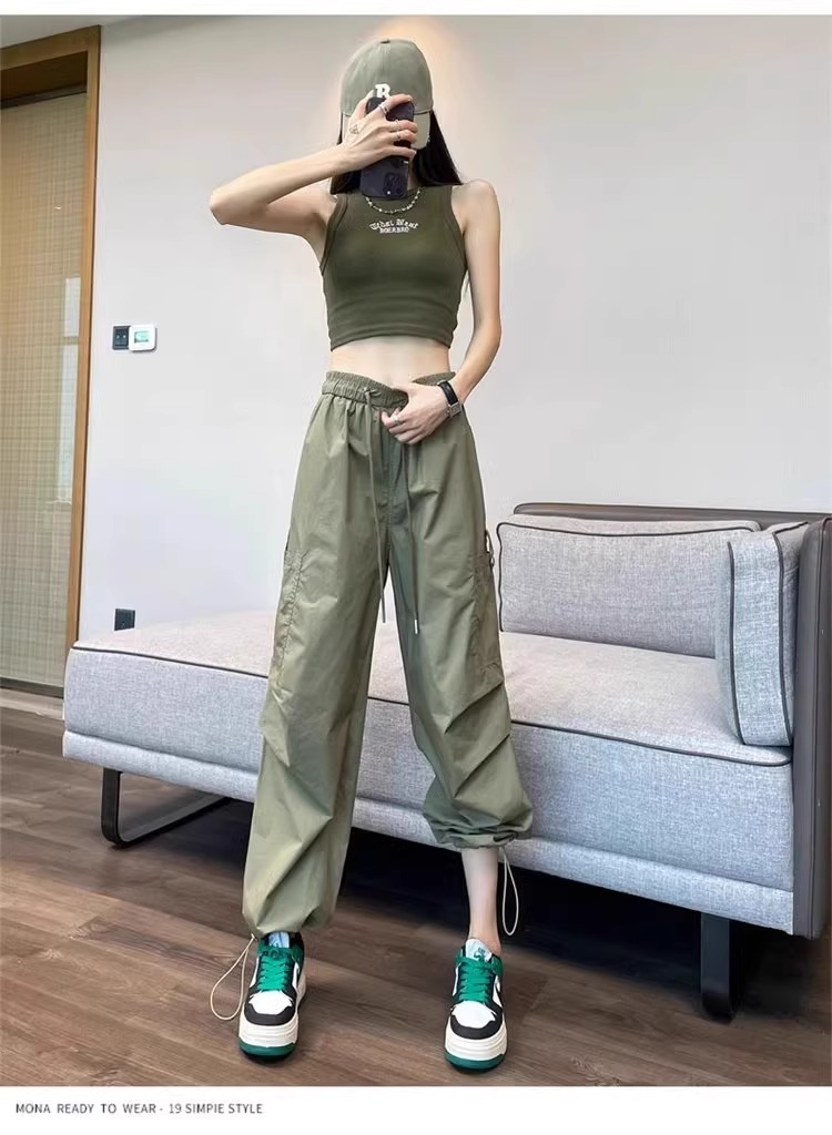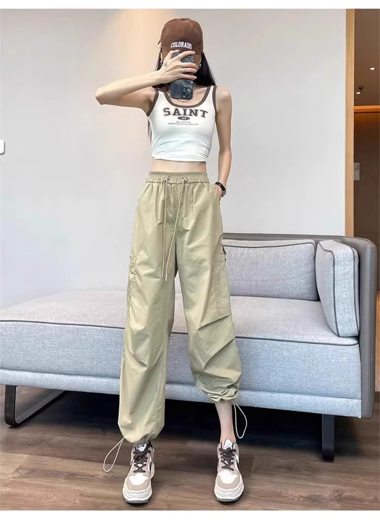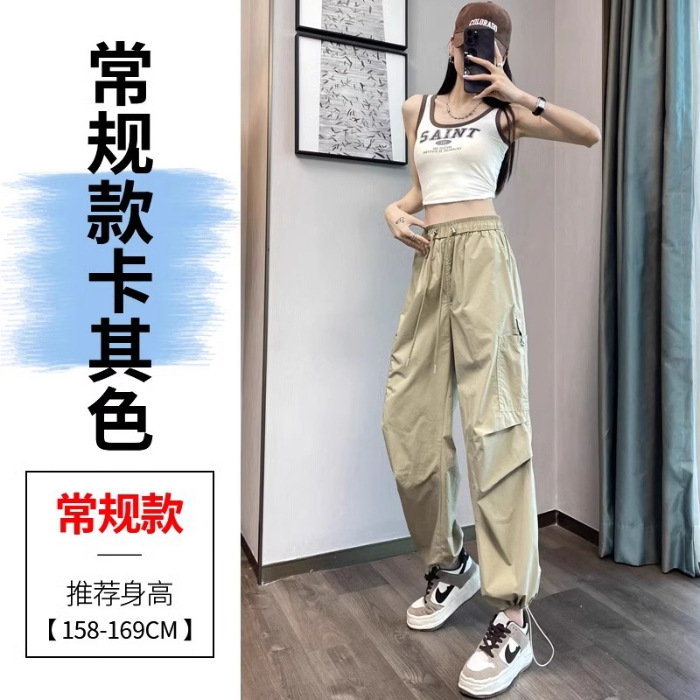 카키 빠른 건조는 여성의 2025 년 새로운 여름 얇은 드로 스트링 하이킹 바지 캐주얼 와이드 레그 낙하산 바지
