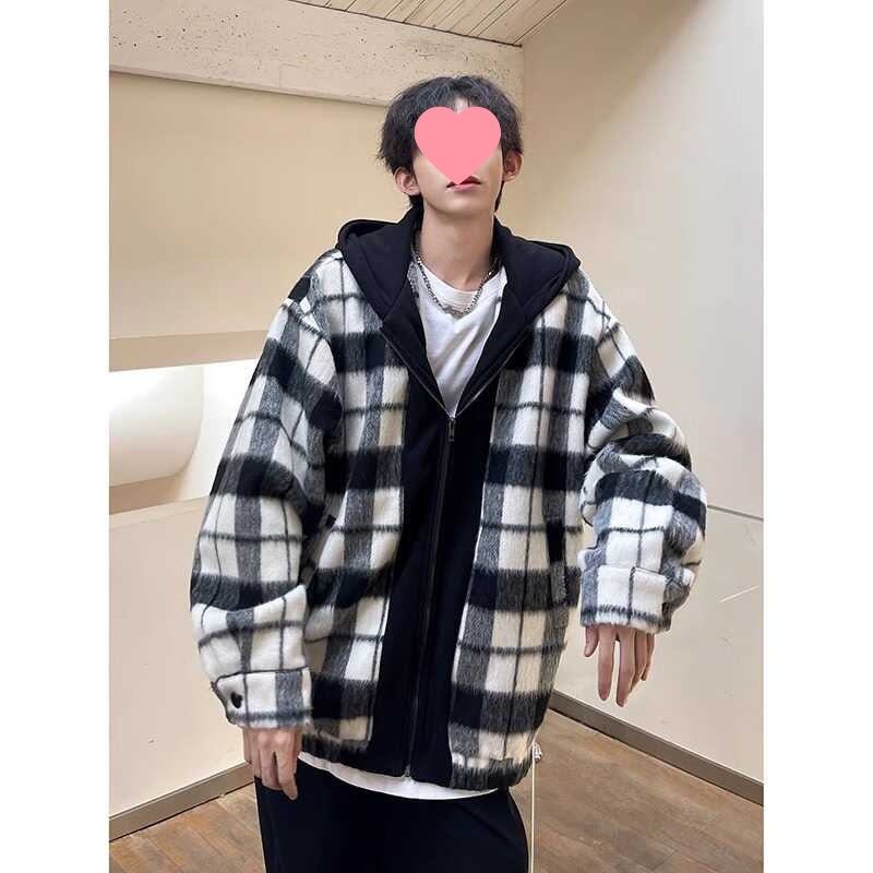 Xiaoxiang 스타일 흑백 격자 무늬 모직 코트 남성 봄과 가을 가짜 투피스 코트 한국 후드 재킷 가운