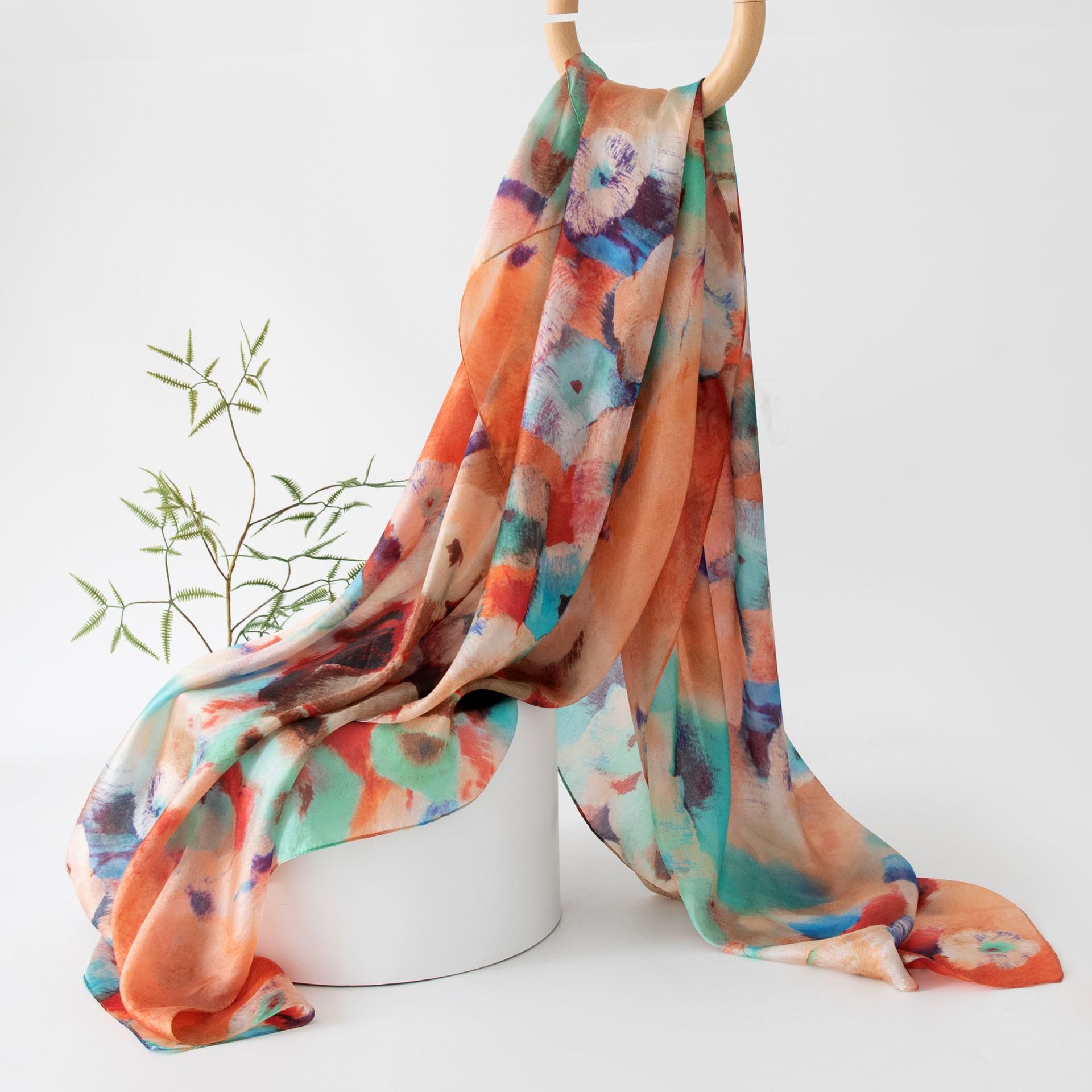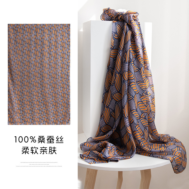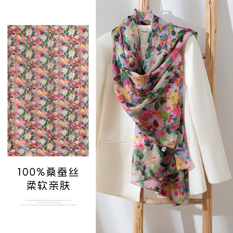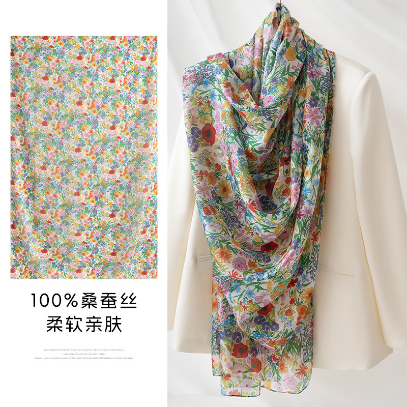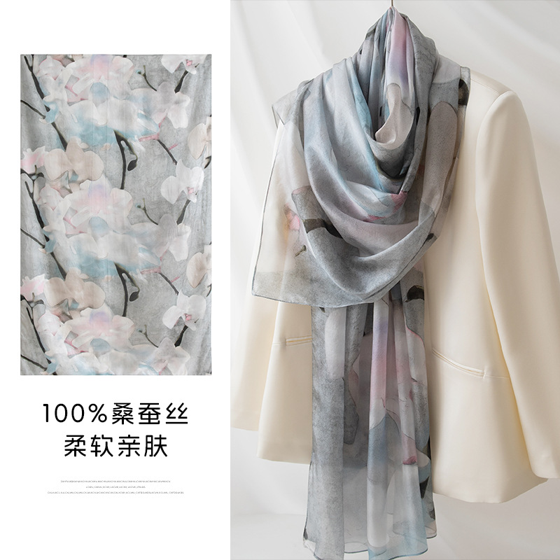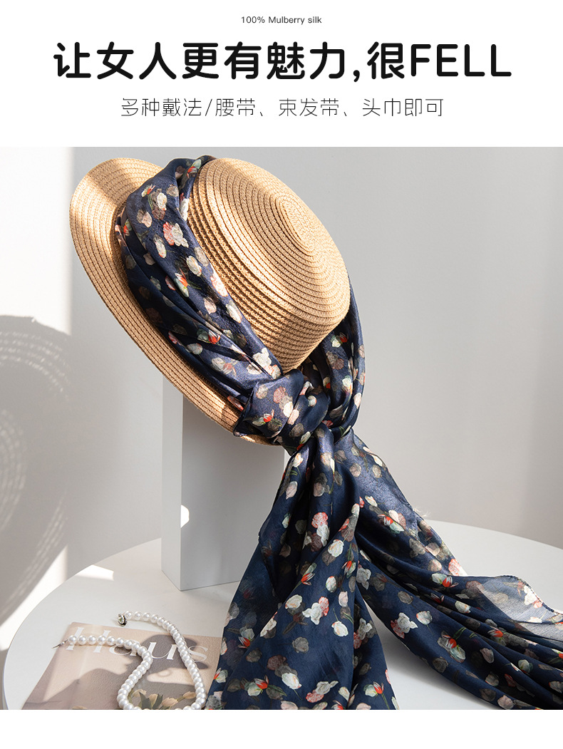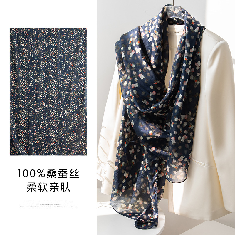 엄선된 2026년산 실크 스카프, 고급스러운 짙은 파란색 작은 꽃무늬 실크 스카프, 자외선 차단, 어머니께 선물