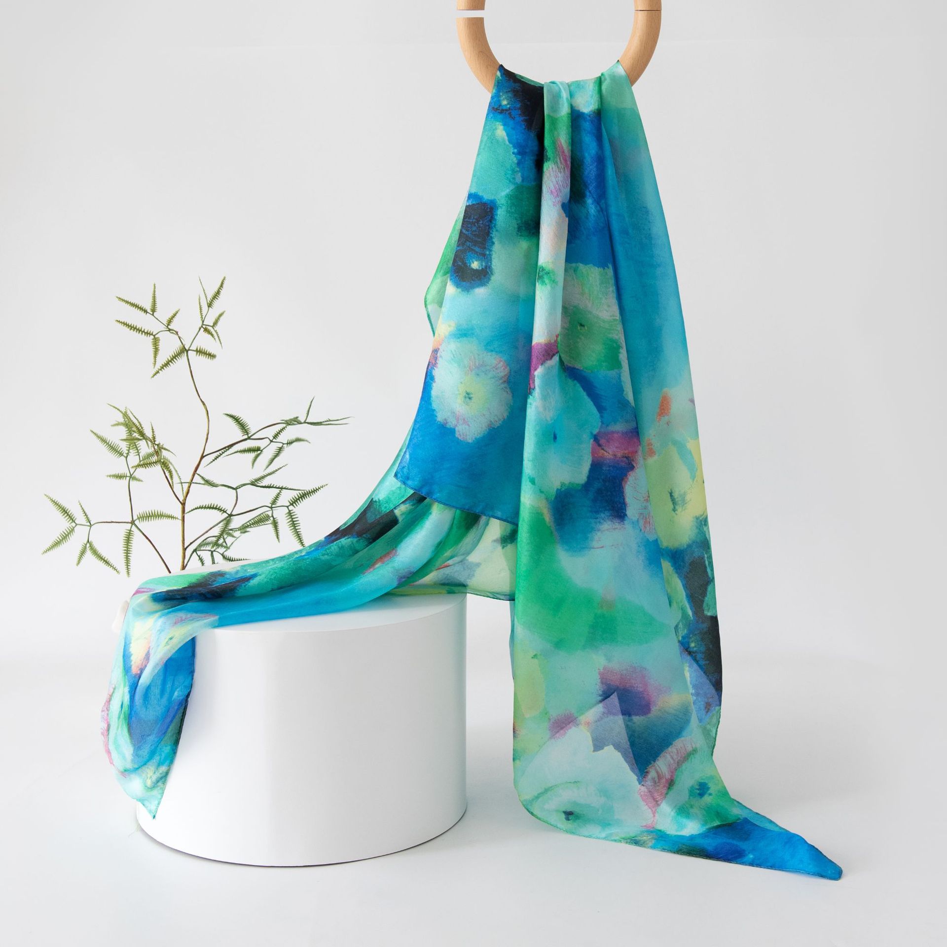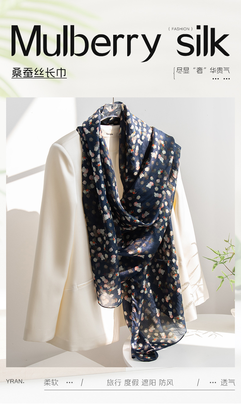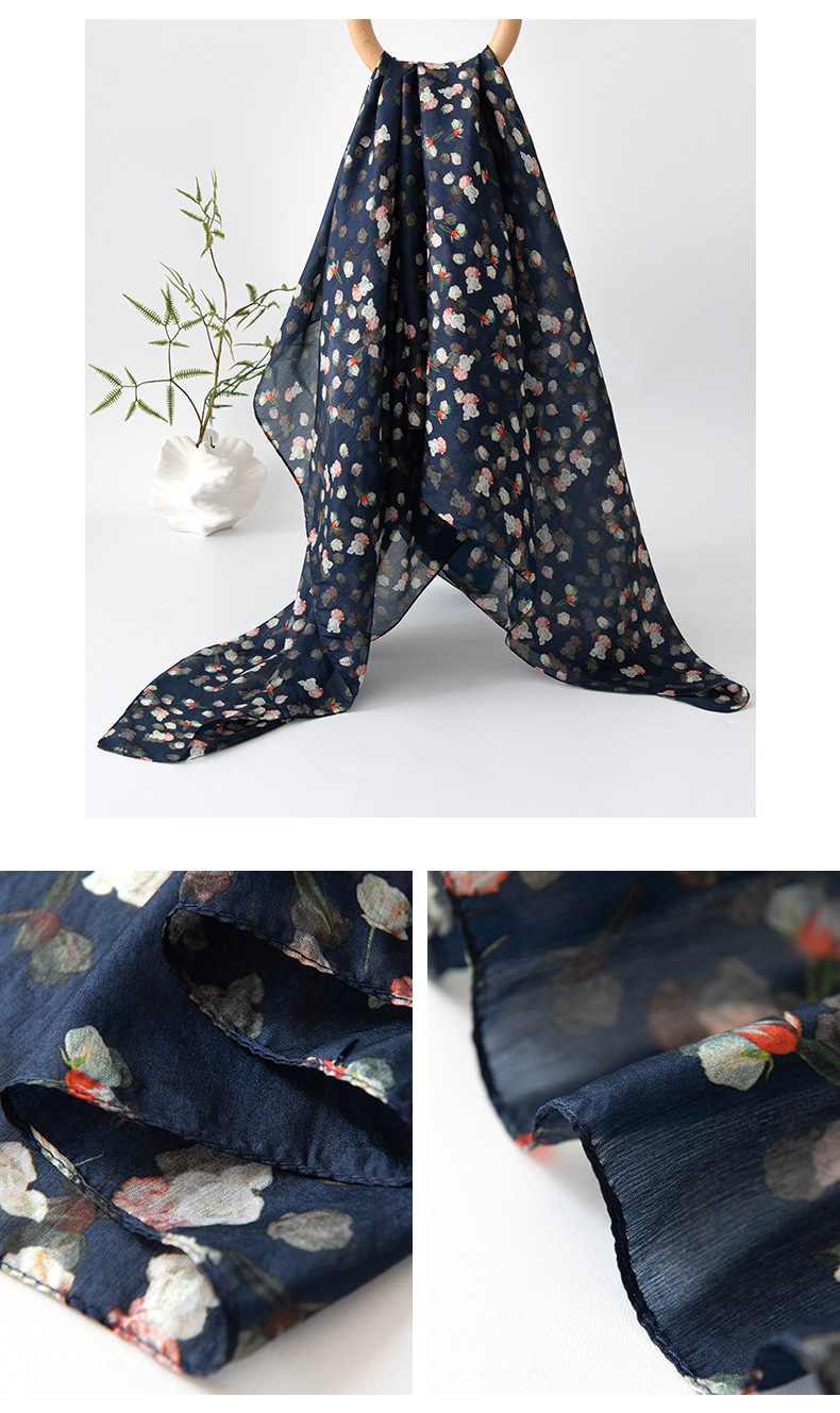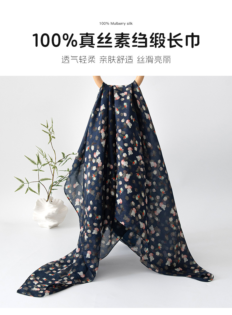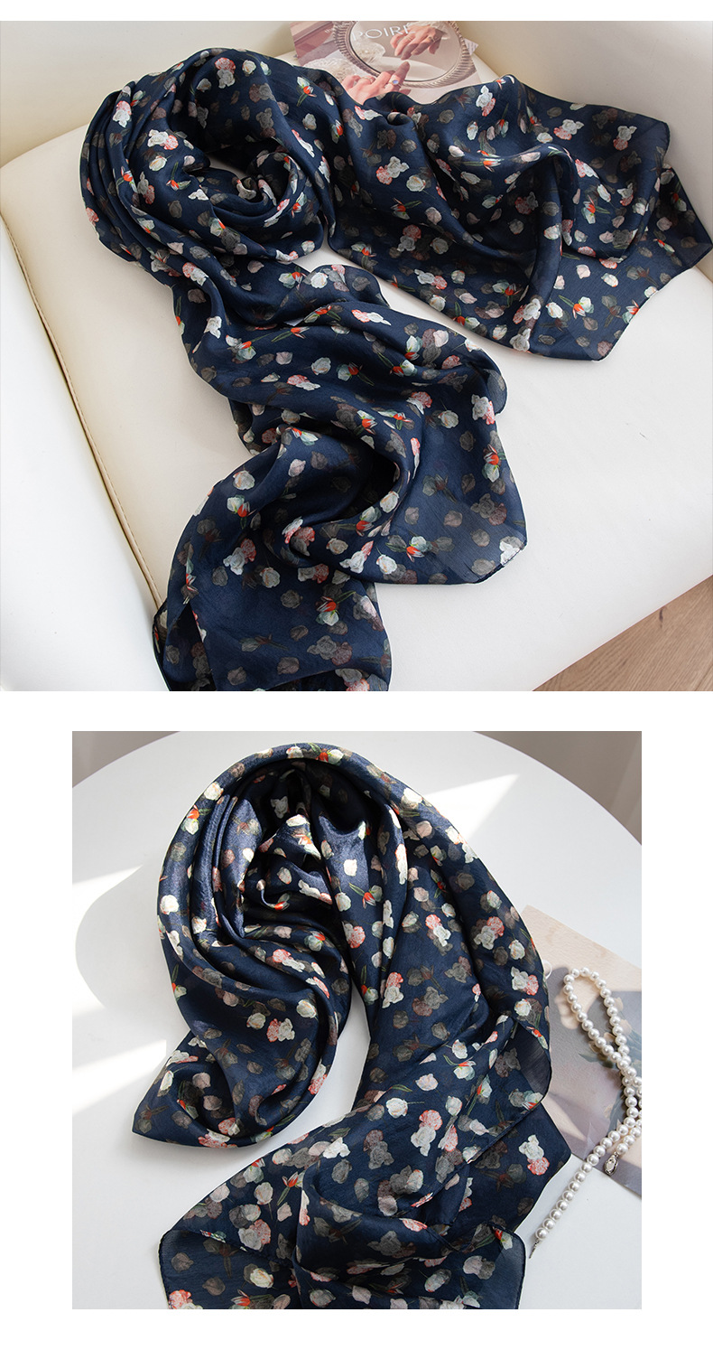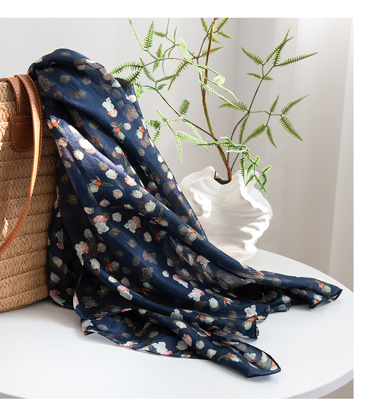 엄선된 2026년산 실크 스카프, 고급스러운 짙은 파란색 작은 꽃무늬 실크 스카프, 자외선 차단, 어머니께 선물스토어 가기