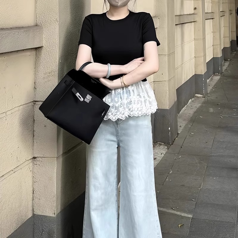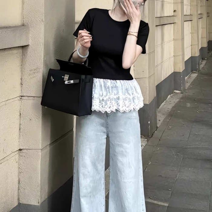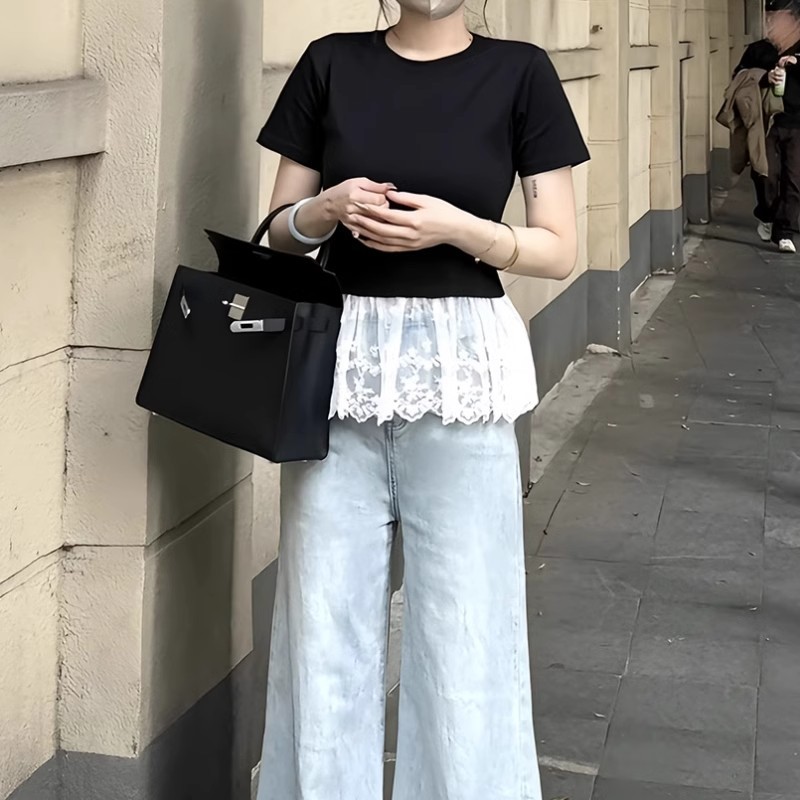 국경 간 헤어 봄과 여름 기질 슬림 헴 레이스 스티칭 반팔 티셔츠 여성용 이너 베이스 셔츠스토어 가기
