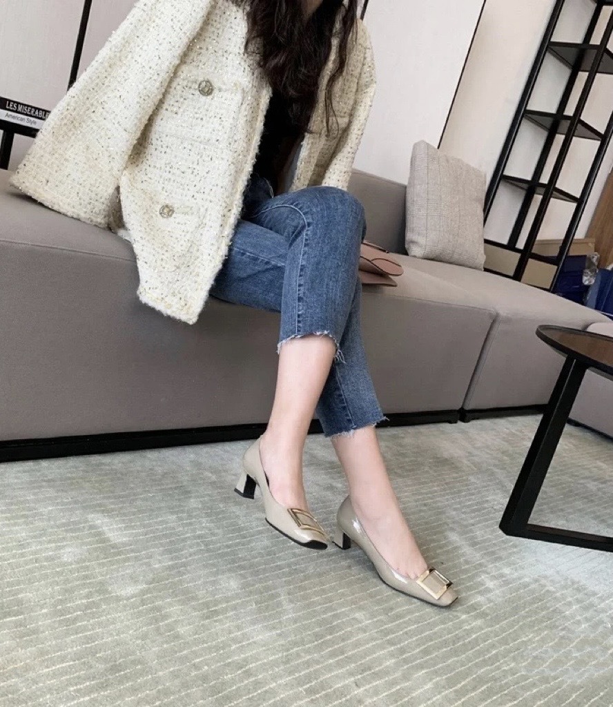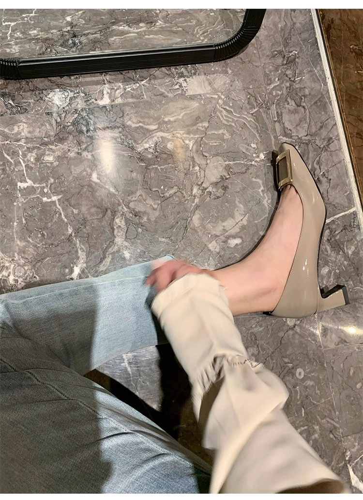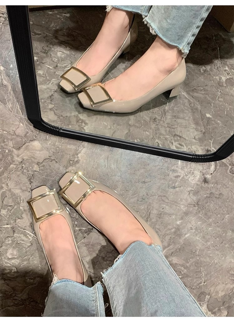 봄 88168 새로운 인터넷 축하 같은 스타일 rv 특허 가죽 스퀘어 버튼 싱글 신발 두꺼운 힐 미드 힐 스퀘어 헤드 얕은 여성 신발 통근스토어 가기
