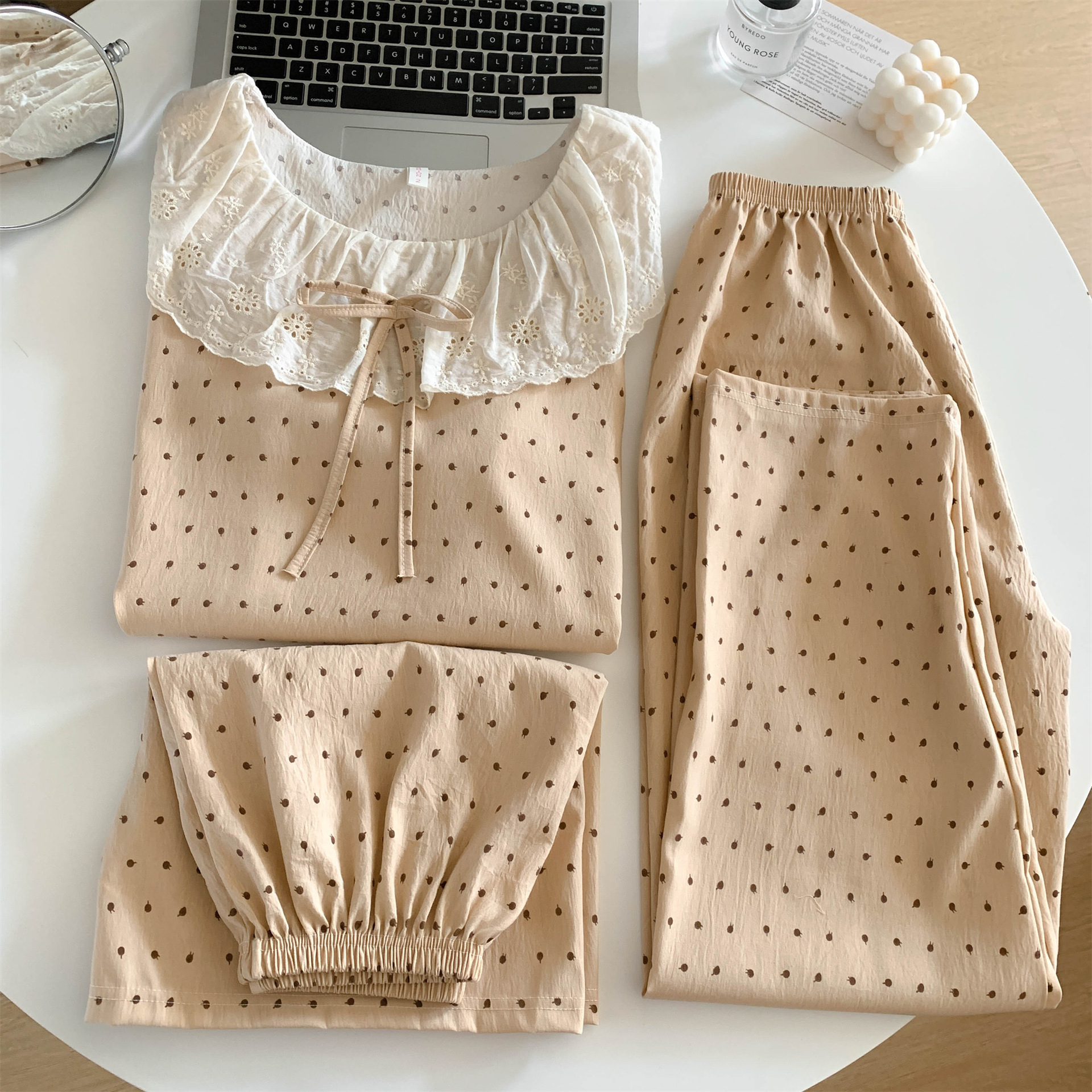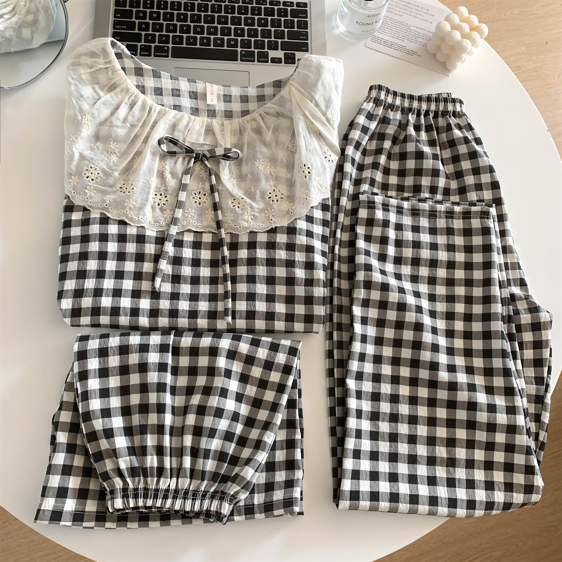 잠옷 여성 여름 소녀 달콤한 레이스 격자 무늬 짧은 소매 반바지 홈 의류 세트 라이브 도매스토어 가기
