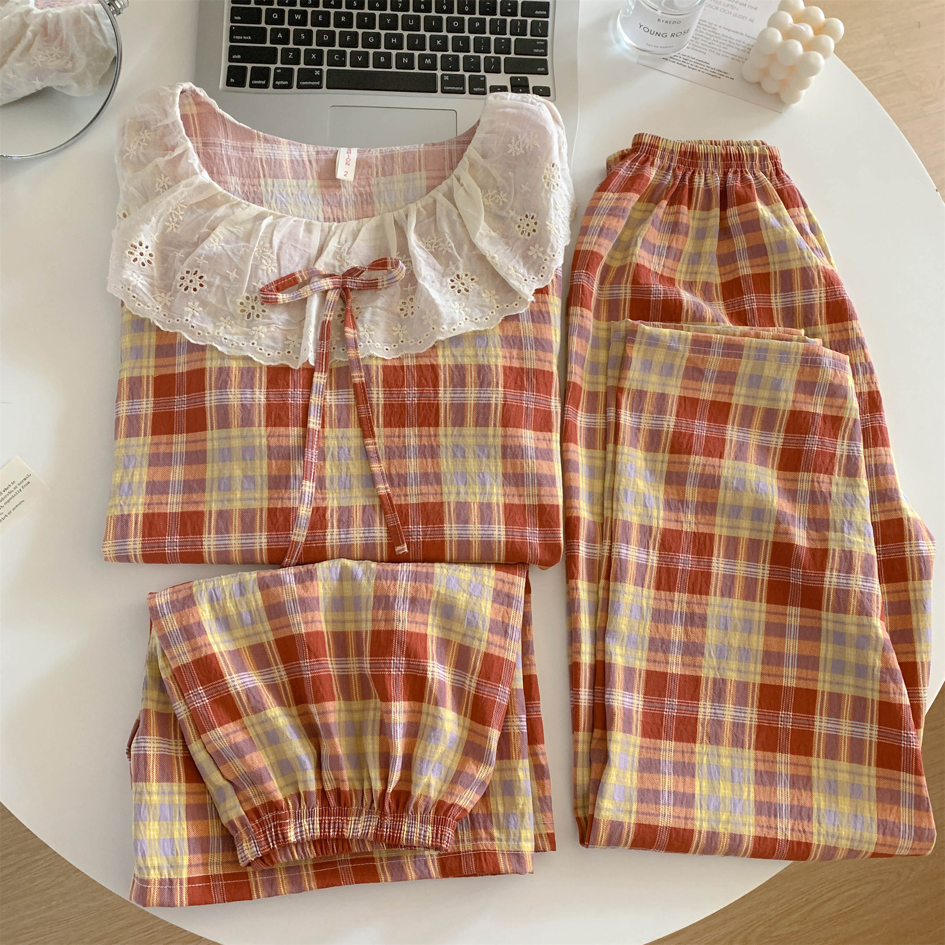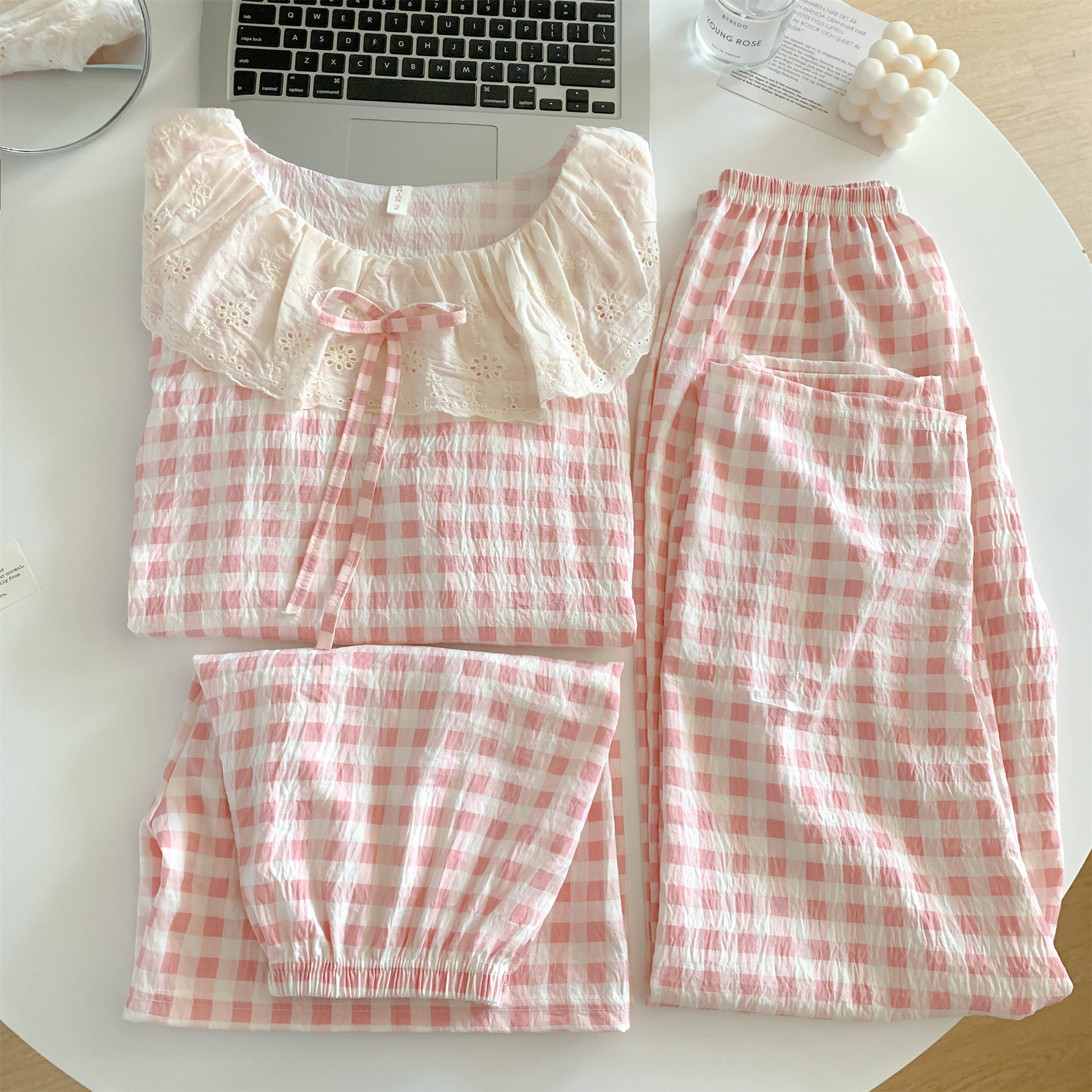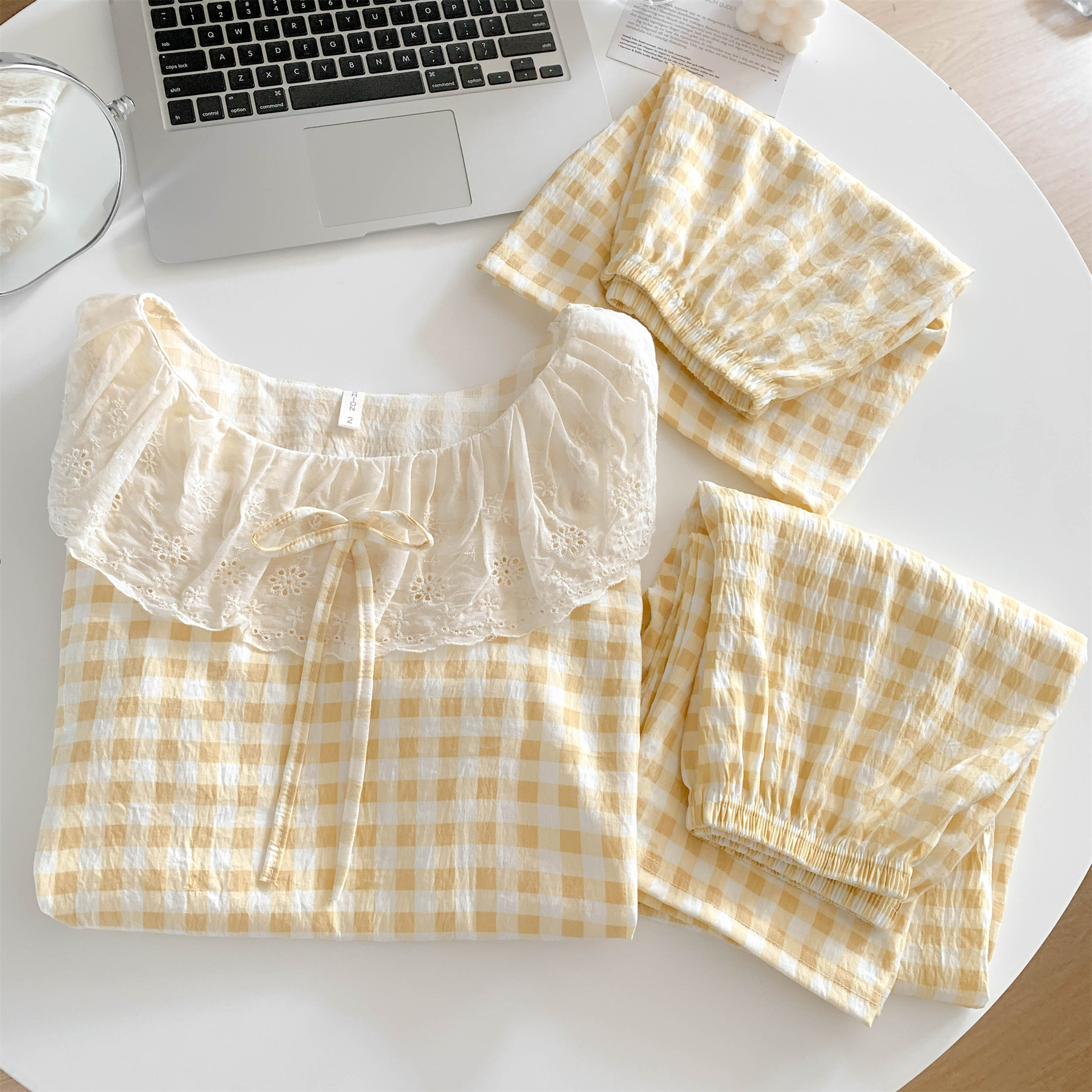 잠옷 여성 여름 소녀 달콤한 레이스 격자 무늬 짧은 소매 반바지 홈 의류 세트 라이브 도매