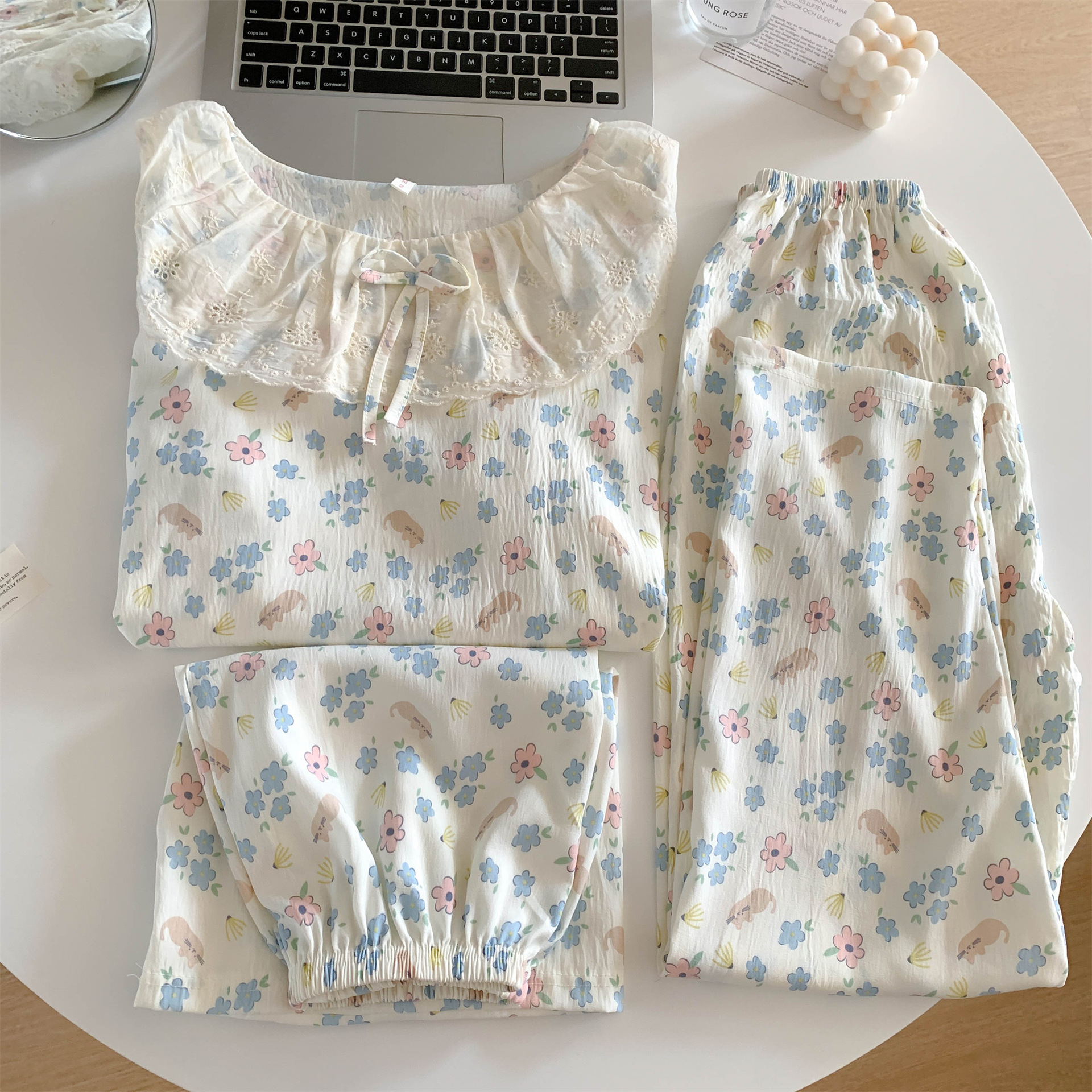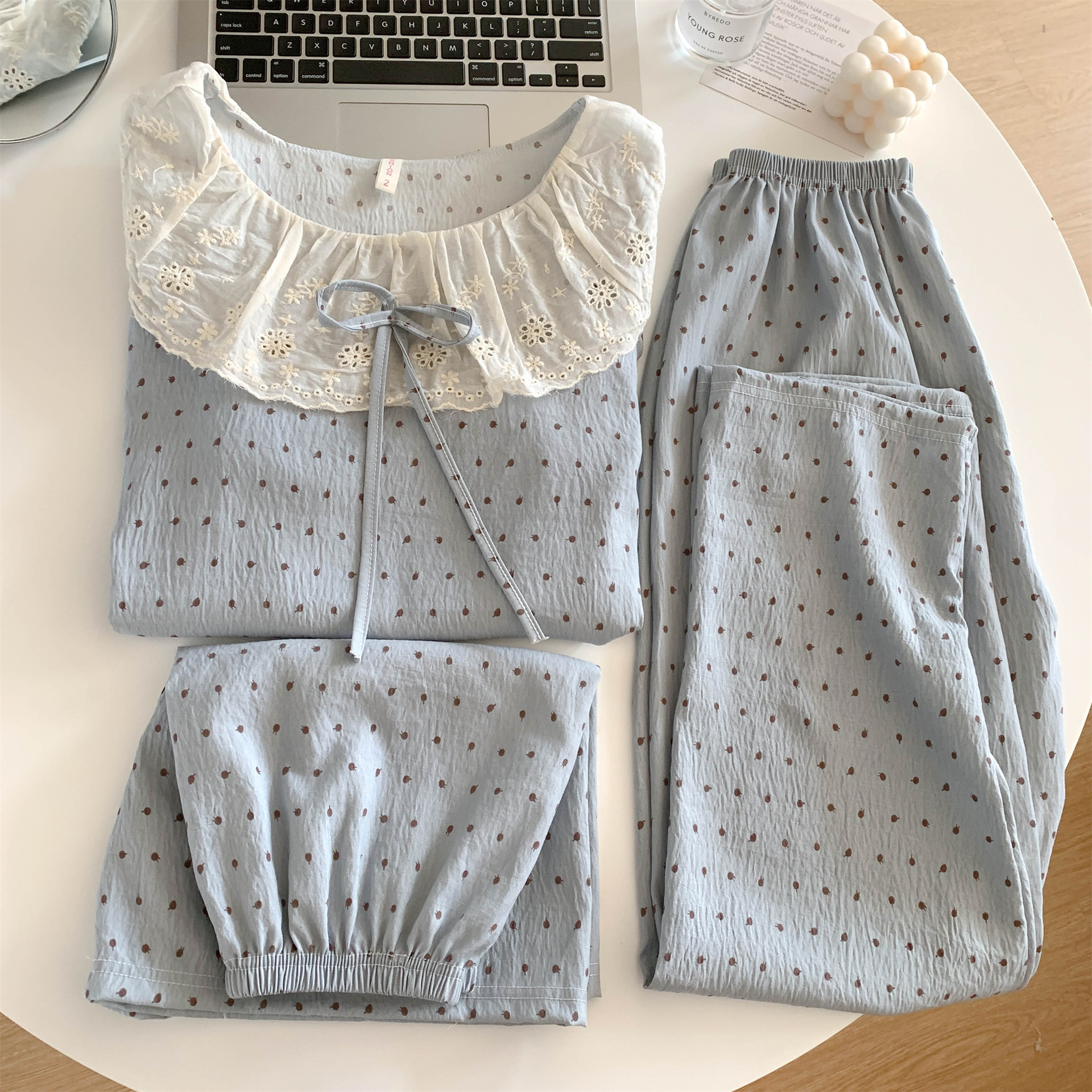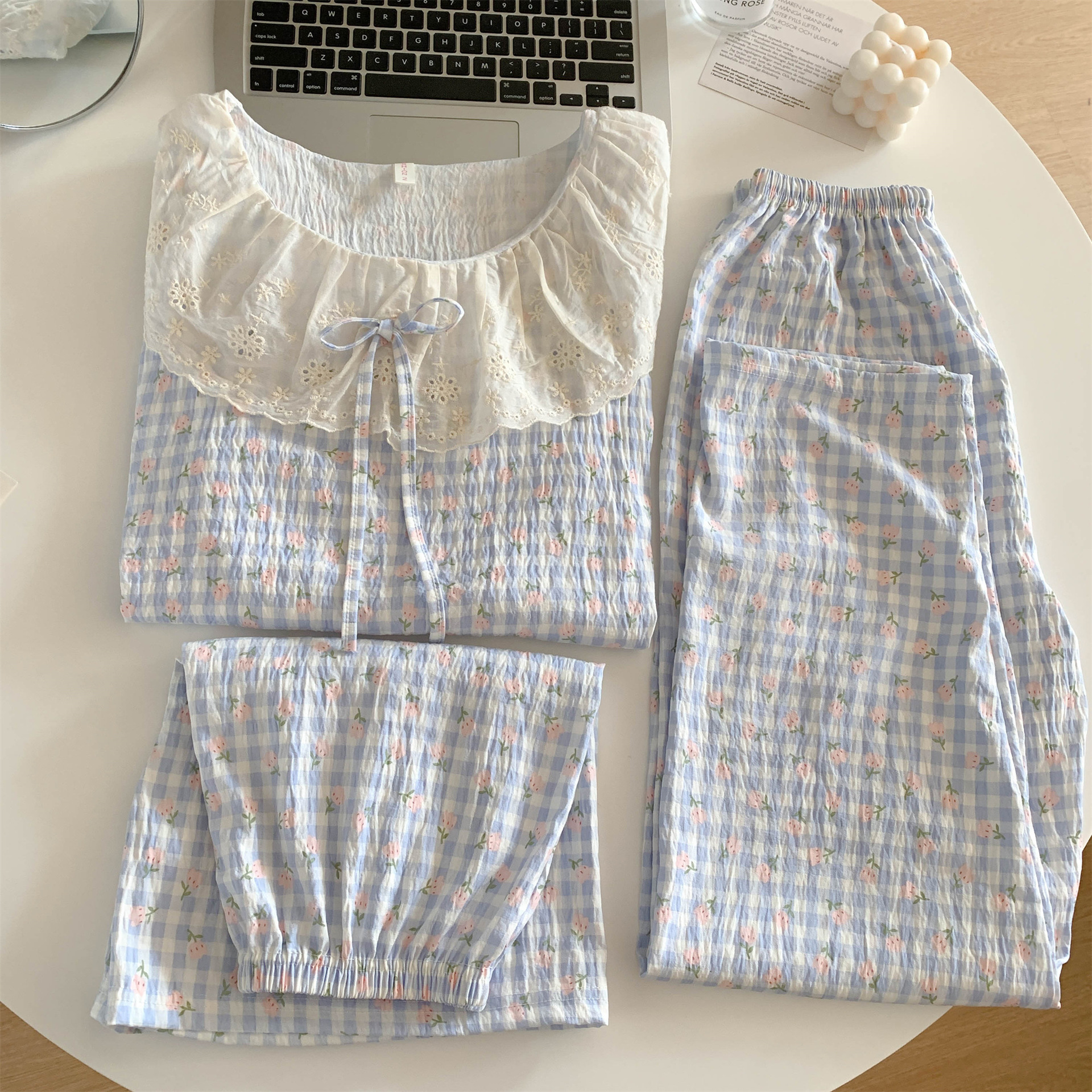 잠옷 여성 여름 소녀 달콤한 레이스 격자 무늬 짧은 소매 반바지 홈 의류 세트 라이브 도매