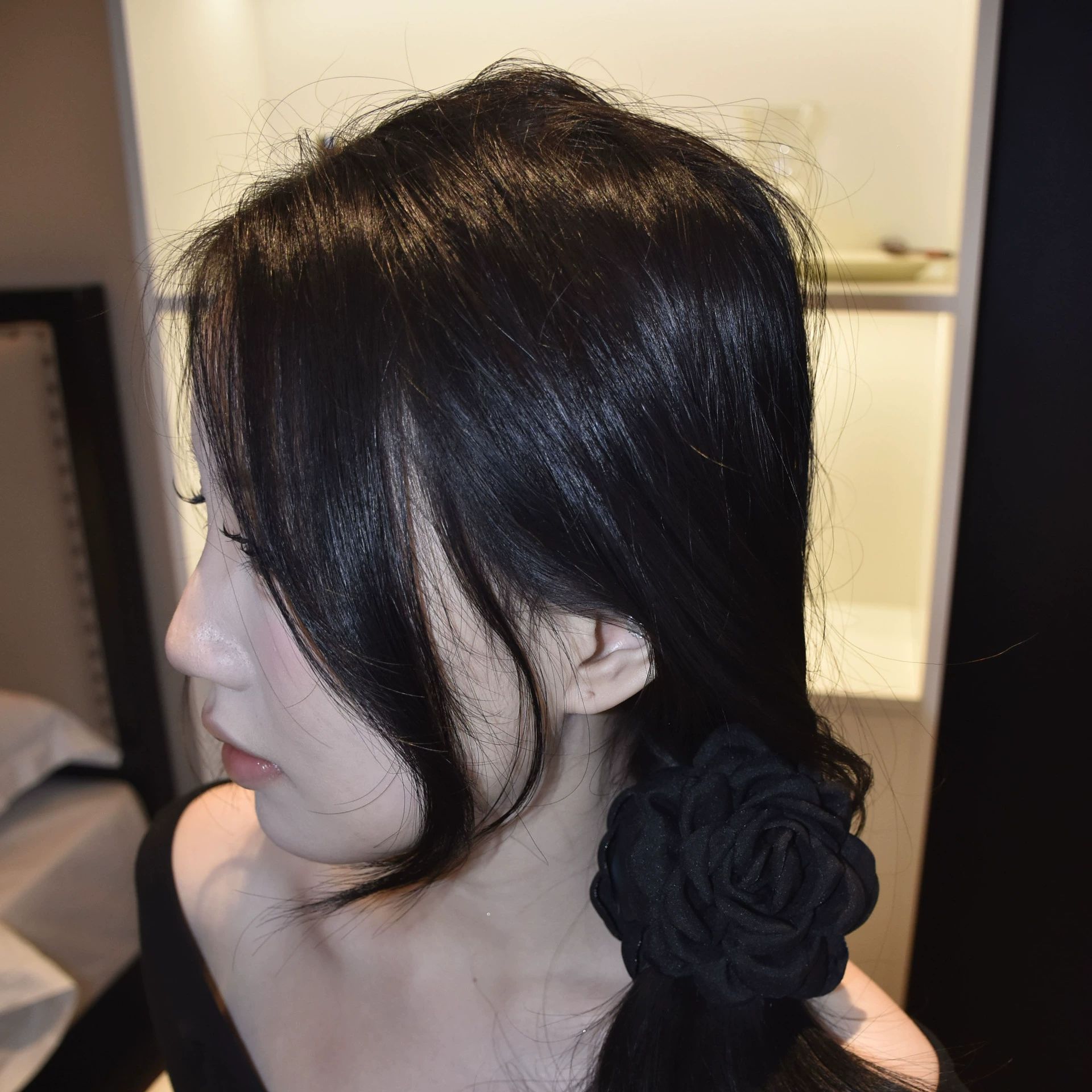 • 검정색과 빨간색 꽃무늬 리본 포니테일 클립