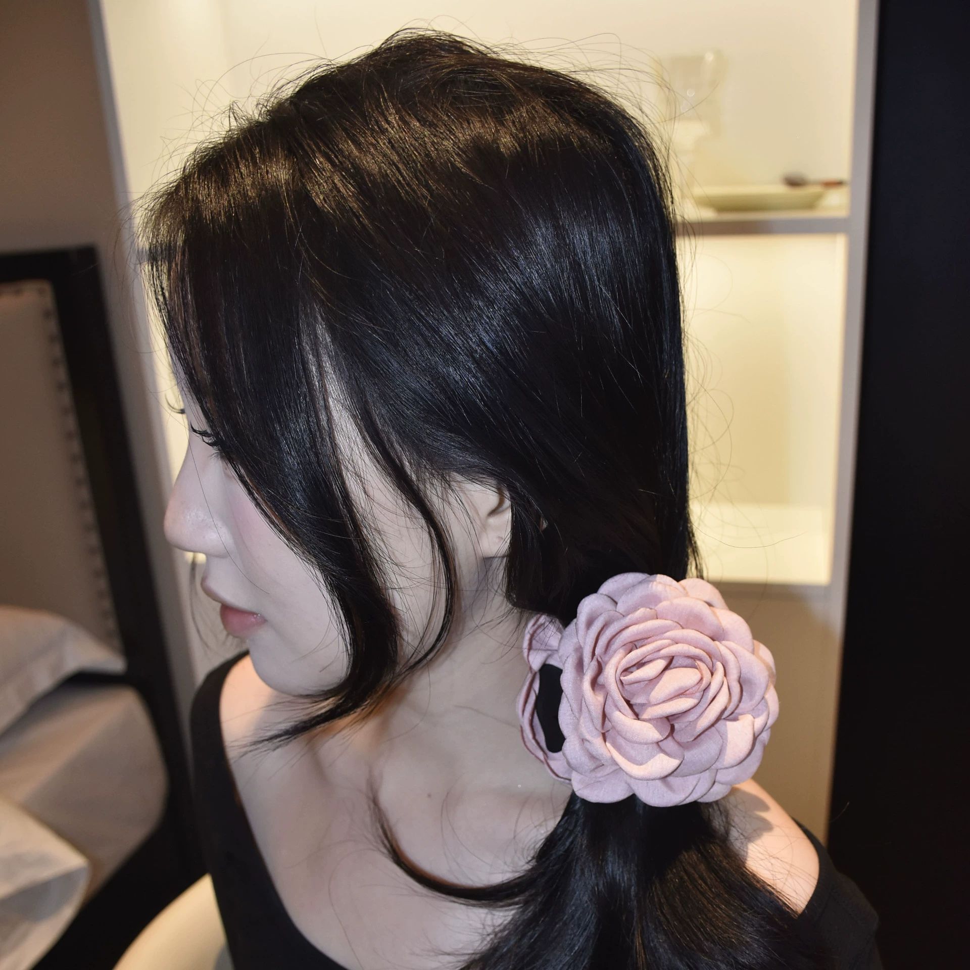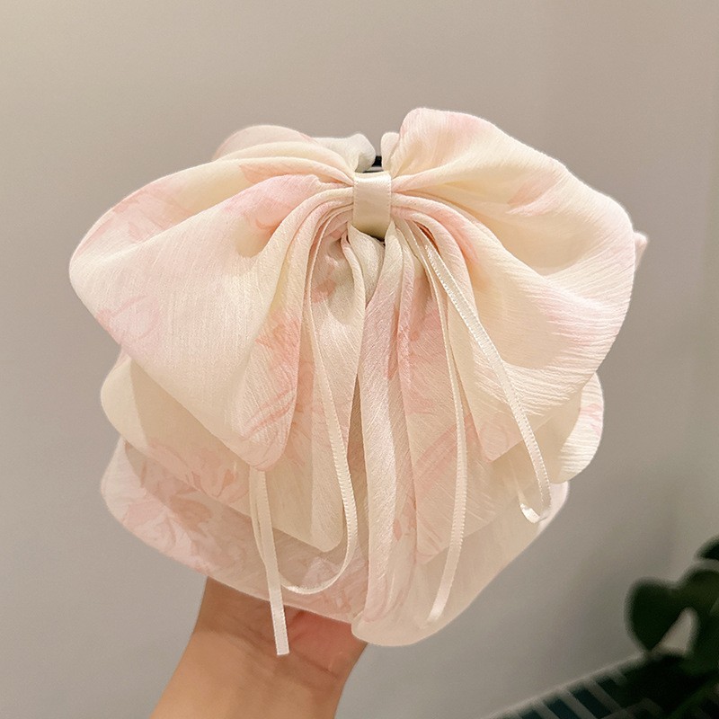 • 흰색과 회색 꽃무늬 리본 포니테일 클립