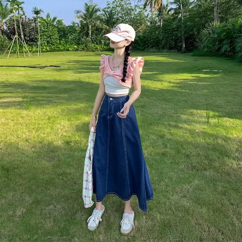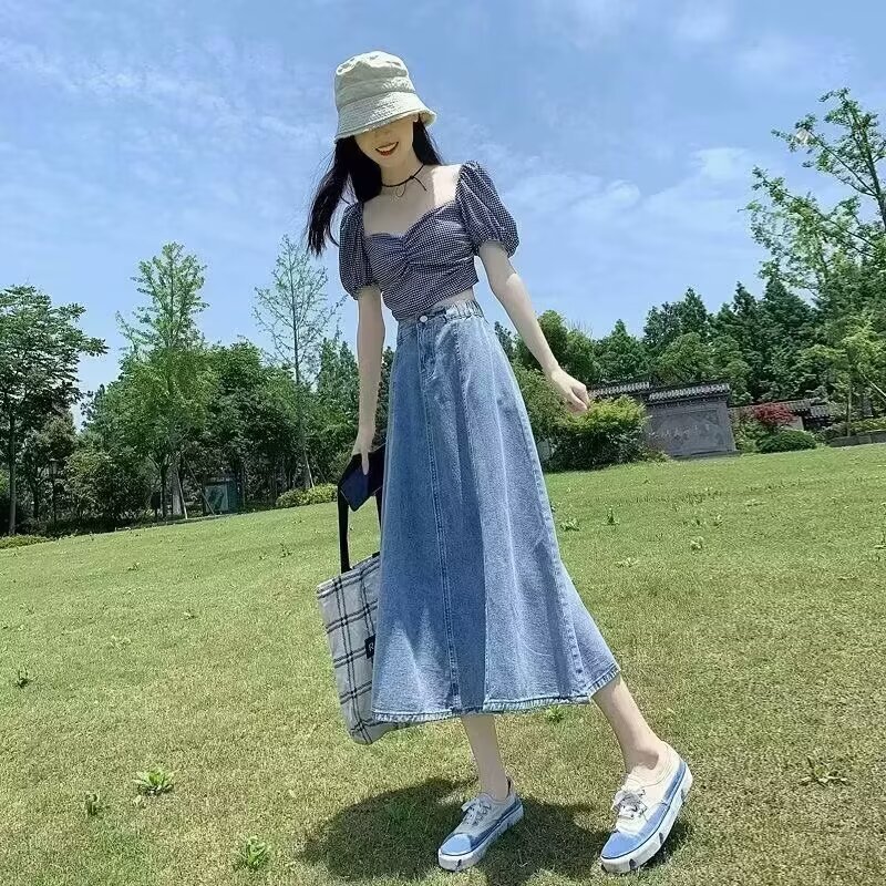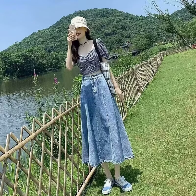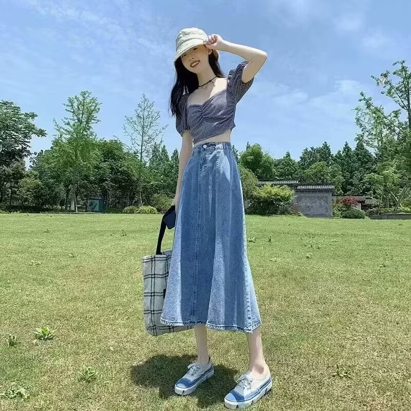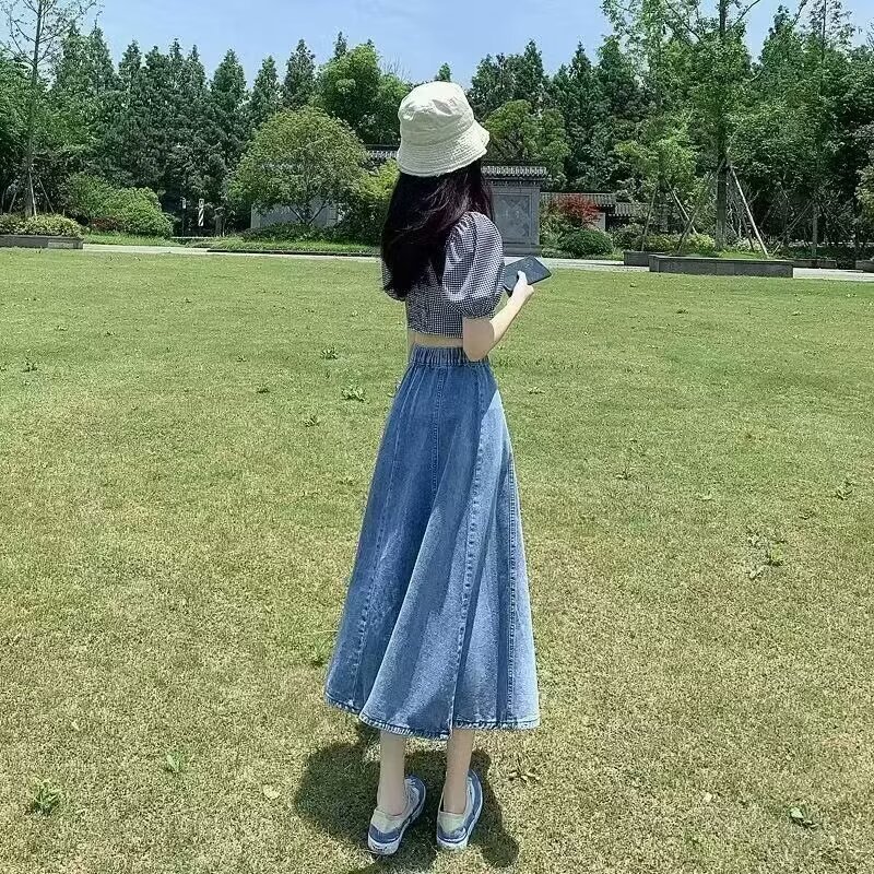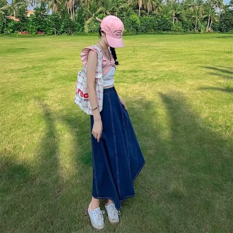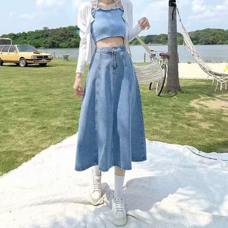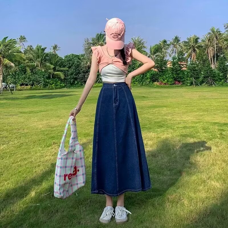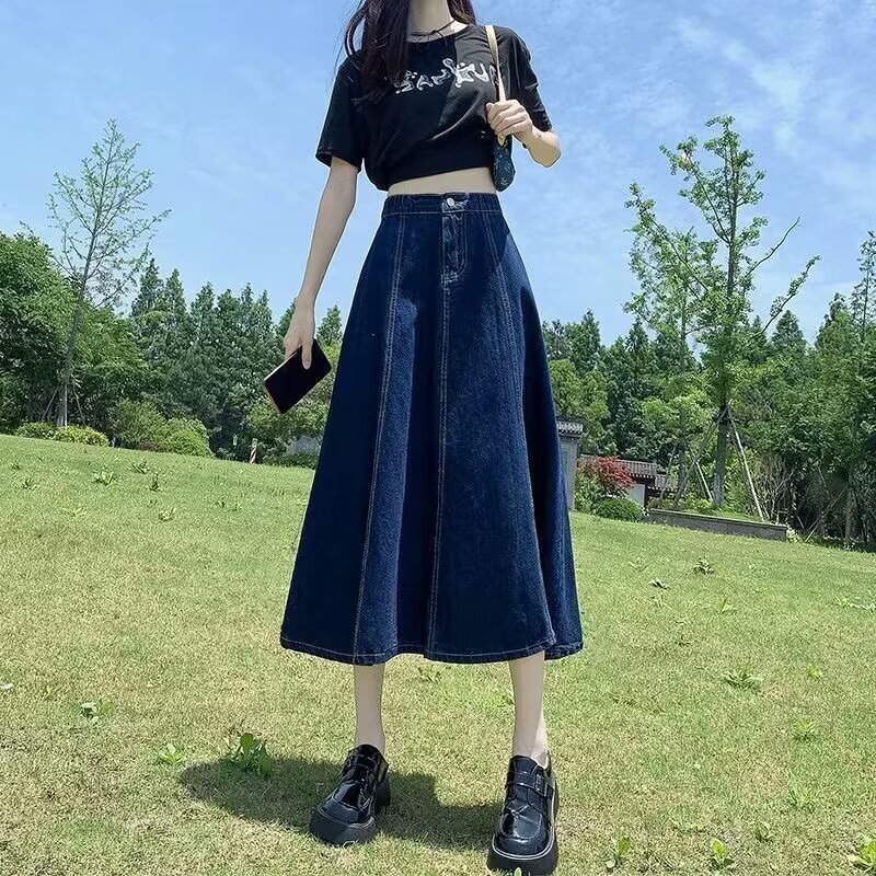 데님 스커트 여성 2024 봄 여름 신상 하이 웨이스트 슬림 캐주얼 중간 길이 데님 스커트 진한 파란색