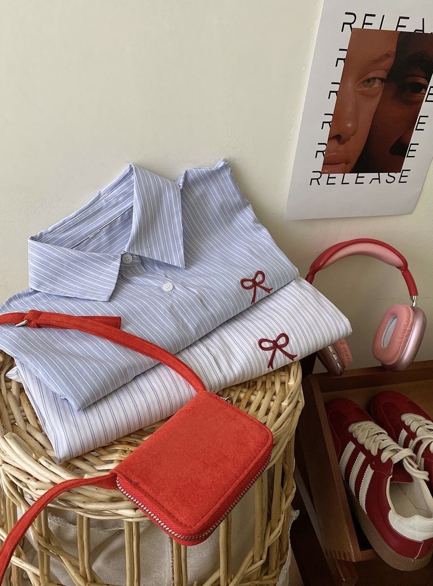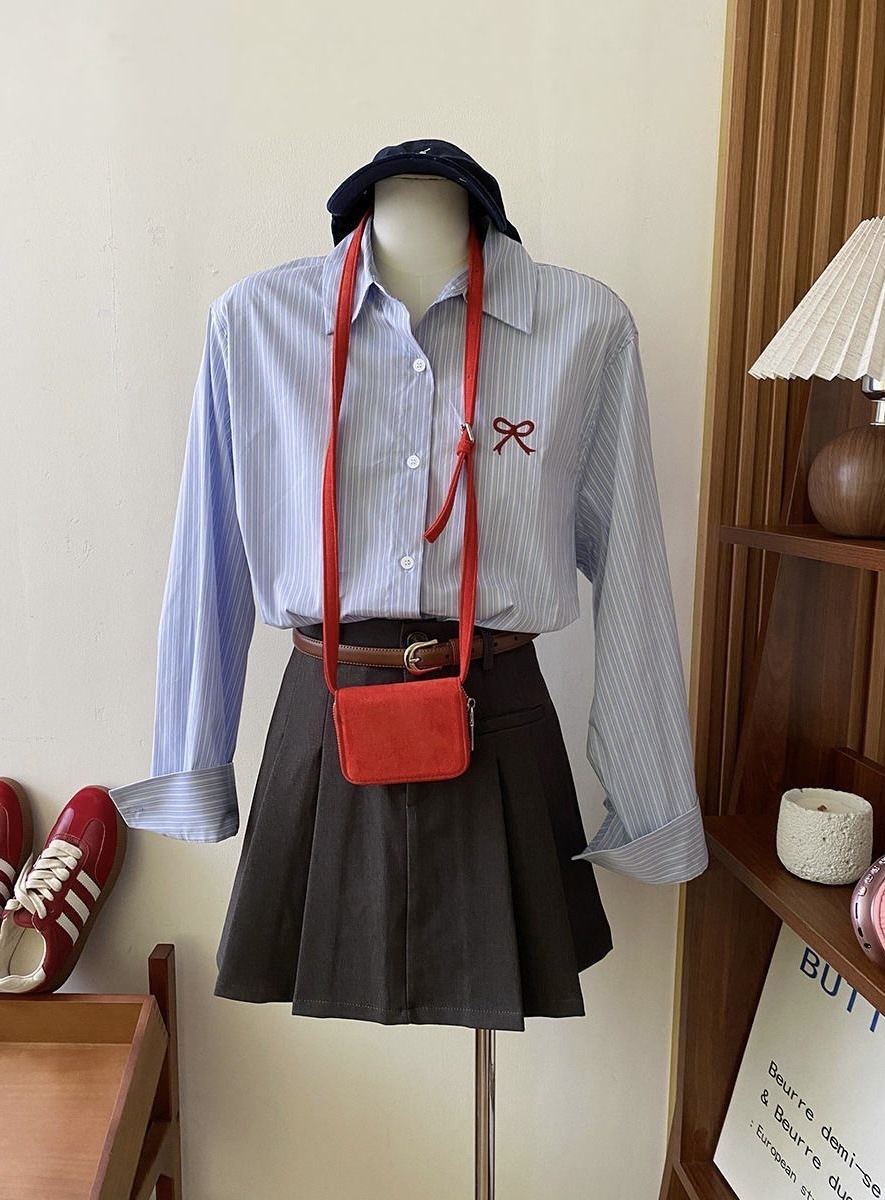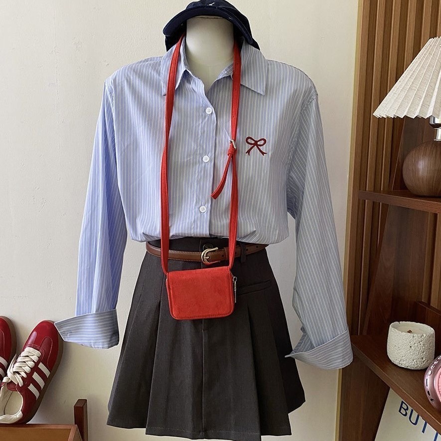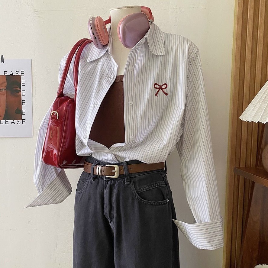 한국 스타일 블루 스트라이프 활 자수 긴팔 셔츠 여성용 봄과 가을 내복 레트로 서양식 셔츠 탑스토어 가기