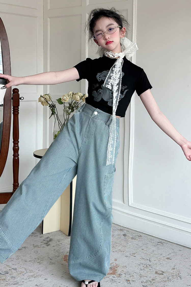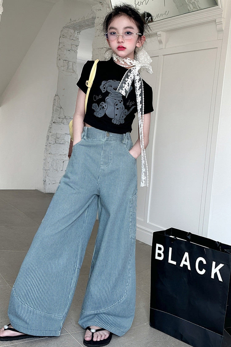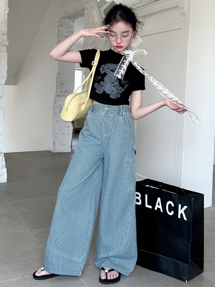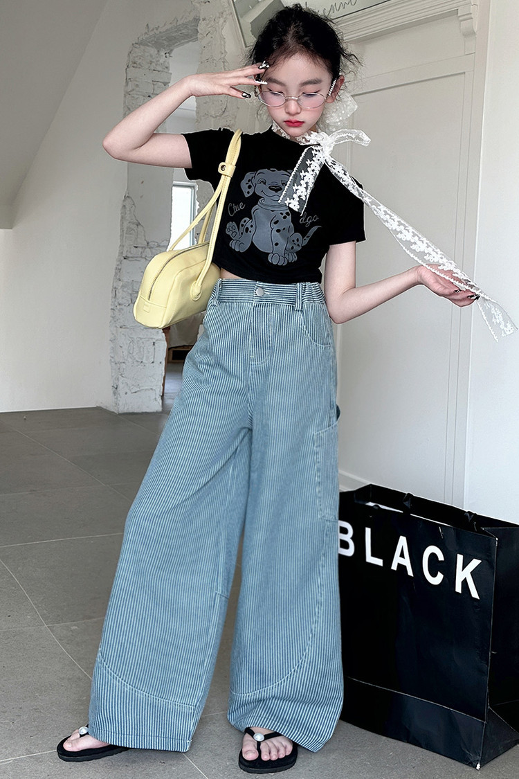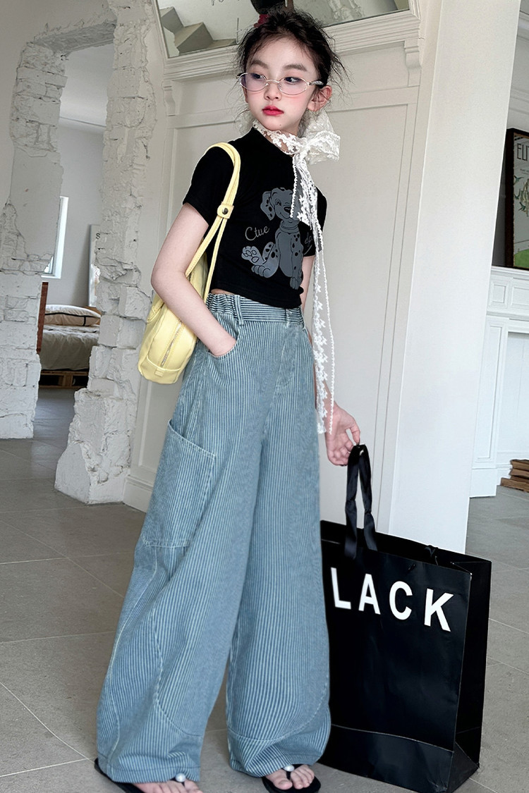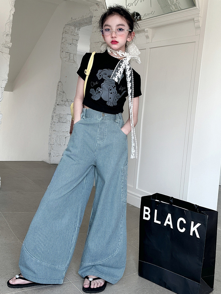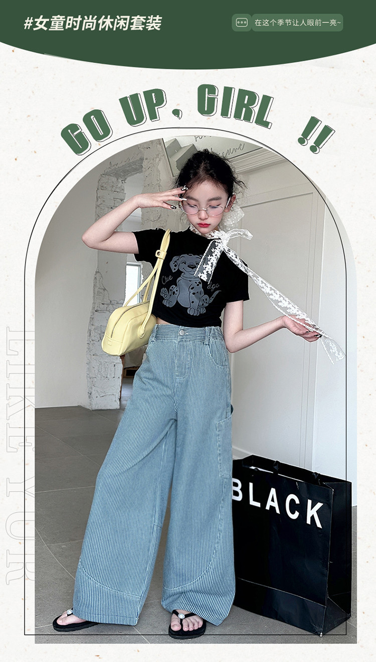 소녀 줄무늬 넓은 다리 바지 세트 여름 중국 어린이 미국 스타일 만화 반팔 티셔츠 청바지 유행 투피스 세트스토어 가기
