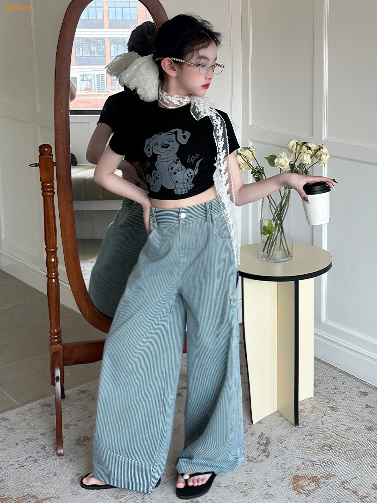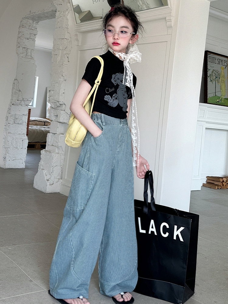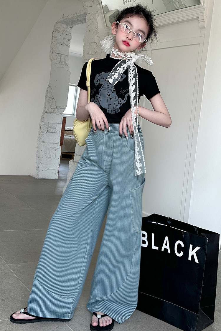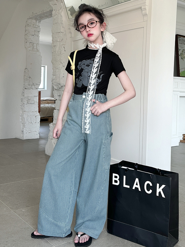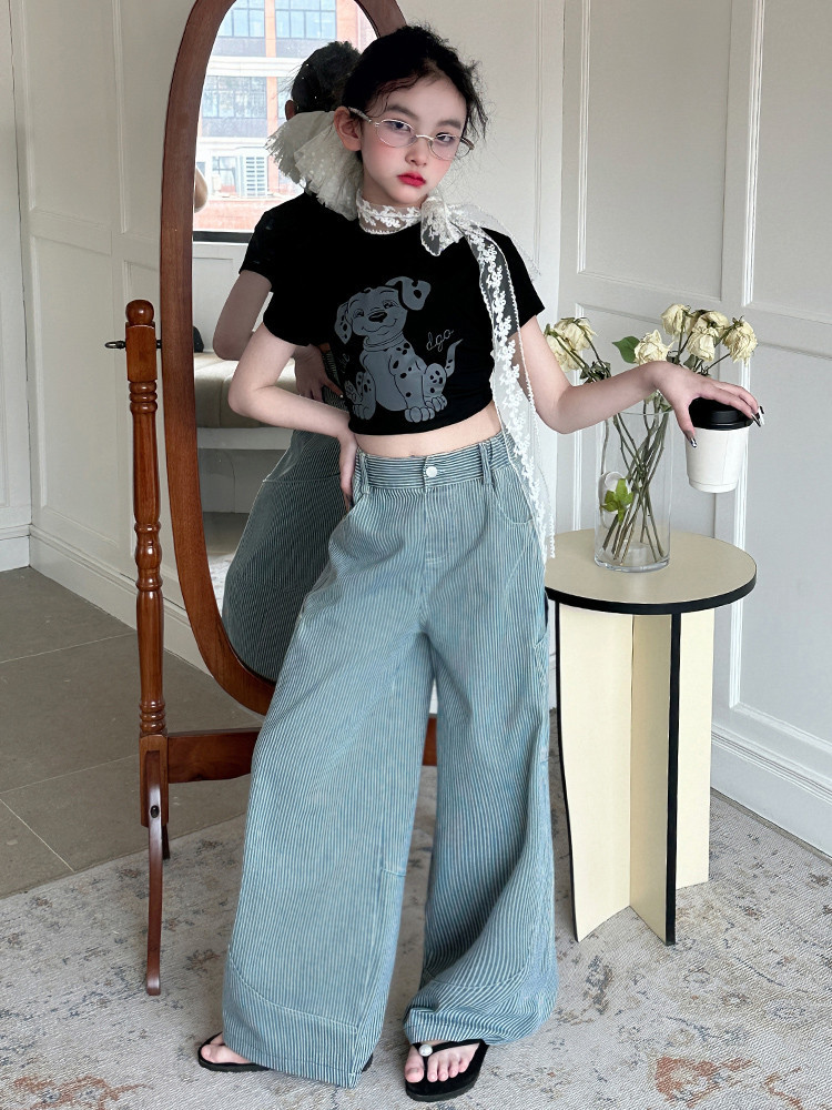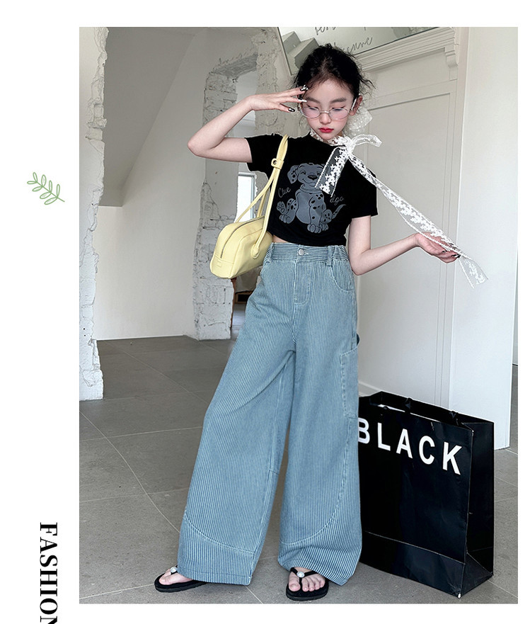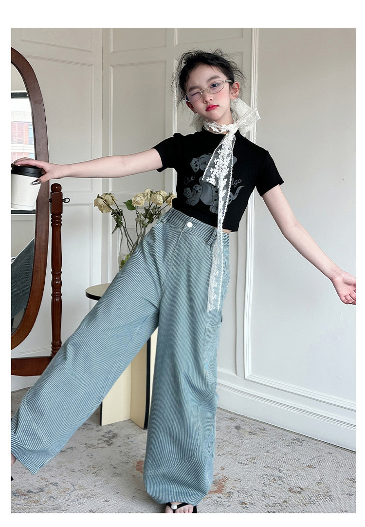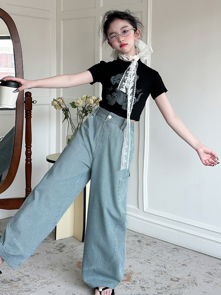 소녀 줄무늬 넓은 다리 바지 세트 여름 중국 어린이 미국 스타일 만화 반팔 티셔츠 청바지 유행 투피스 세트스토어 가기