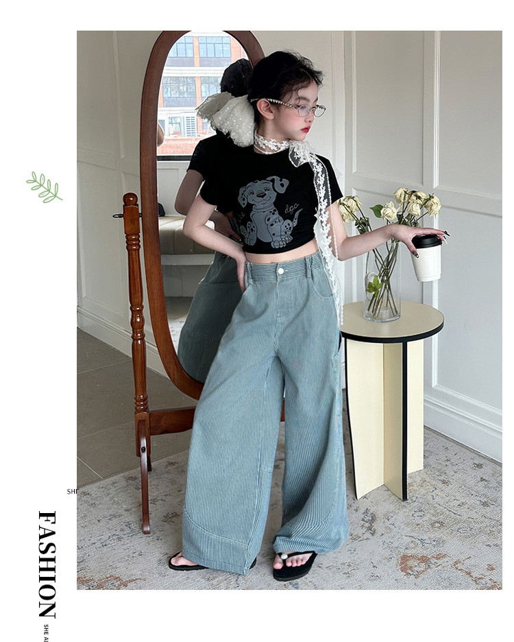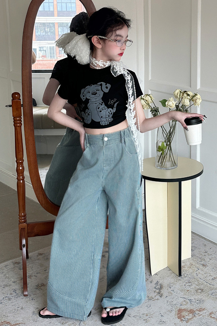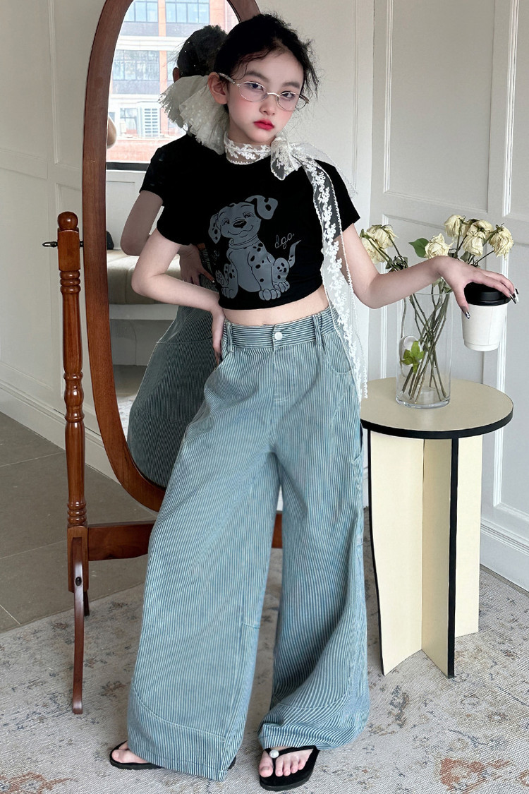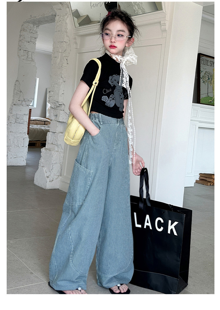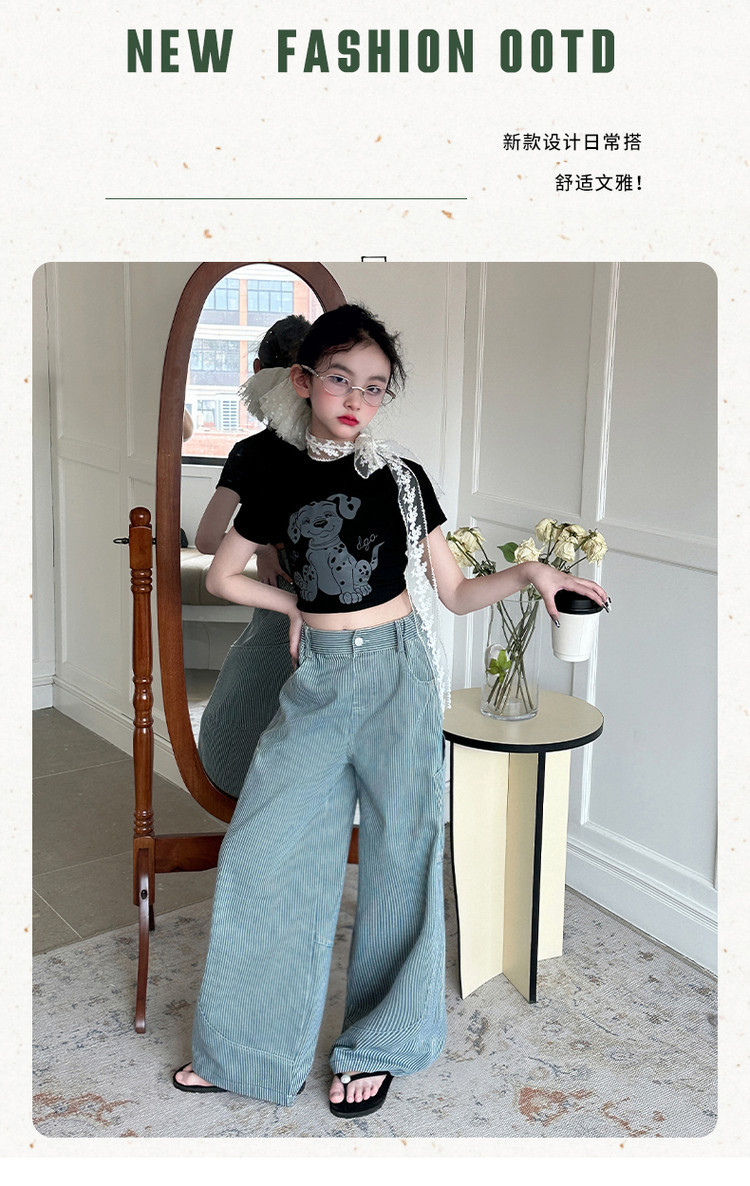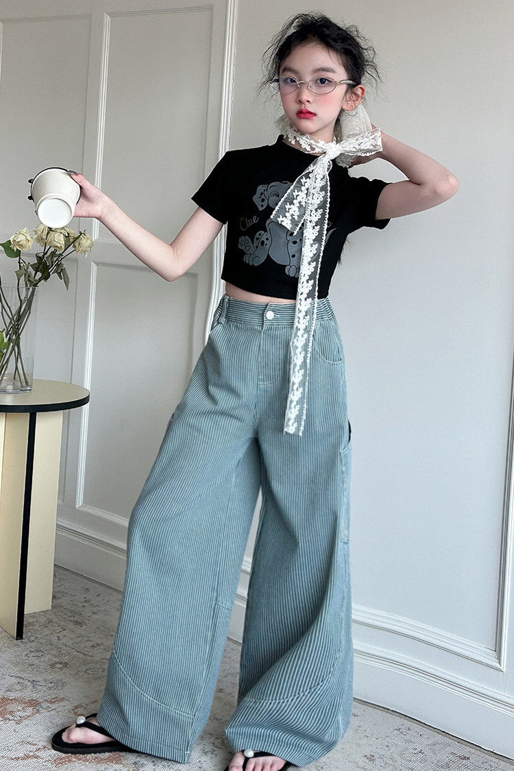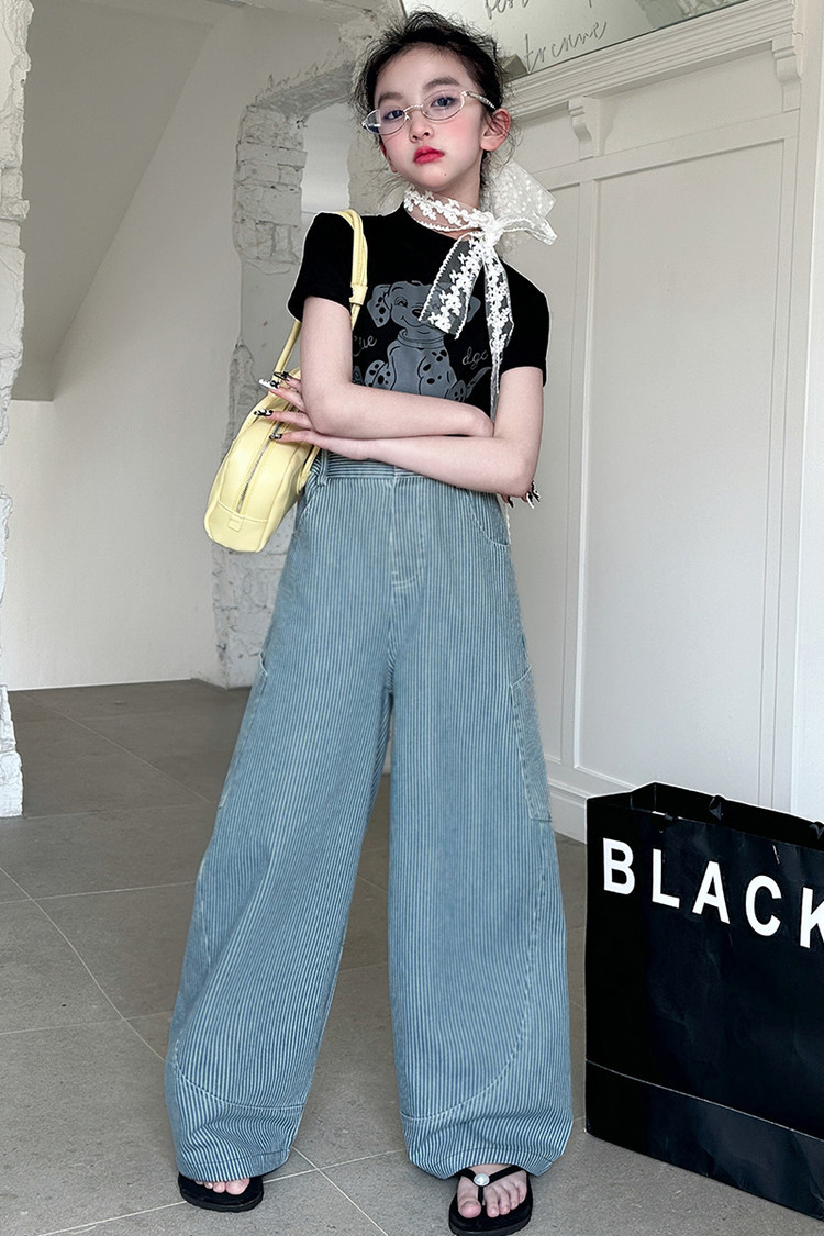 소녀 줄무늬 넓은 다리 바지 세트 여름 중국 어린이 미국 스타일 만화 반팔 티셔츠 청바지 유행 투피스 세트스토어 가기