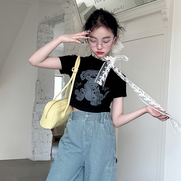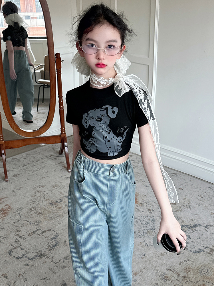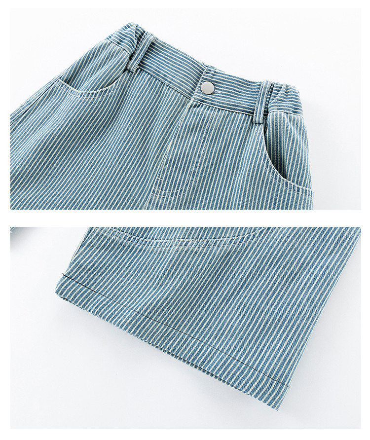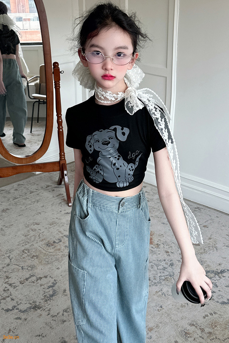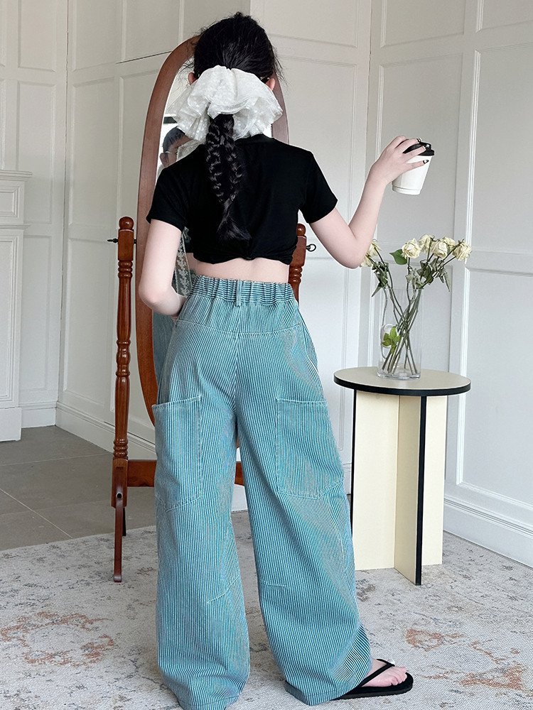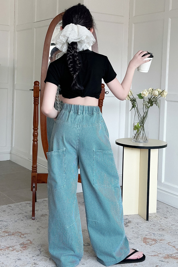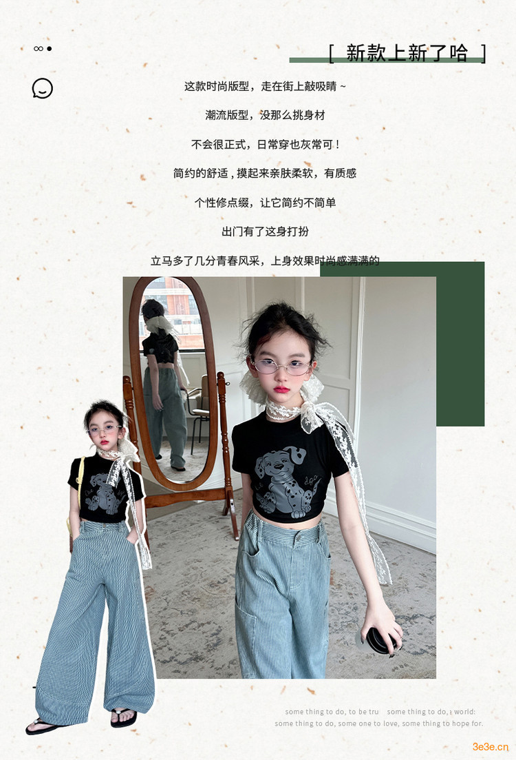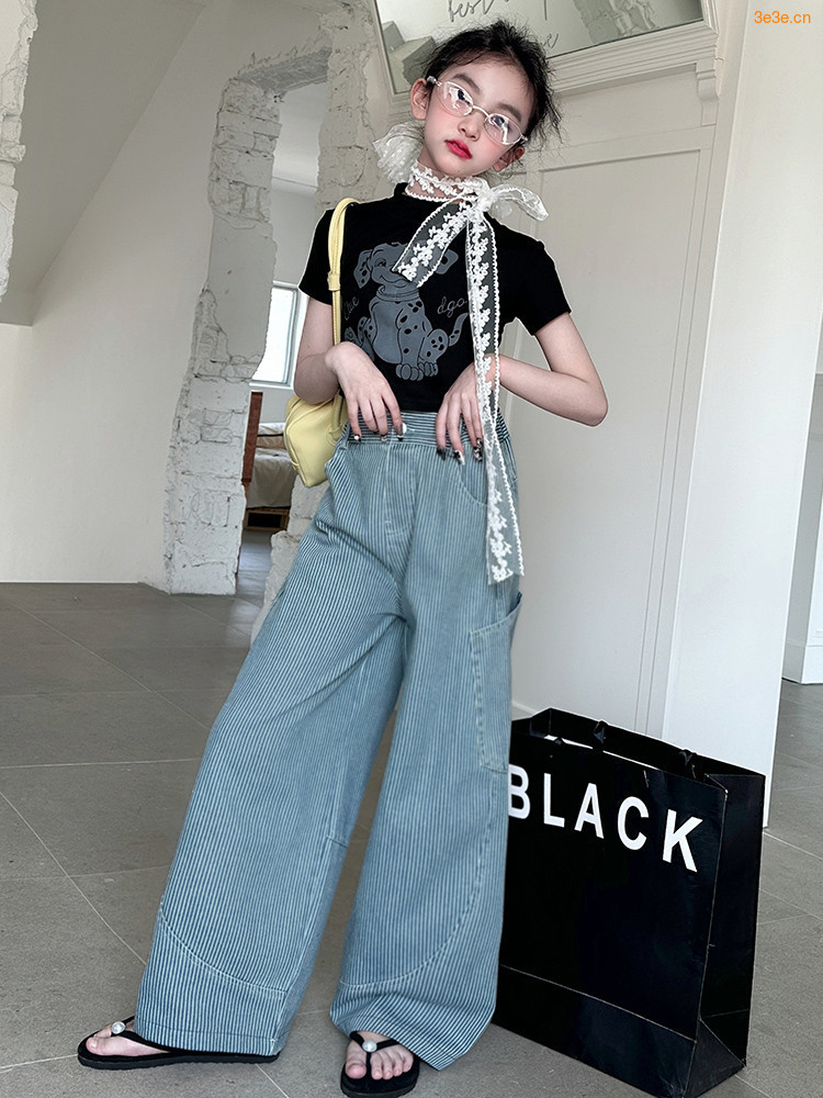 소녀 줄무늬 넓은 다리 바지 세트 여름 중국 어린이 미국 스타일 만화 반팔 티셔츠 청바지 유행 투피스 세트스토어 가기