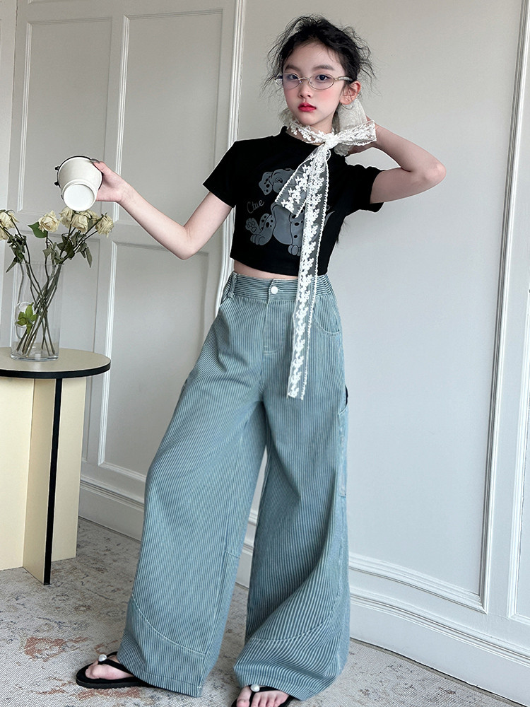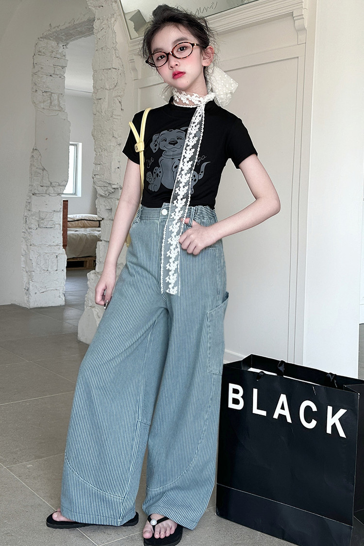 소녀 줄무늬 넓은 다리 바지 세트 여름 중국 어린이 미국 스타일 만화 반팔 티셔츠 청바지 유행 투피스 세트