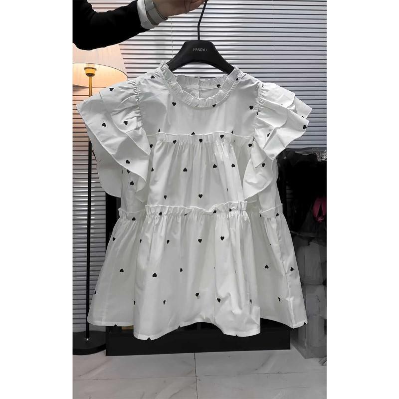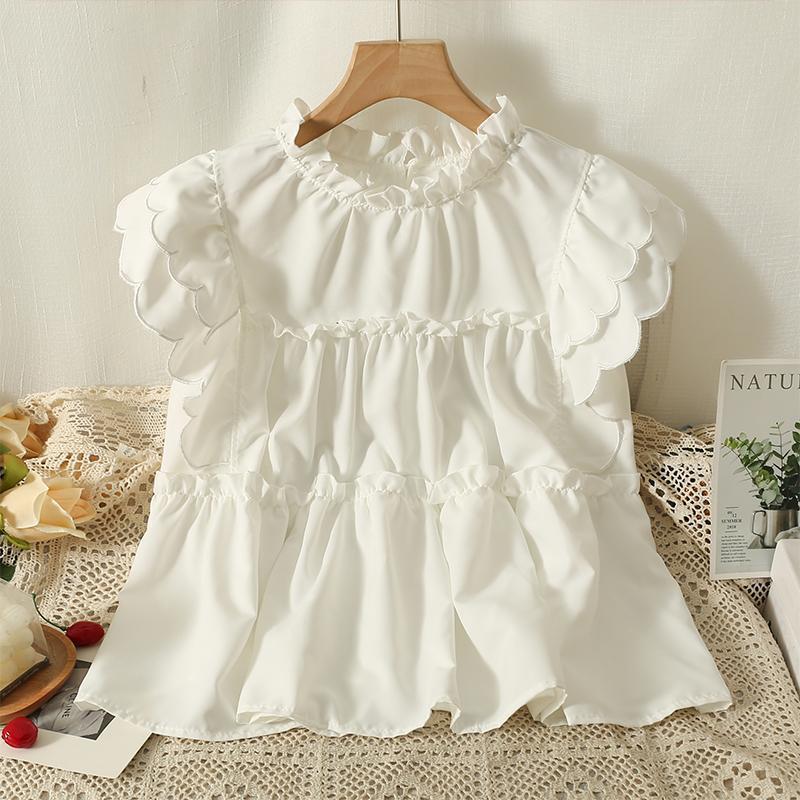 2025 새로운 여성의 여름 작은 비행 소매 셔츠 여성 디자인 센스 틈새 느슨한 귀 가장자리 인형 셔츠 탑