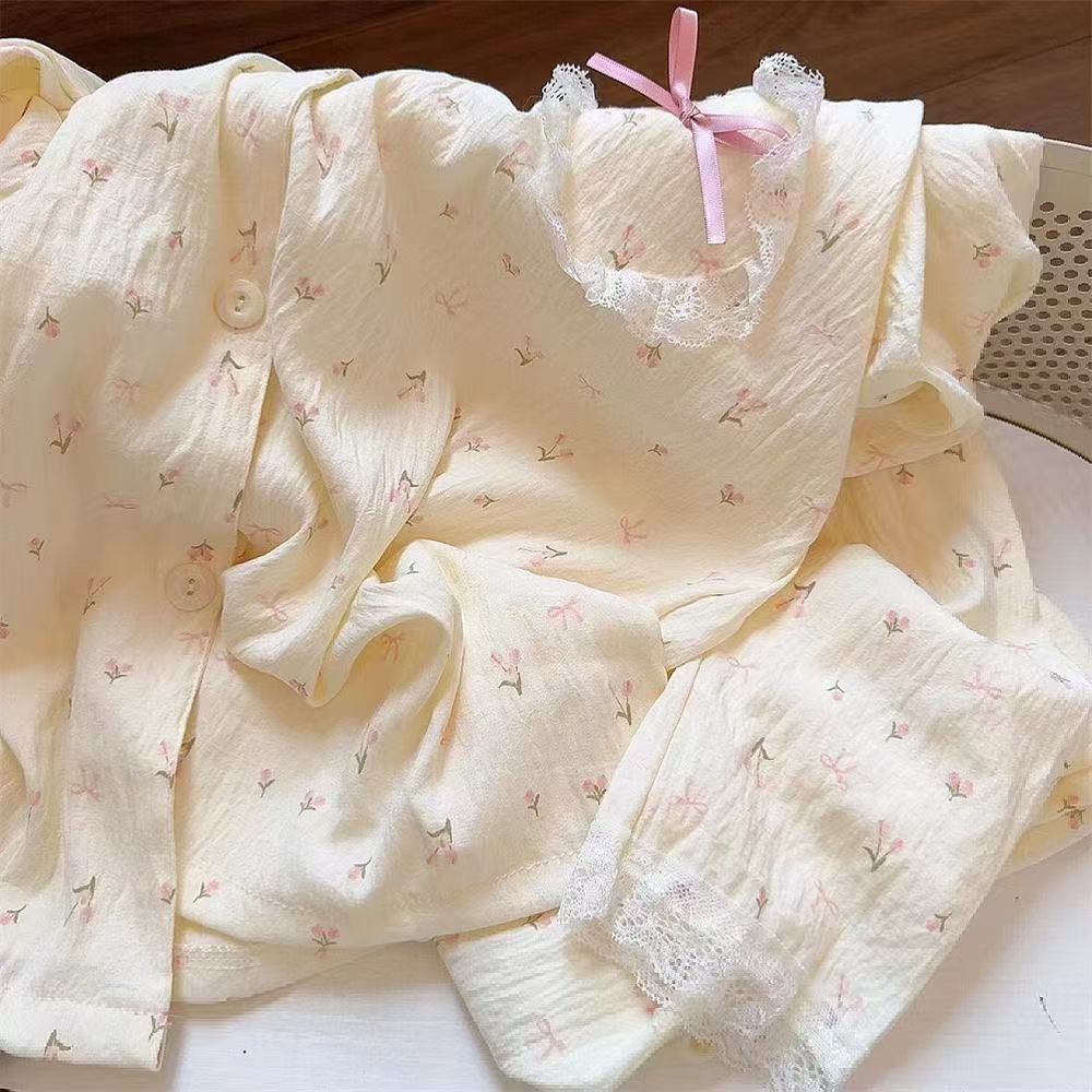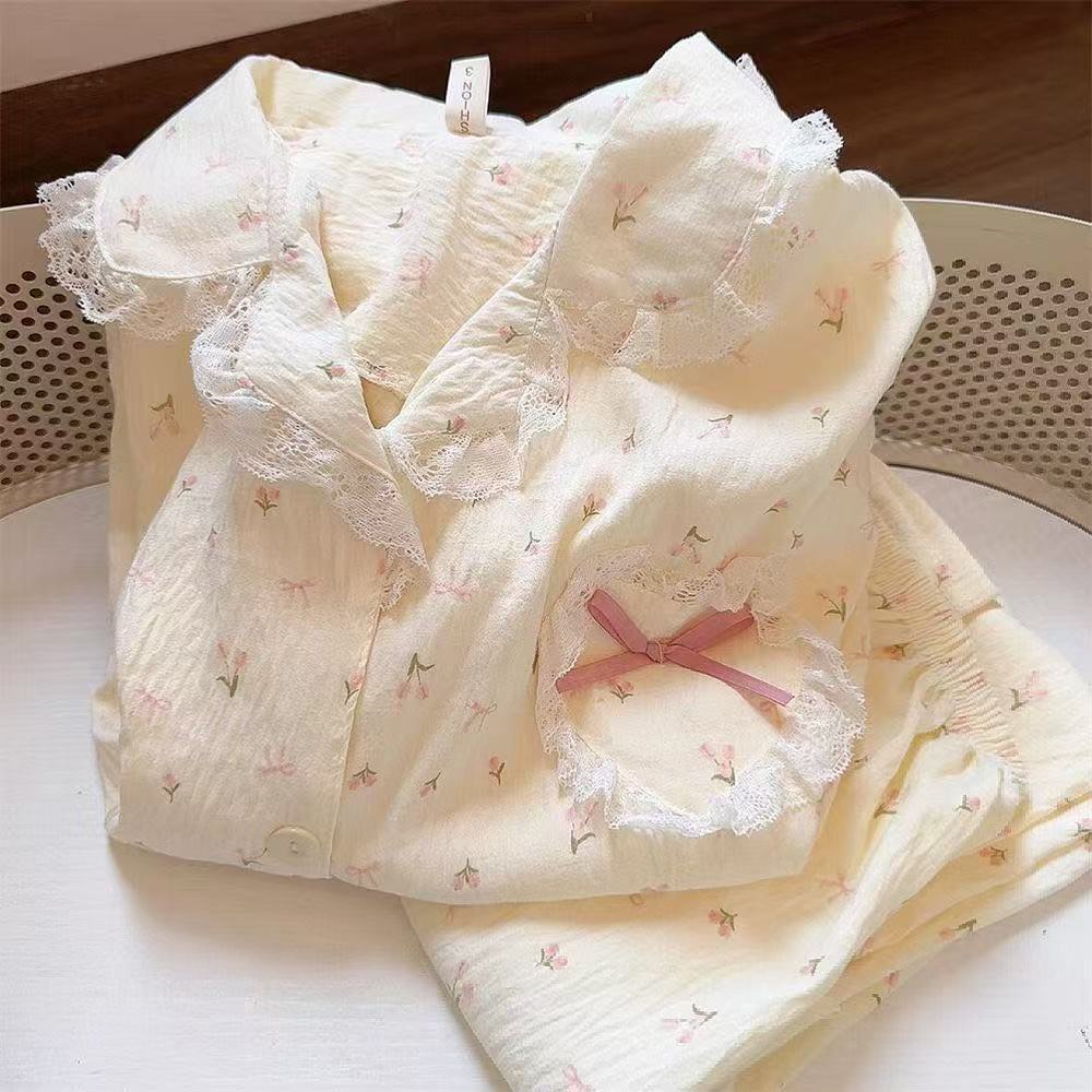 일본 꽃 잠옷 여성의 봄과 가을 새로운 구름면 귀여운 레이스 카디건 긴 소매 바지 홈 의류 세트