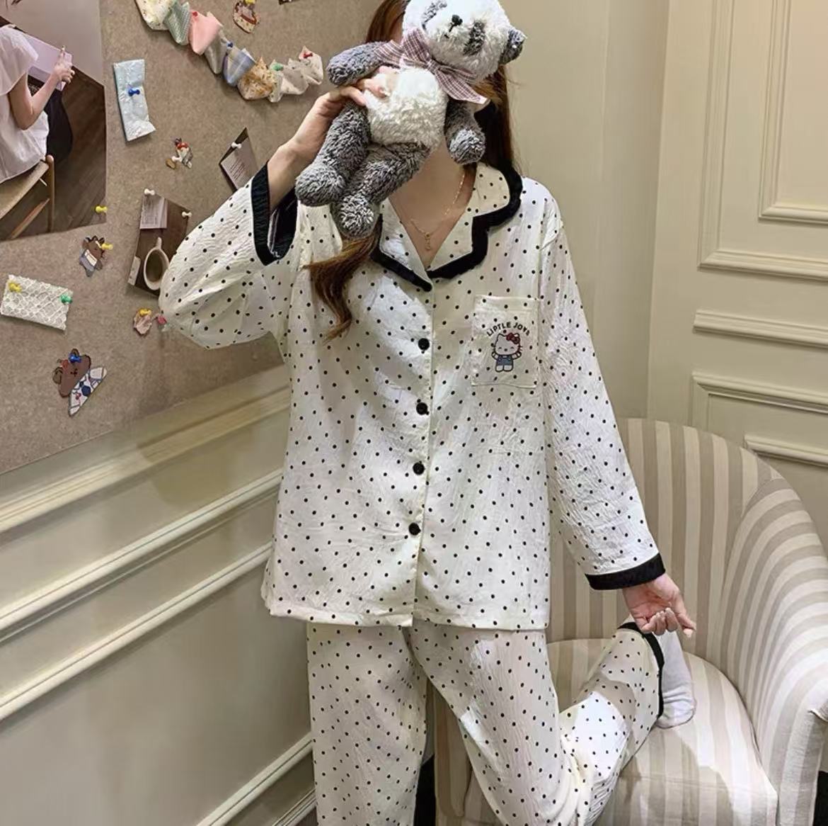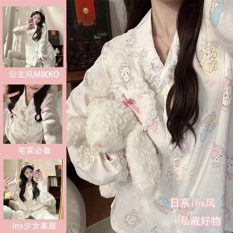 일본 꽃 잠옷 여성의 봄과 가을 새로운 구름면 귀여운 레이스 카디건 긴 소매 바지 홈 의류 세트스토어 가기