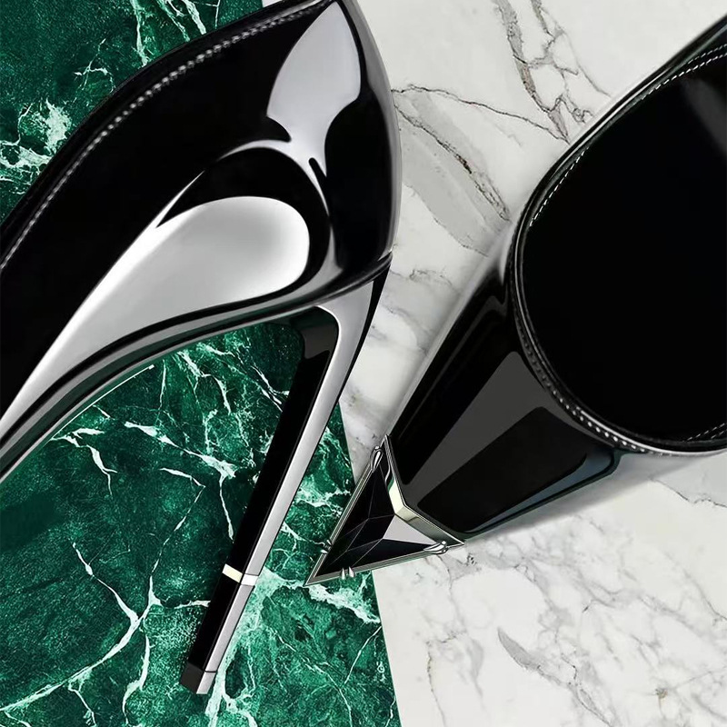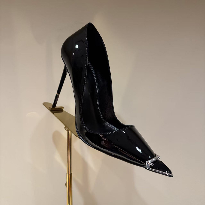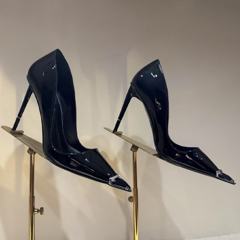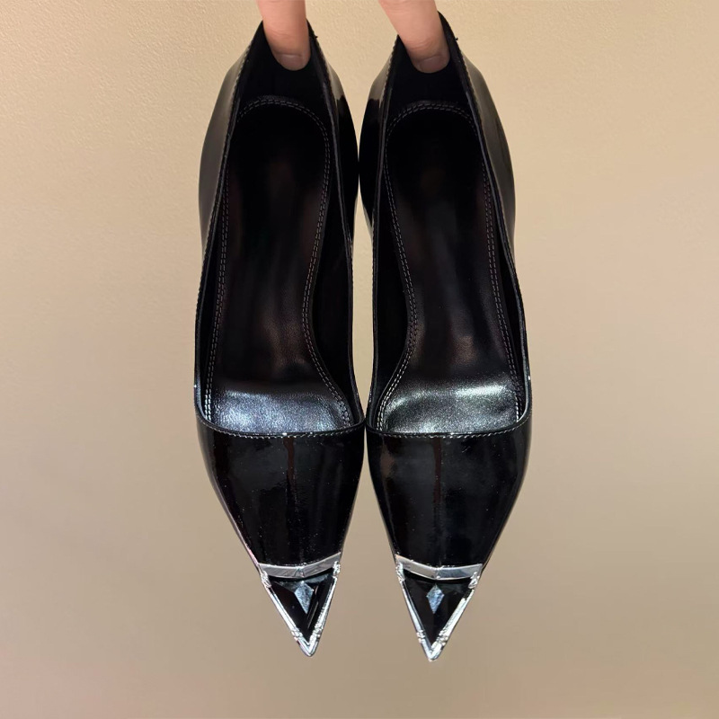 광저우 여성용 블랙 래커 가죽 실버 장식 블랙 오닉스 하이힐 슈즈, 우아하고 다재다능한 스틸레토 힐, 봄 여름 쇼케이스용 초하이힐스토어 가기