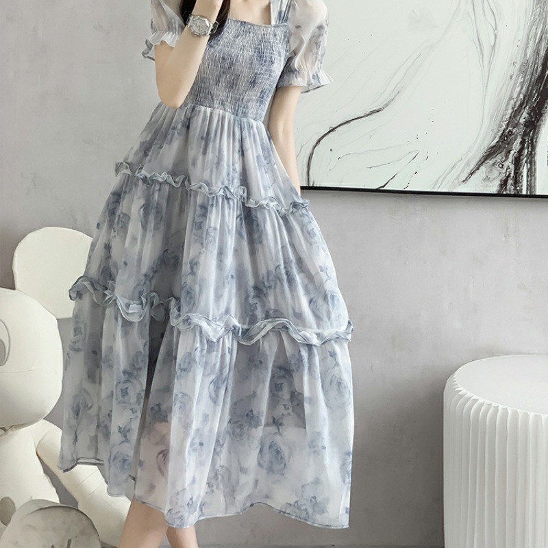 차 차 스타일 꽃 원피스 여성 여름 2025 새로운 프랑스 스타일 허리 긴 원피스 요정 스타일 슈퍼 요정 스타일