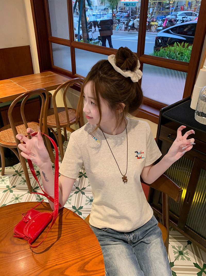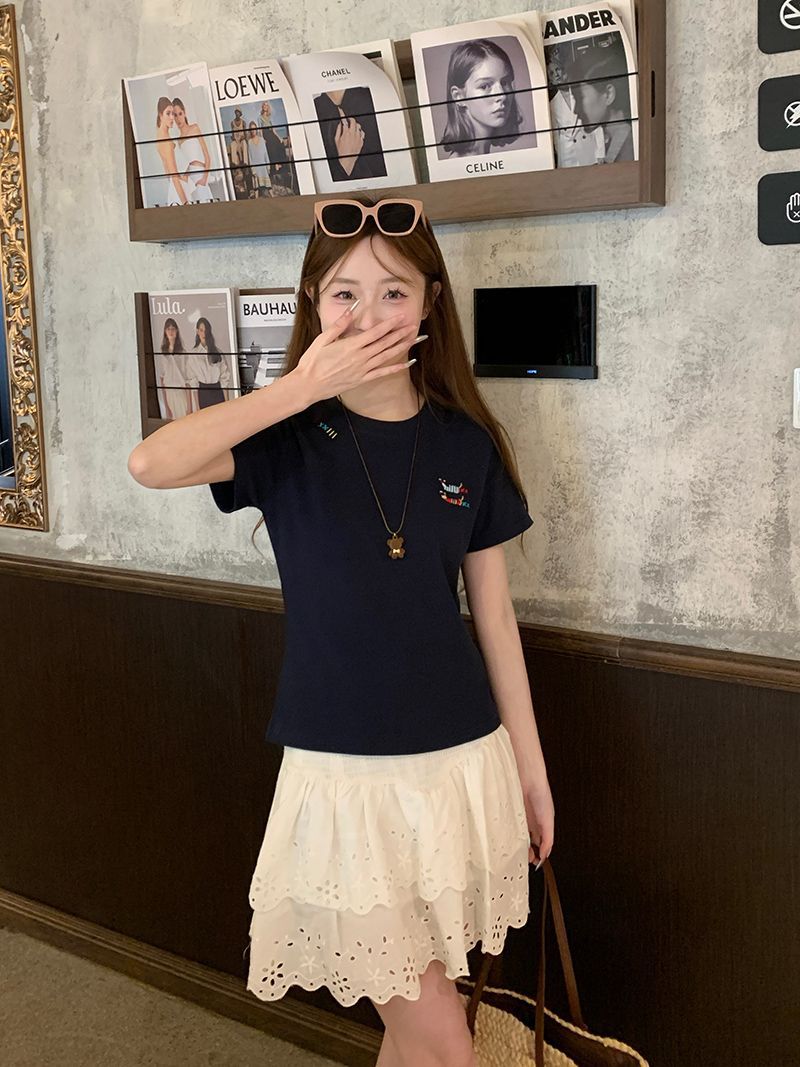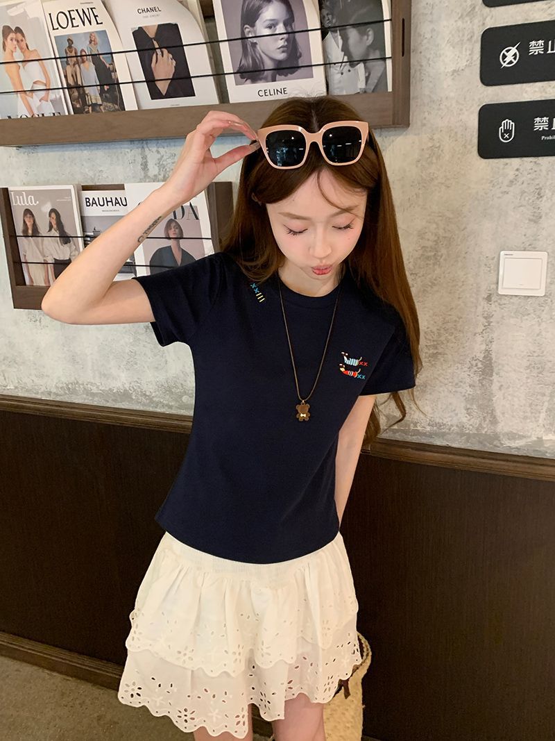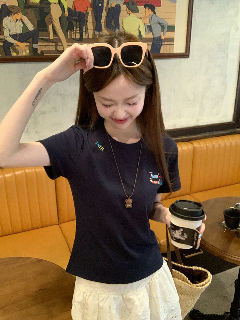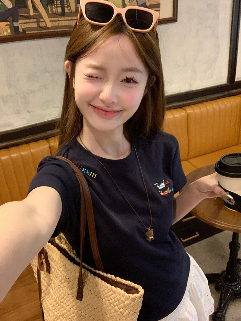 유럽 상품 앞 어깨 자수 반팔 티셔츠 여성 2025 년 여름 새로운 짧은 소녀 탑 디자인 감각 슬림 핏 탑 인스토어 가기