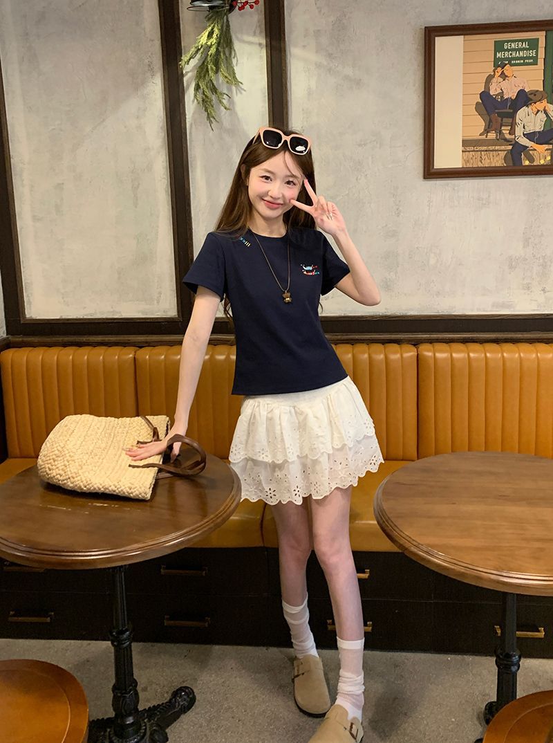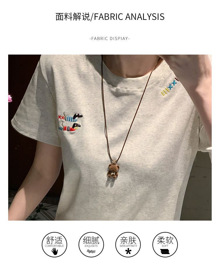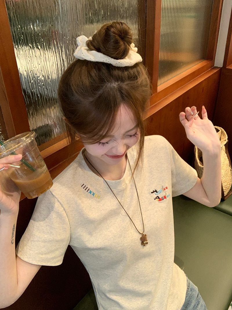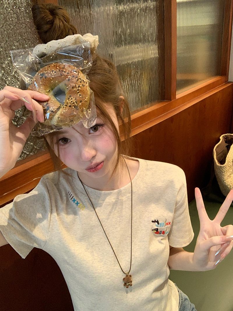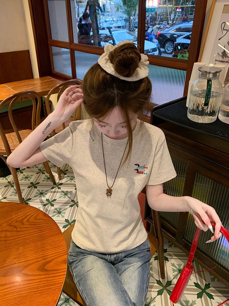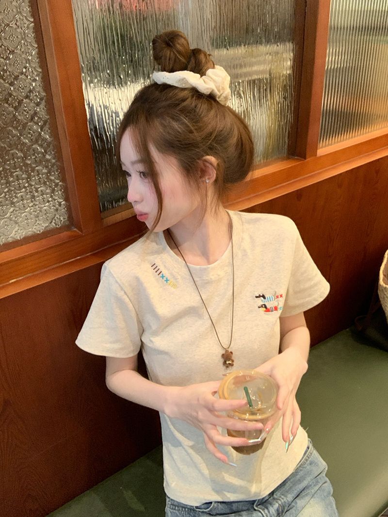 유럽 상품 앞 어깨 자수 반팔 티셔츠 여성 2025 년 여름 새로운 짧은 소녀 탑 디자인 감각 슬림 핏 탑 인스토어 가기