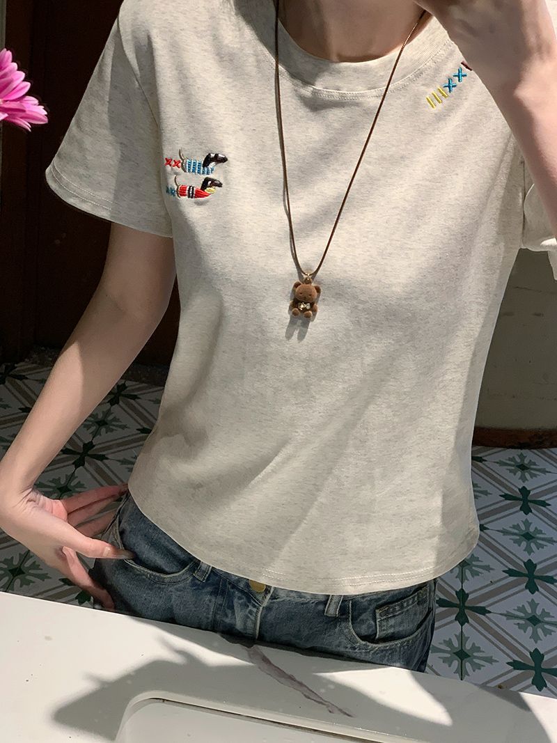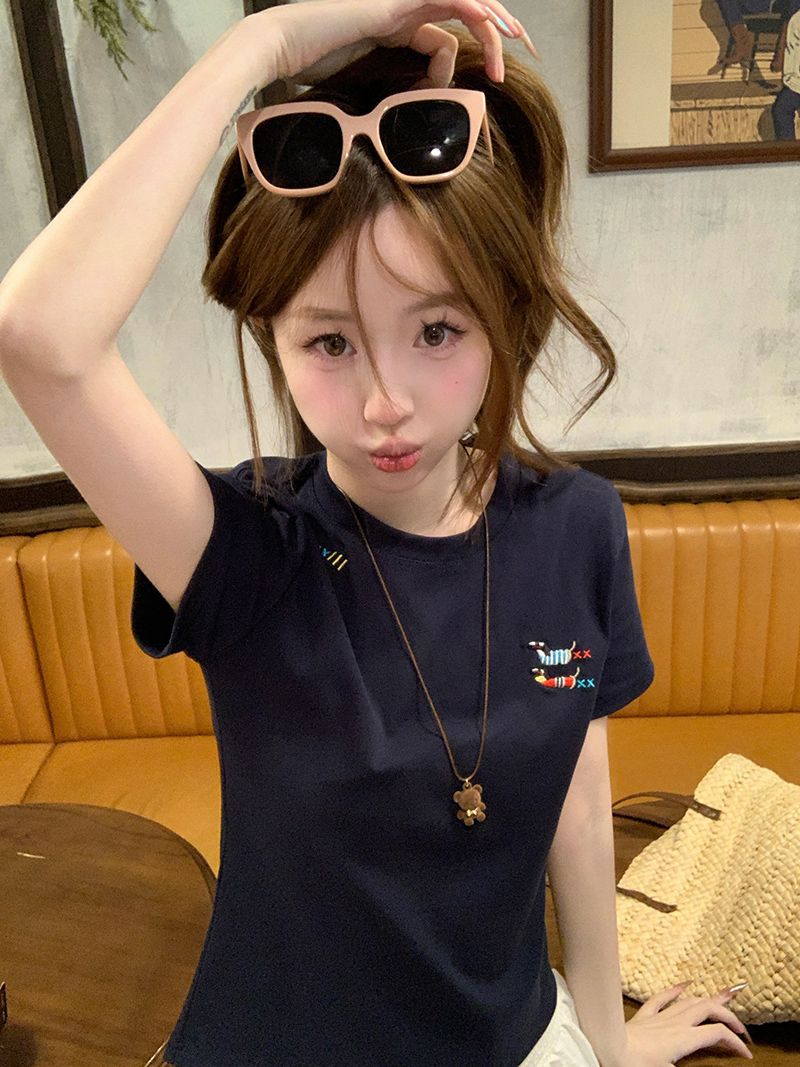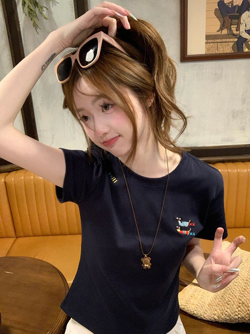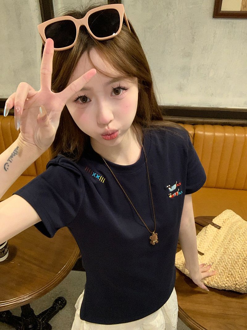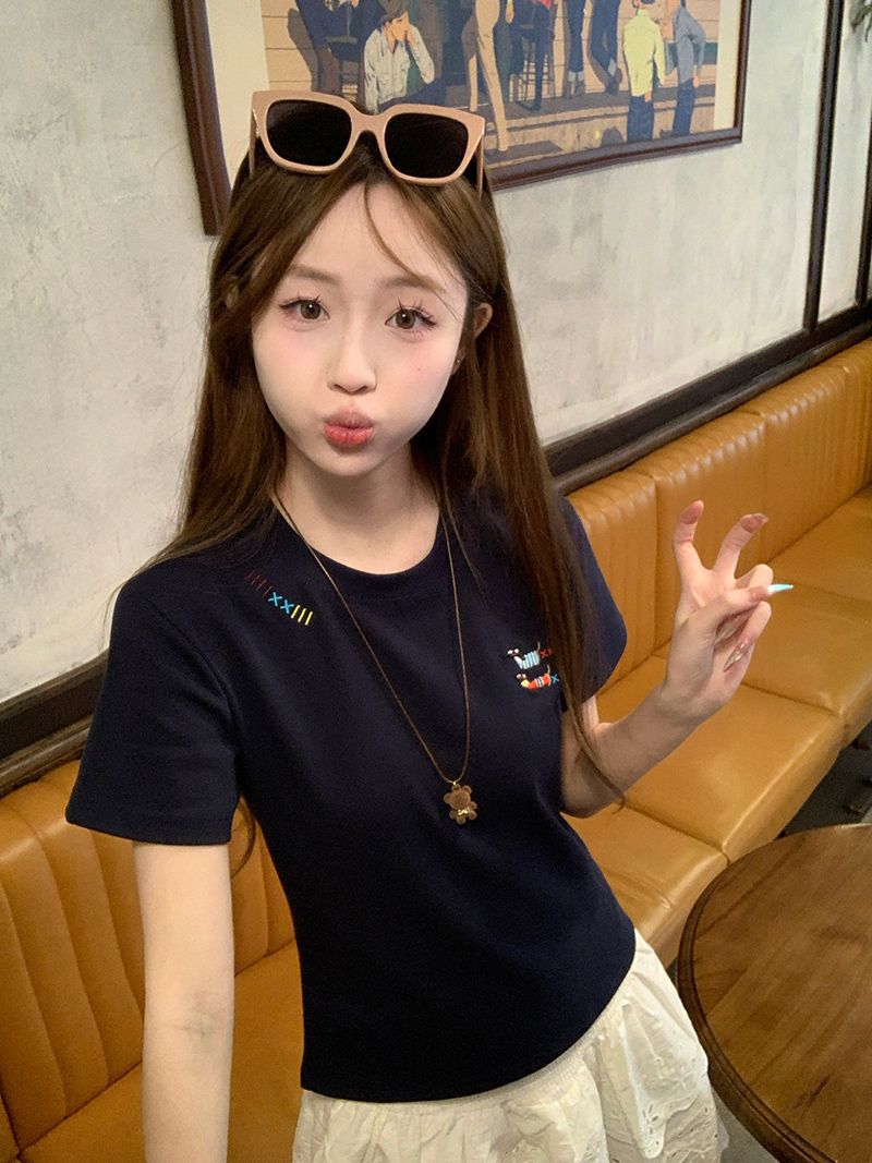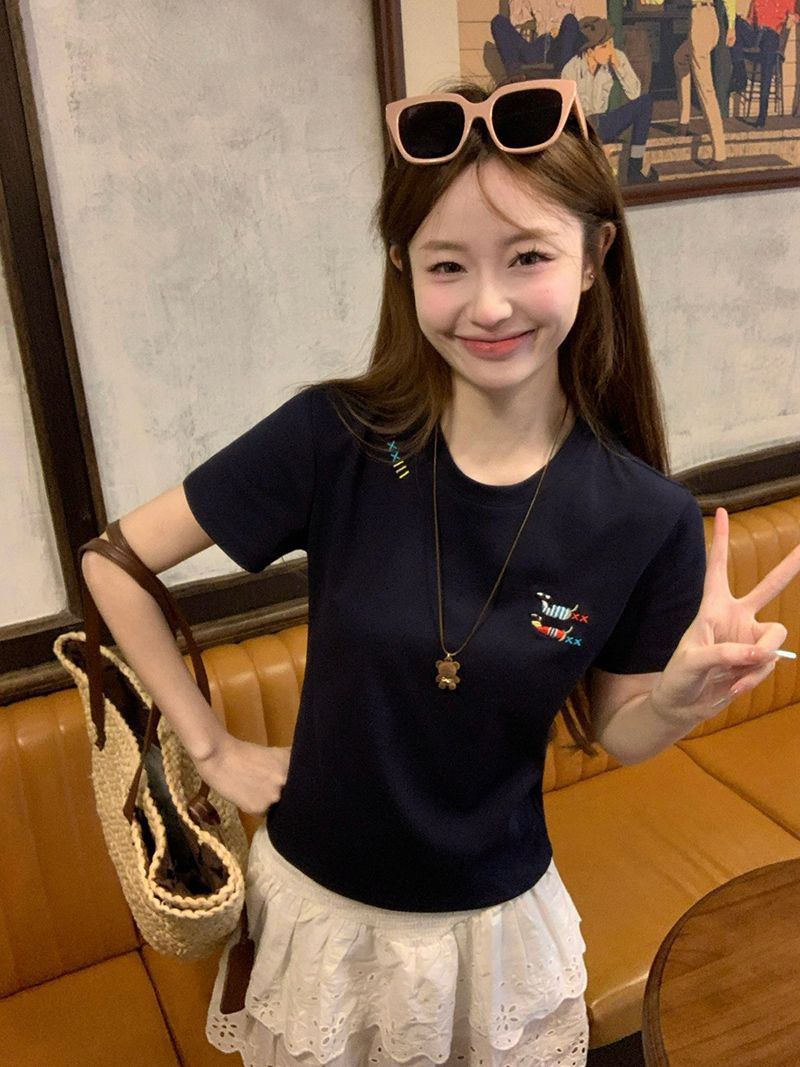 유럽 상품 앞 어깨 자수 반팔 티셔츠 여성 2025 년 여름 새로운 짧은 소녀 탑 디자인 감각 슬림 핏 탑 인