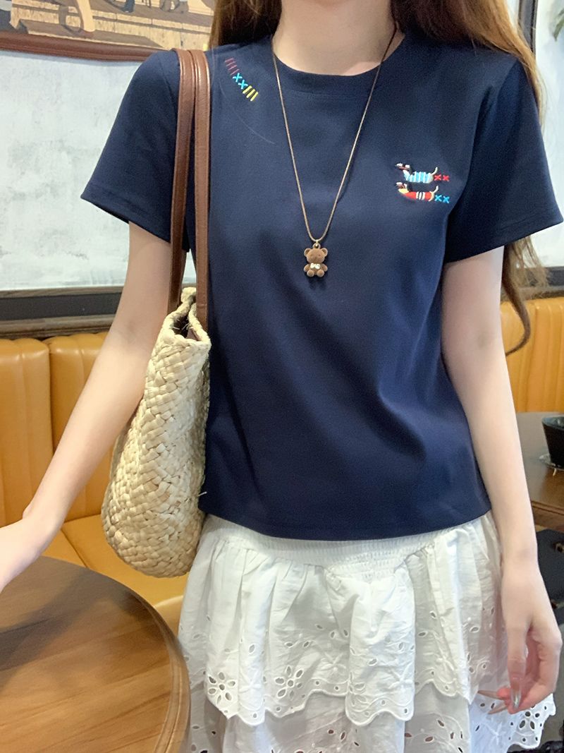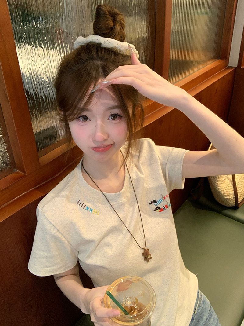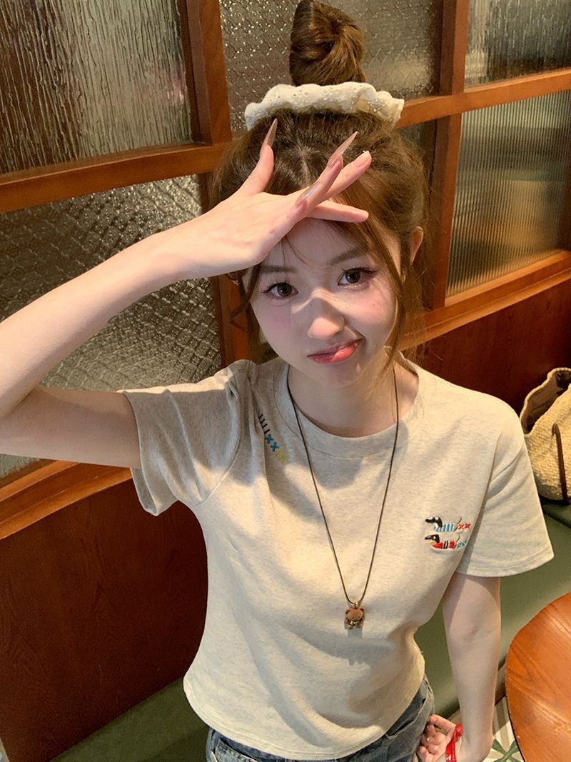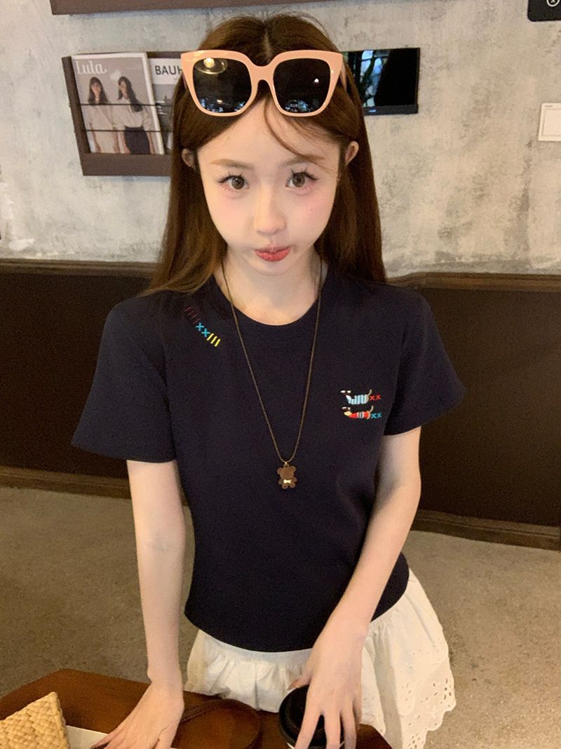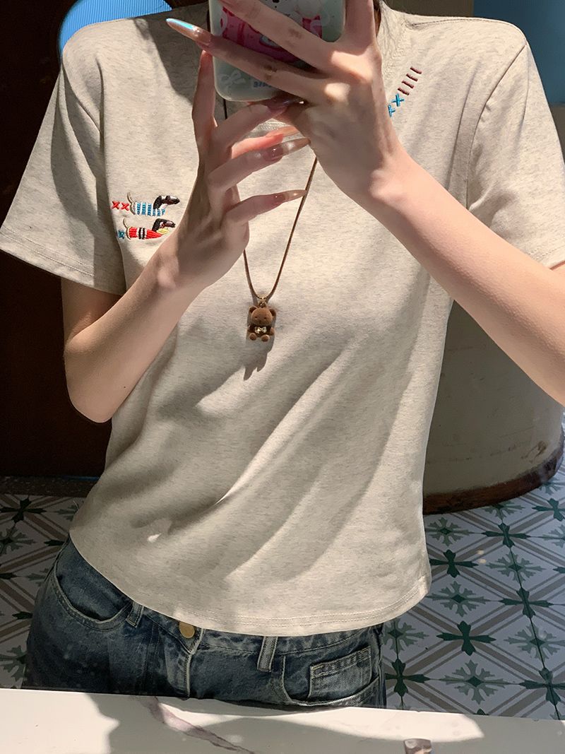 유럽 상품 앞 어깨 자수 반팔 티셔츠 여성 2025 년 여름 새로운 짧은 소녀 탑 디자인 감각 슬림 핏 탑 인