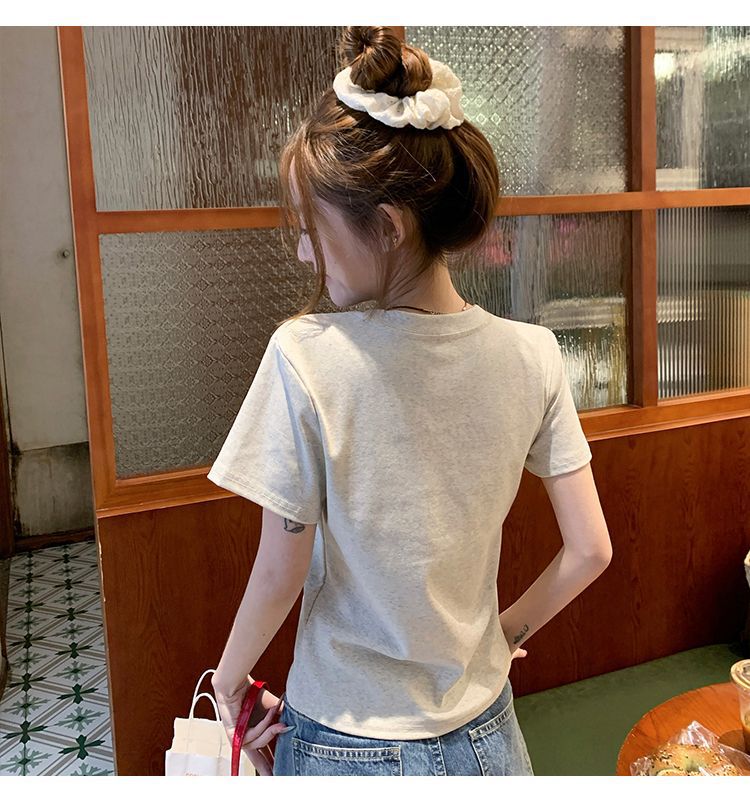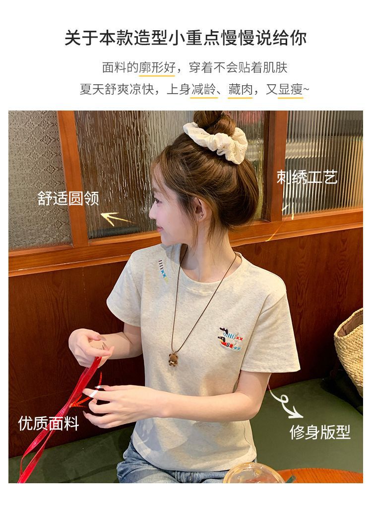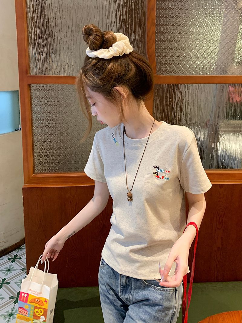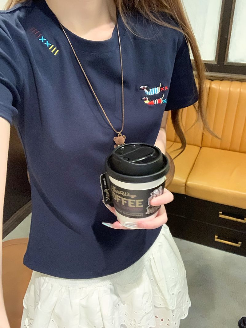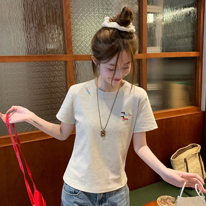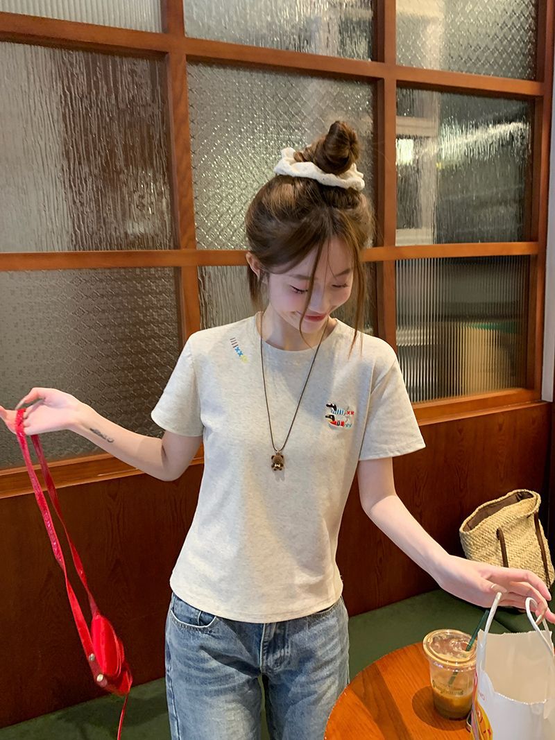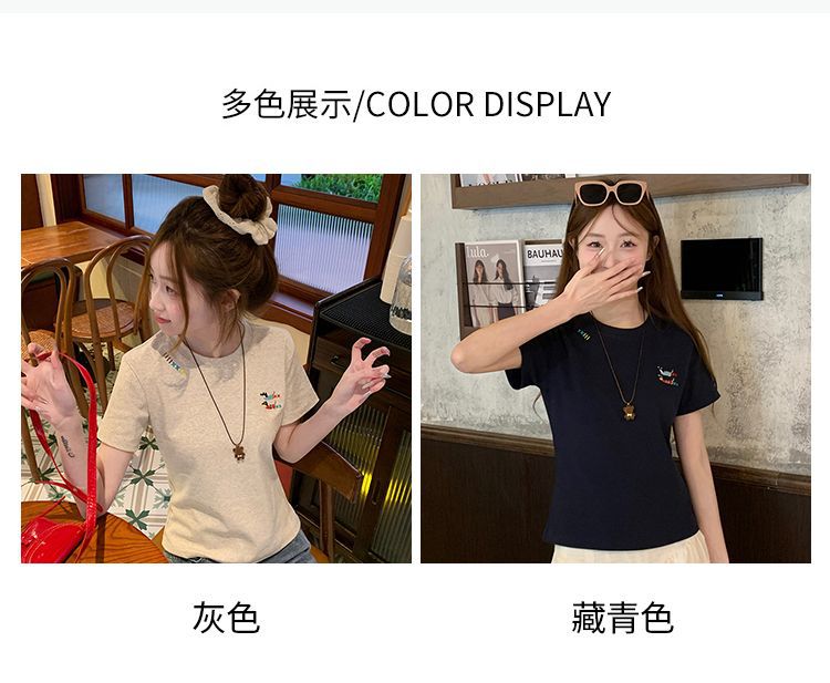 유럽 상품 앞 어깨 자수 반팔 티셔츠 여성 2025 년 여름 새로운 짧은 소녀 탑 디자인 감각 슬림 핏 탑 인