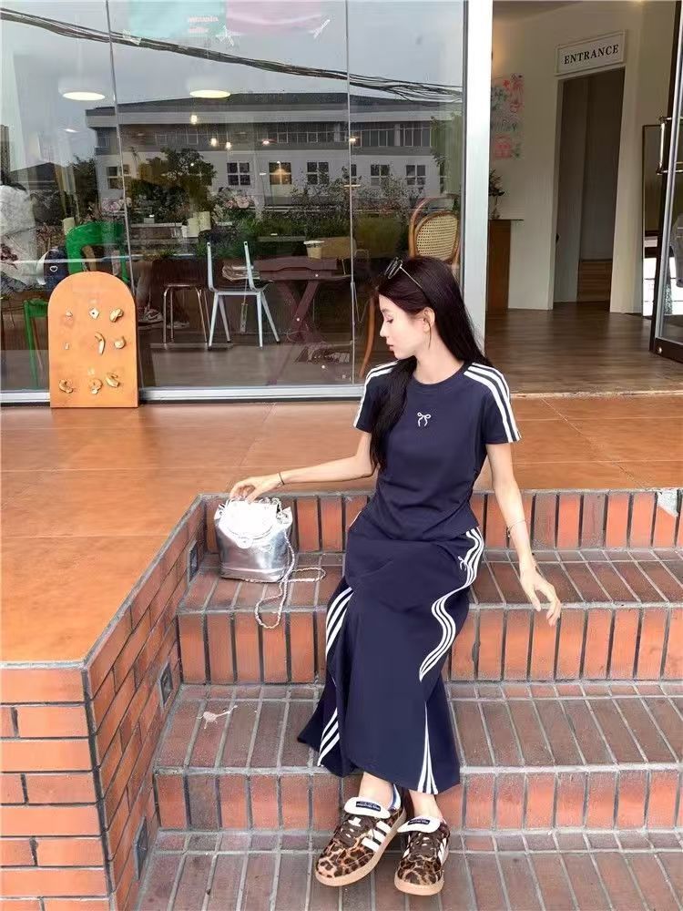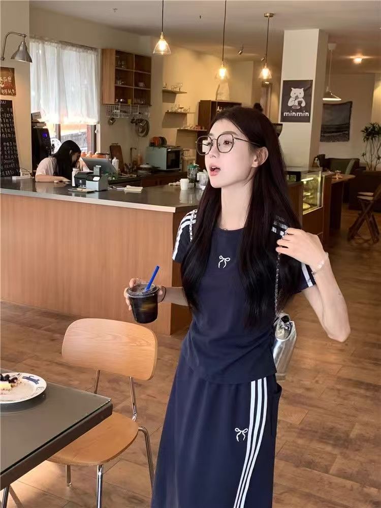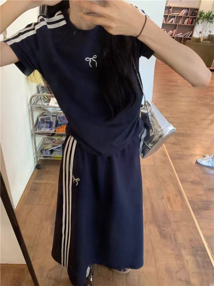 반소매 원피스 여성 여름 한국식 스포츠 레저 패션 3 바 반팔 티셔츠 스커트 투피스 세트