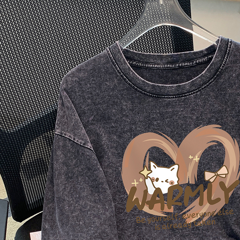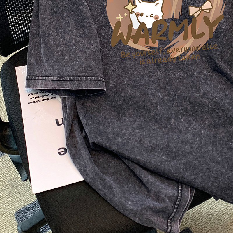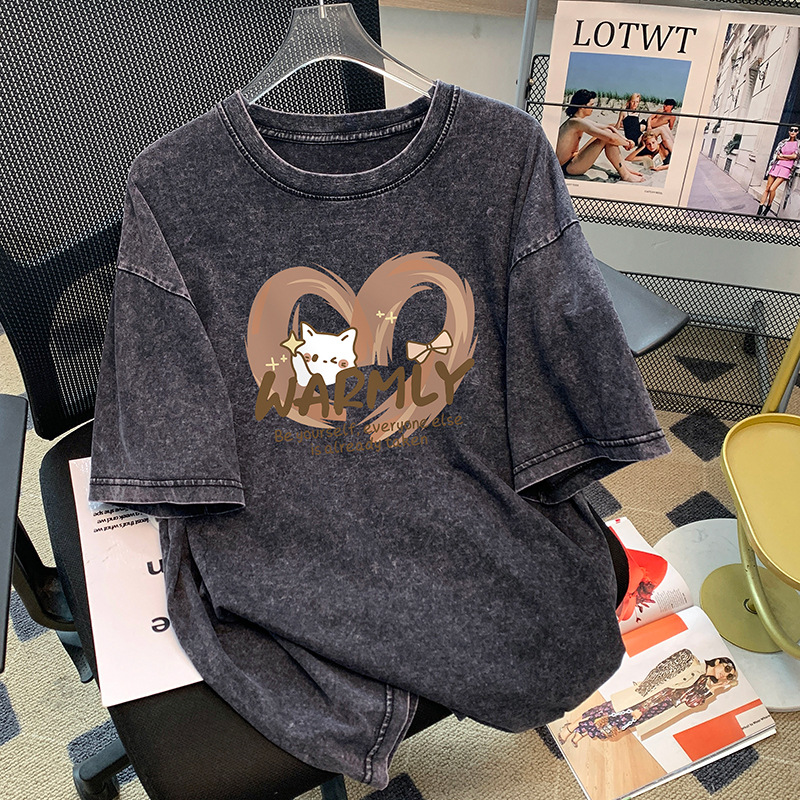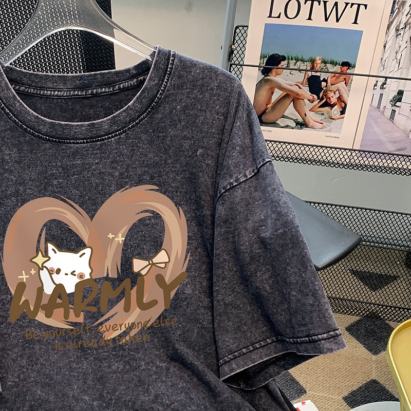 유럽과 미국의 빈티지 퓨어 코튼 반팔 티셔츠 여성용 트렌디 한 여름 아메리칸 스타일 복고풍 올드 루즈 탑 커플스토어 가기