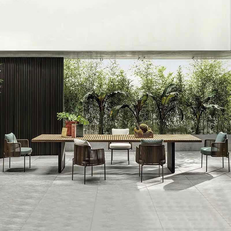 현대 간단한 금속 야외 가구 안뜰 야외 단단한 나무 차 테이블과 등나무 의자 캐주얼 하이 엔드 티크 식탁 식당 의자