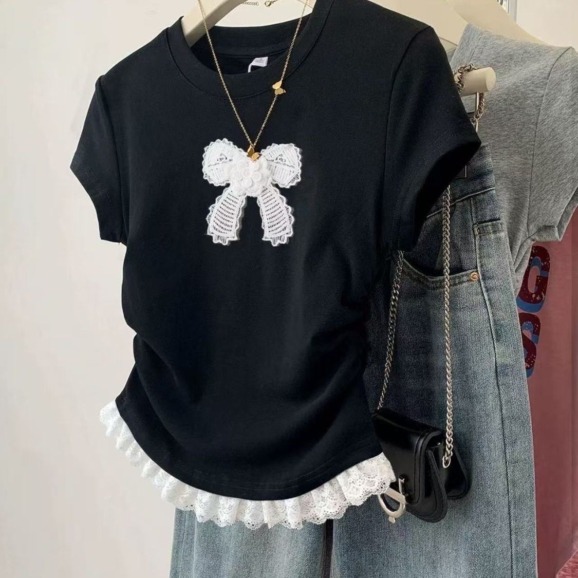 회색 활 레이스 수 놓은 짧은 소매 라운드 넥 여름 새로운 디자인 슬림핏 슬리밍 짧은 스파이스 소녀스토어 가기