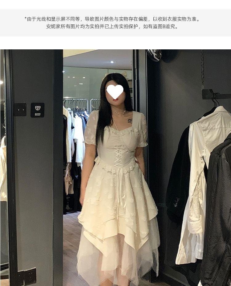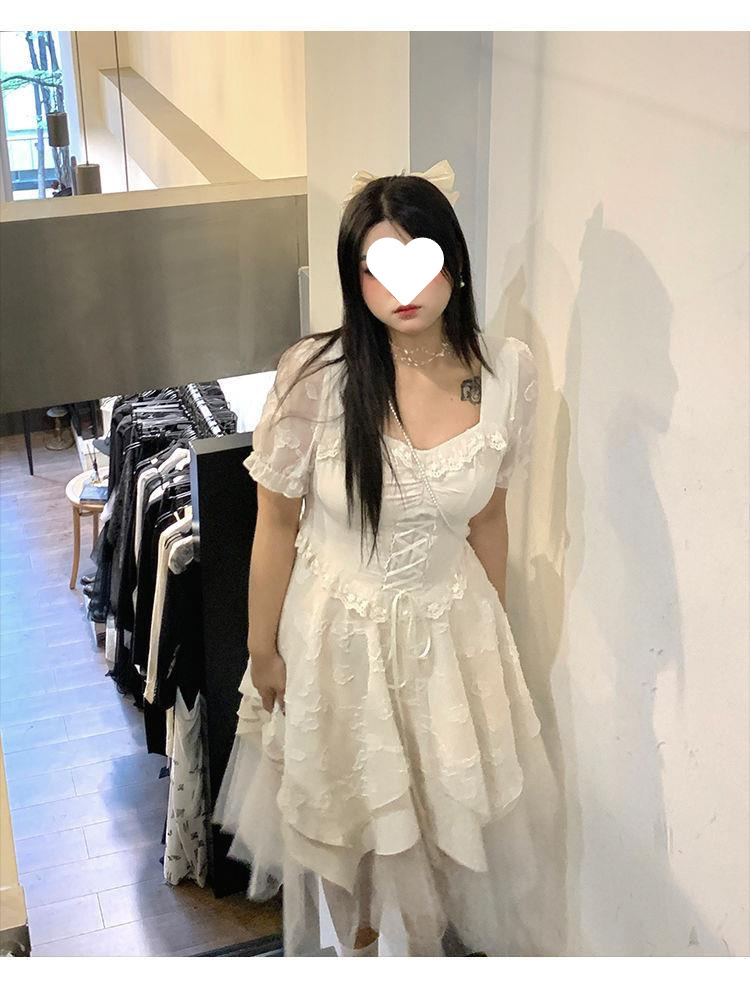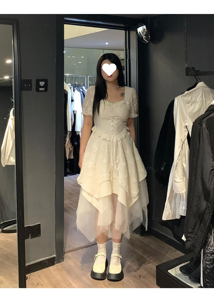 불규칙한 차 브레이크 스커트 여자 2025 년 여름 새로운 약간의 뚱뚱한 광장 칼라 스커트 하이 엔드 반팔 원피스