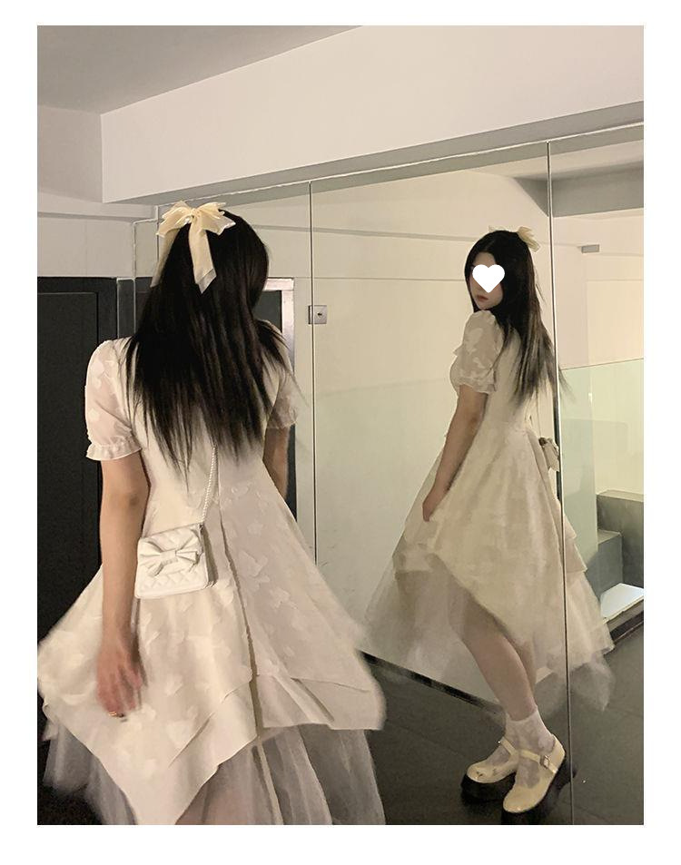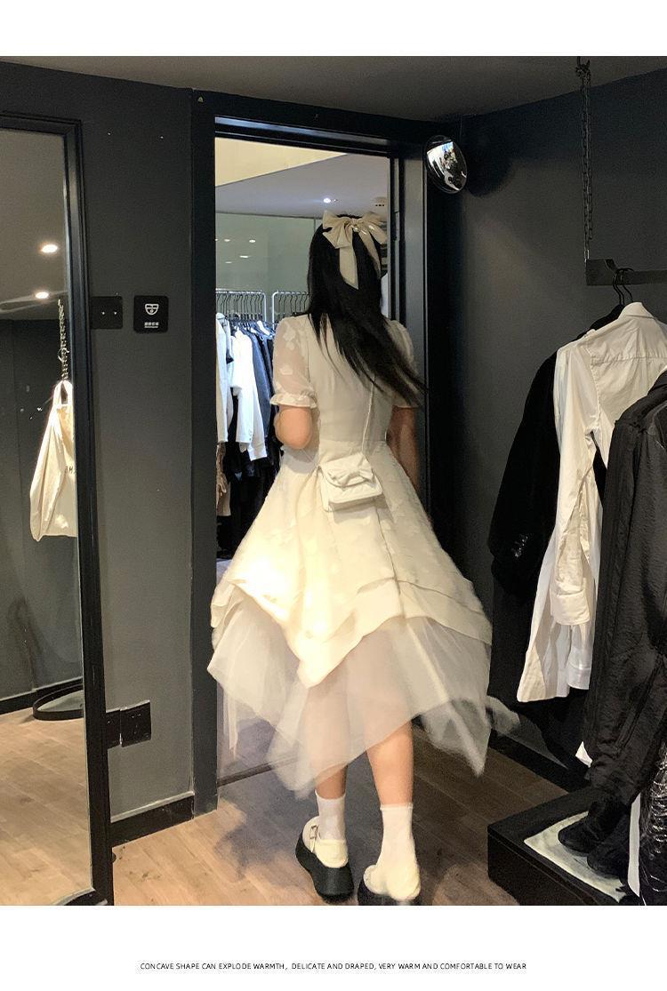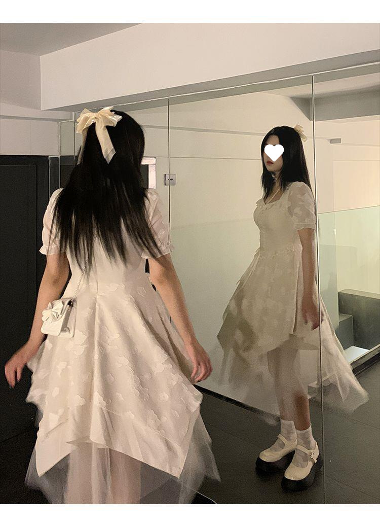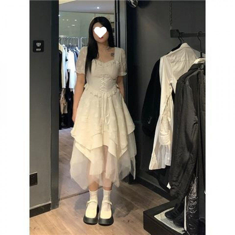 불규칙한 차 브레이크 스커트 여자 2025 년 여름 새로운 약간의 뚱뚱한 광장 칼라 스커트 하이 엔드 반팔 원피스스토어 가기
