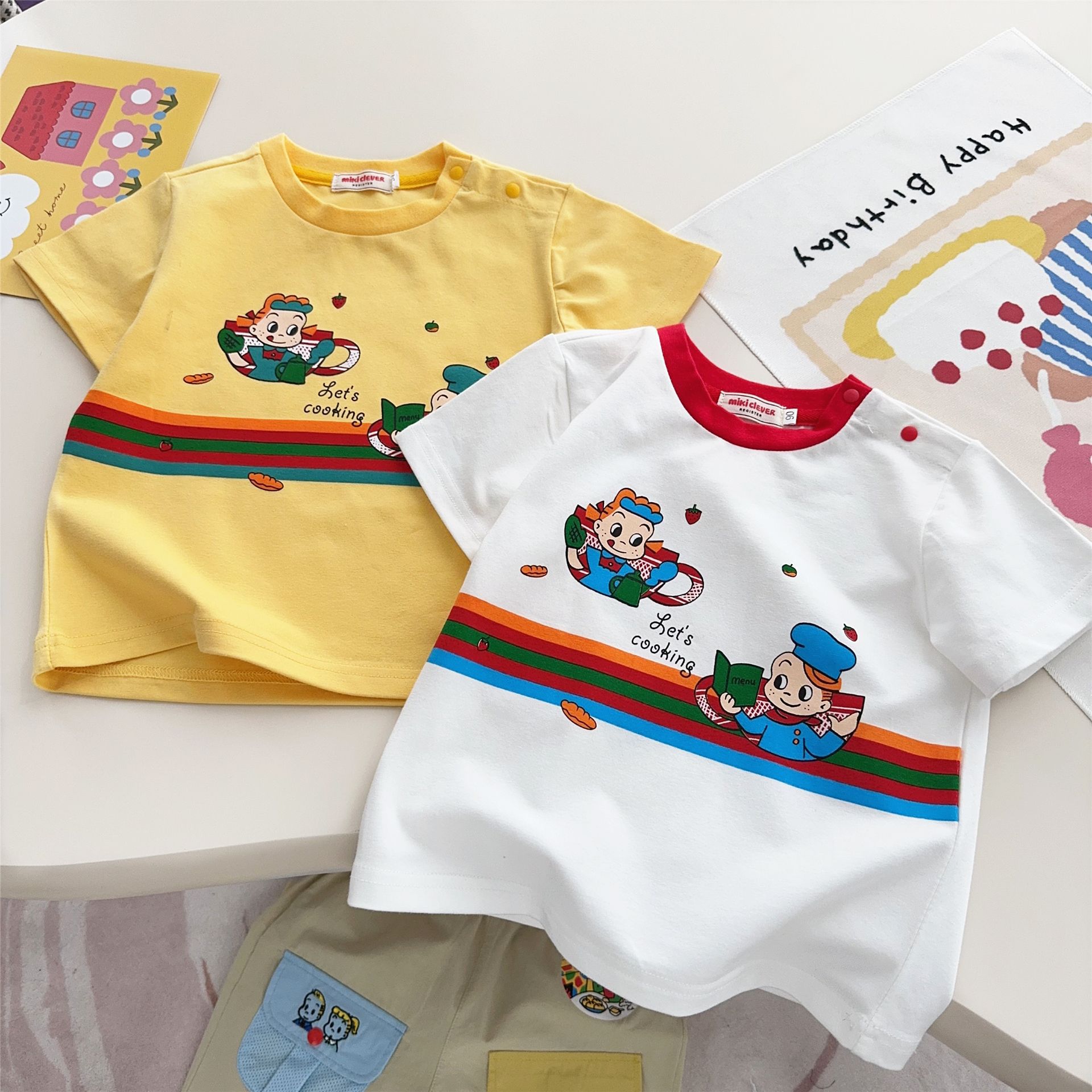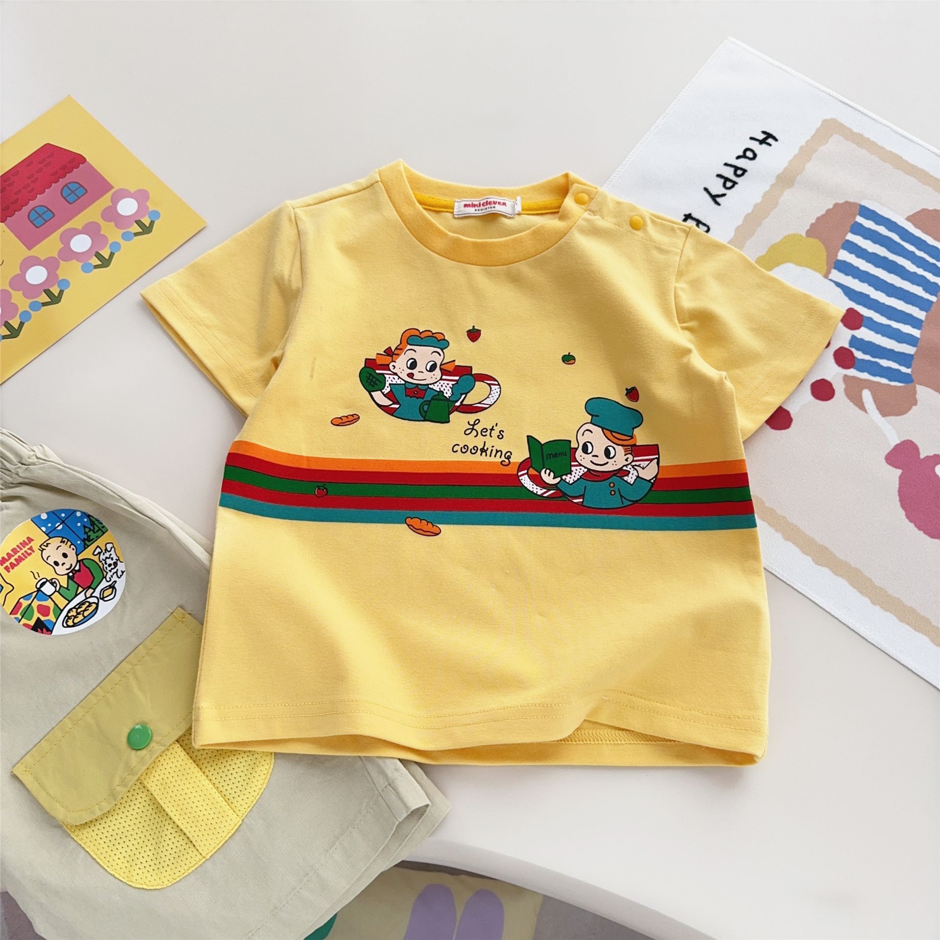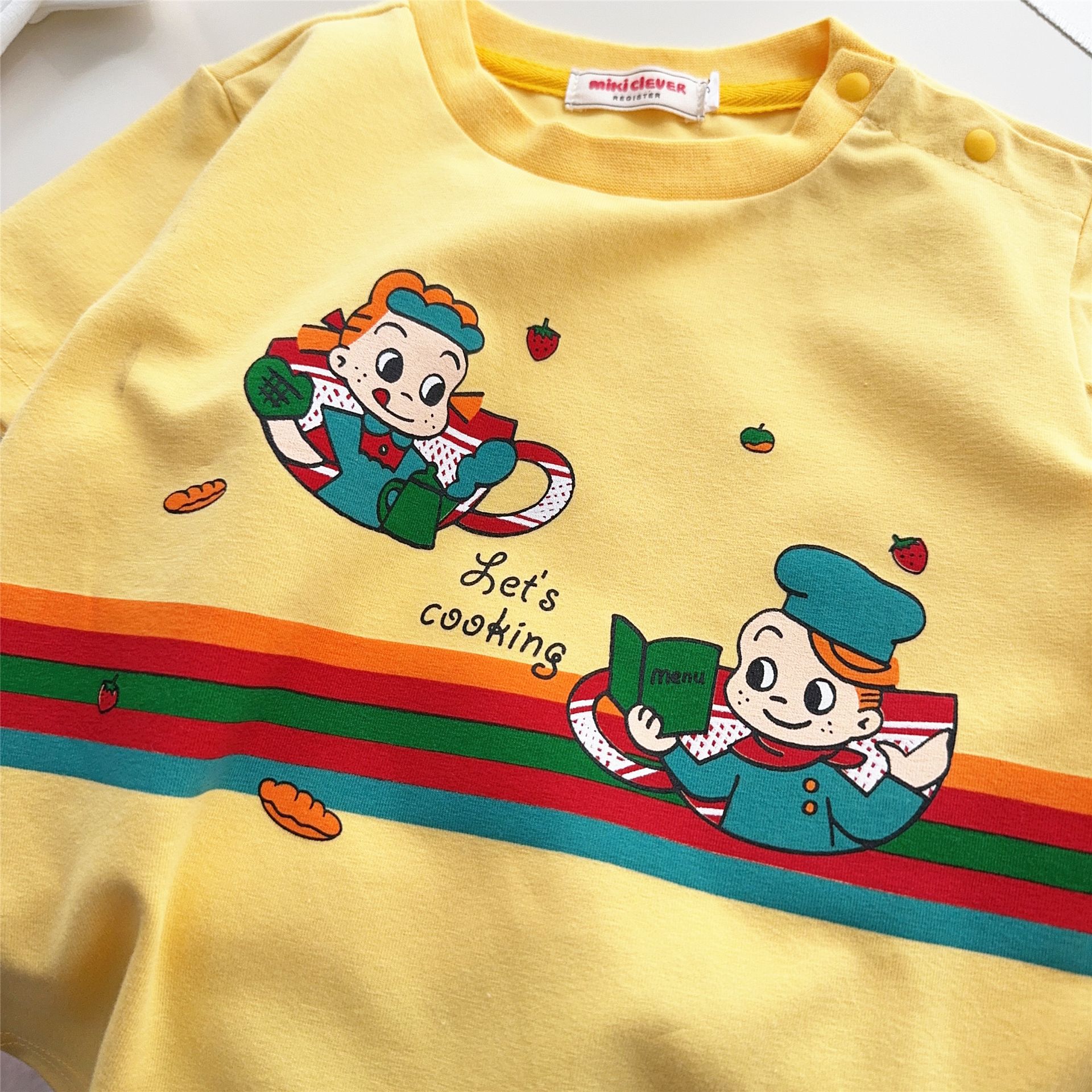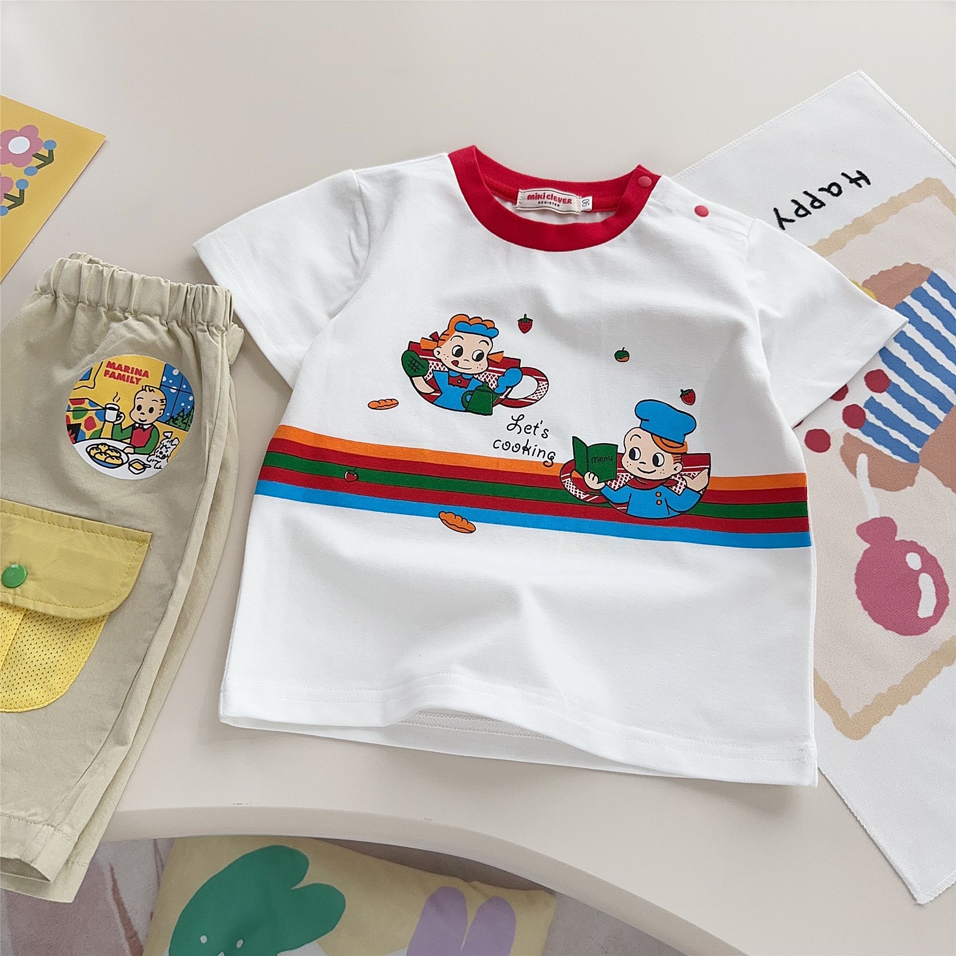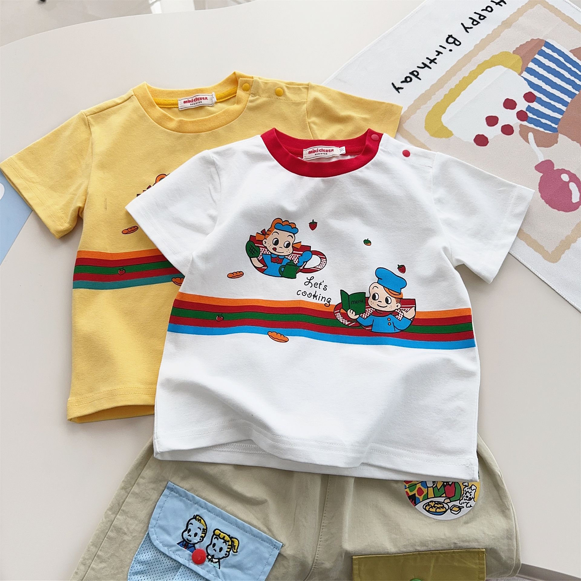 스팟 일본 아동복 25 여름 신작 소년 소녀 만화 요리 대회 반팔 티셔츠 탑 7015