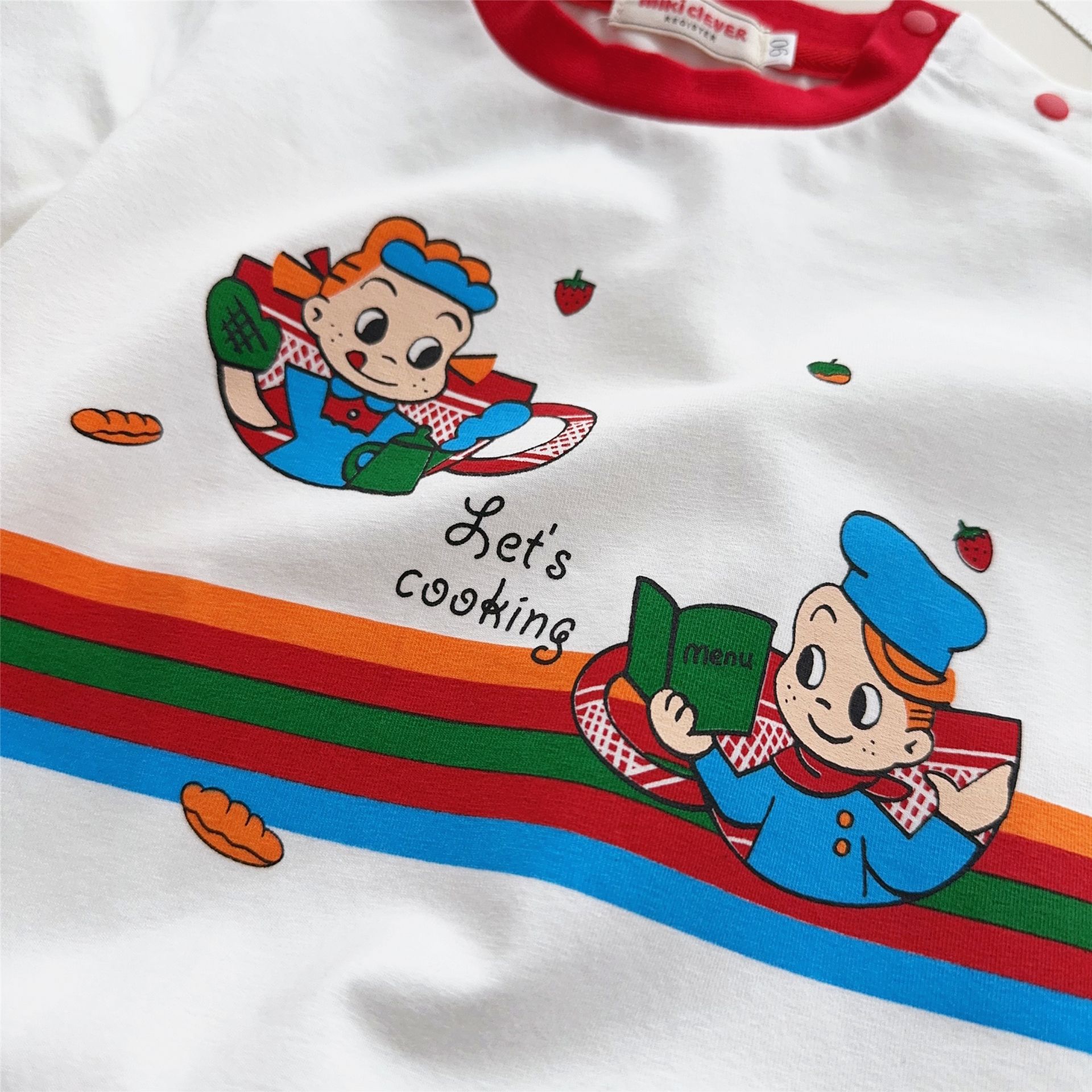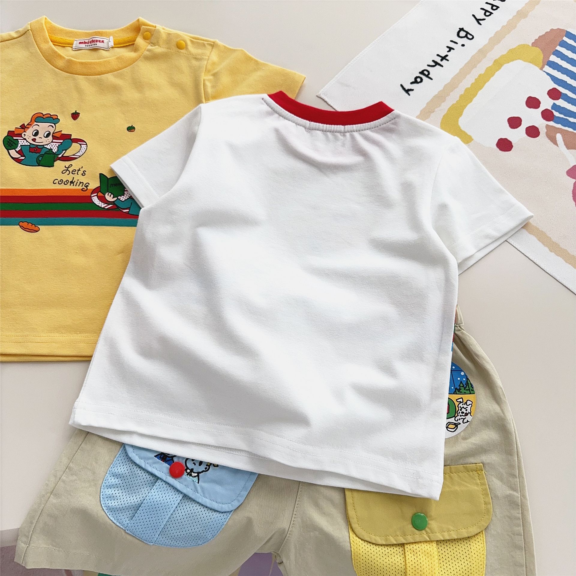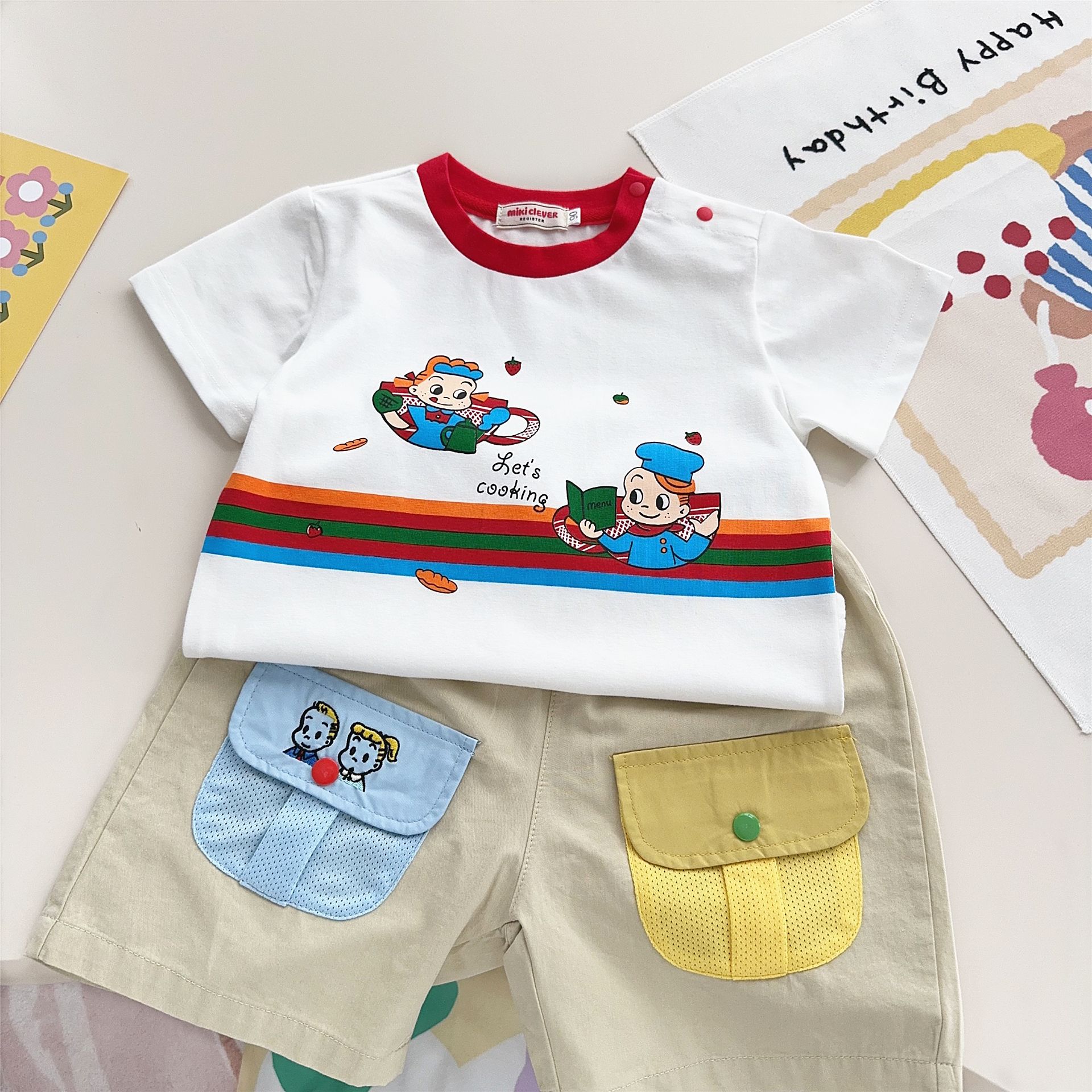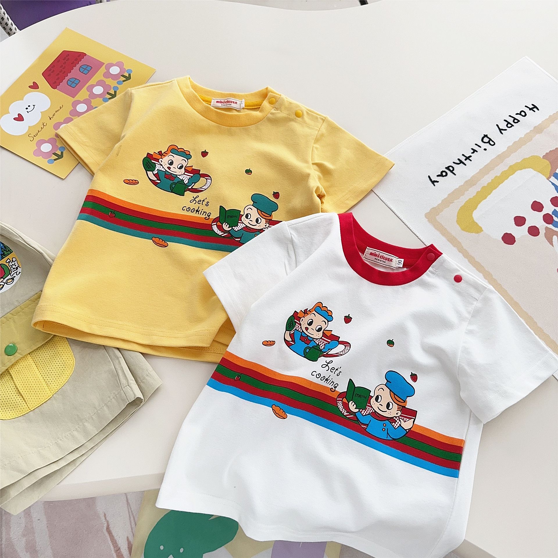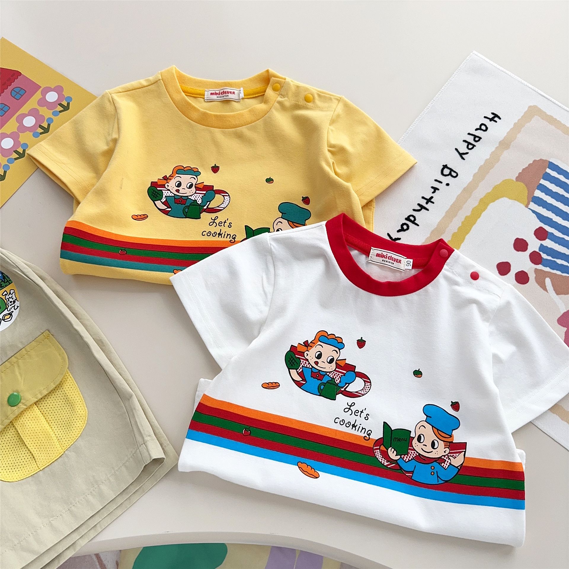 스팟 일본 아동복 25 여름 신작 소년 소녀 만화 요리 대회 반팔 티셔츠 탑 7015