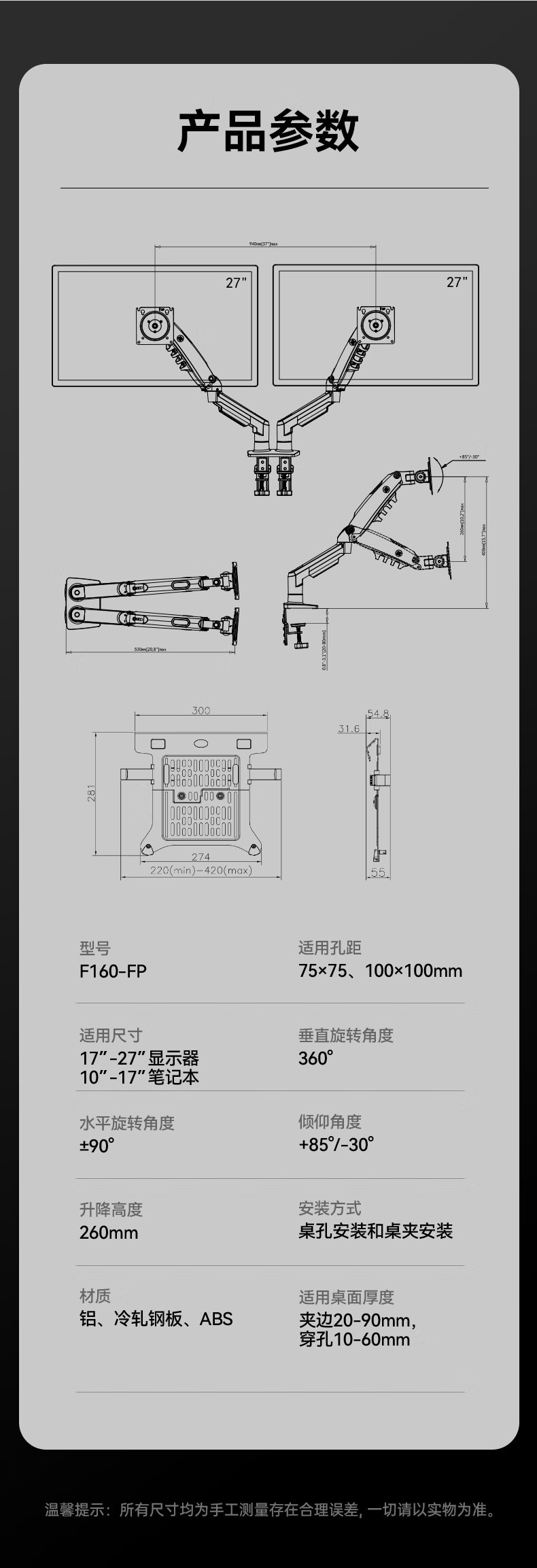 NB F160-FP 더블 스크린 노트북 캔틸레버 브래킷 더블 스크린 디스플레이 브래킷 1 조 2 건 블랙