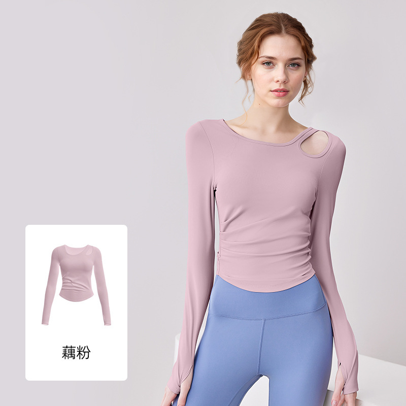 새로운 국경 경사 어깨 할로우 주름 긴팔 스포츠 탑 달리기 훈련 필라테스 여성용 슬림 피트니스 의류