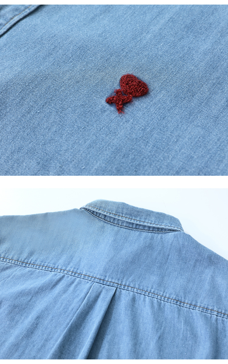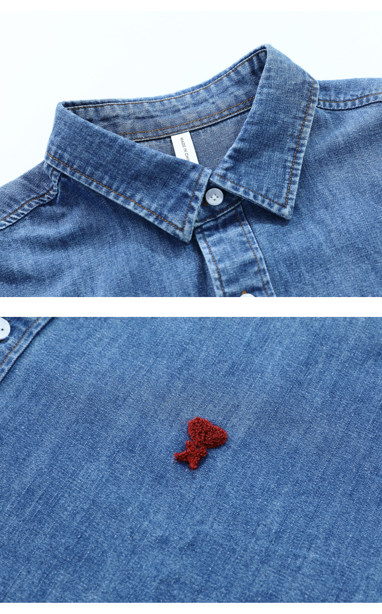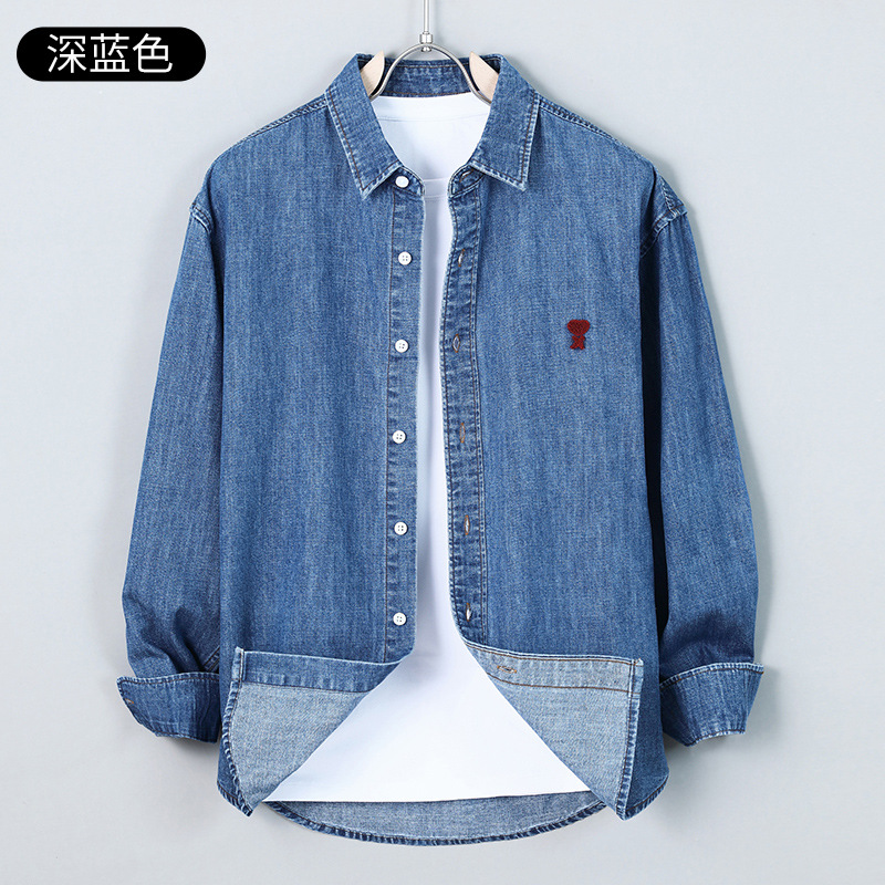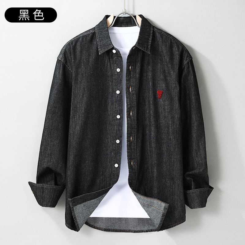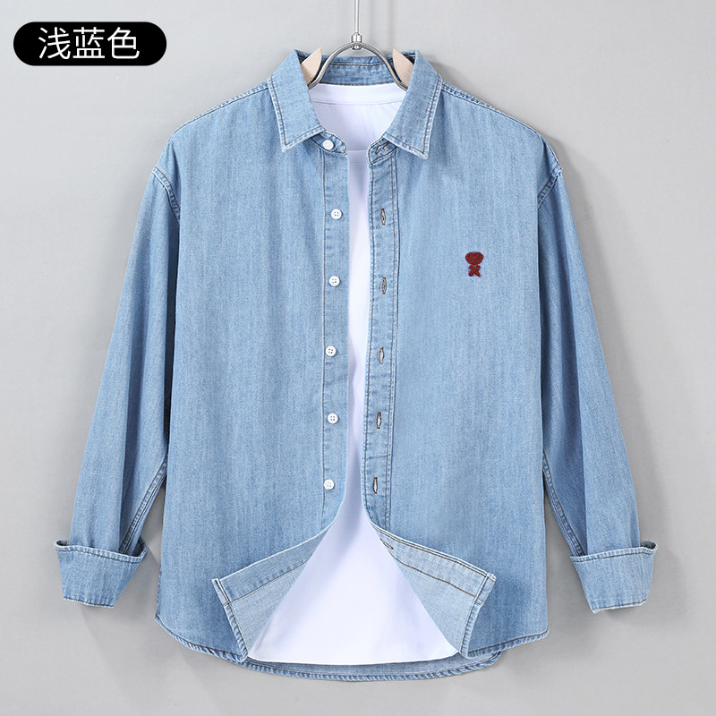 남자 봄과 가을 새 데님 긴팔 캐주얼 셔츠 간단한 자수 유행 루즈 올 매치 셔츠 8937
