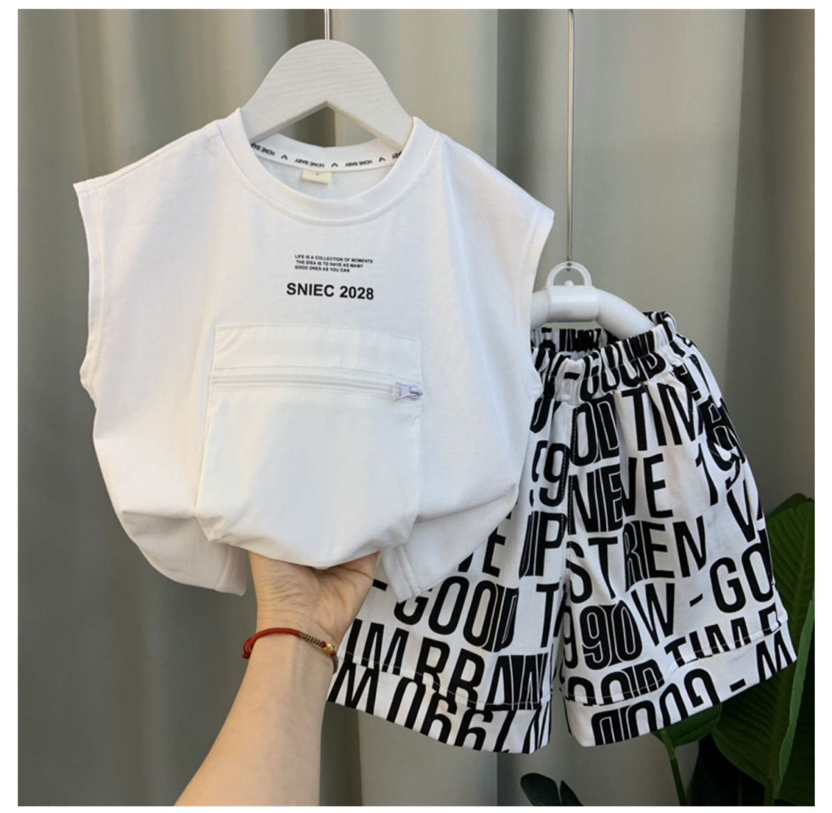 소년 여름 조끼 세트 2024 새로운 유행 아기 여름 민소매 옷 어린이 투피스 세트